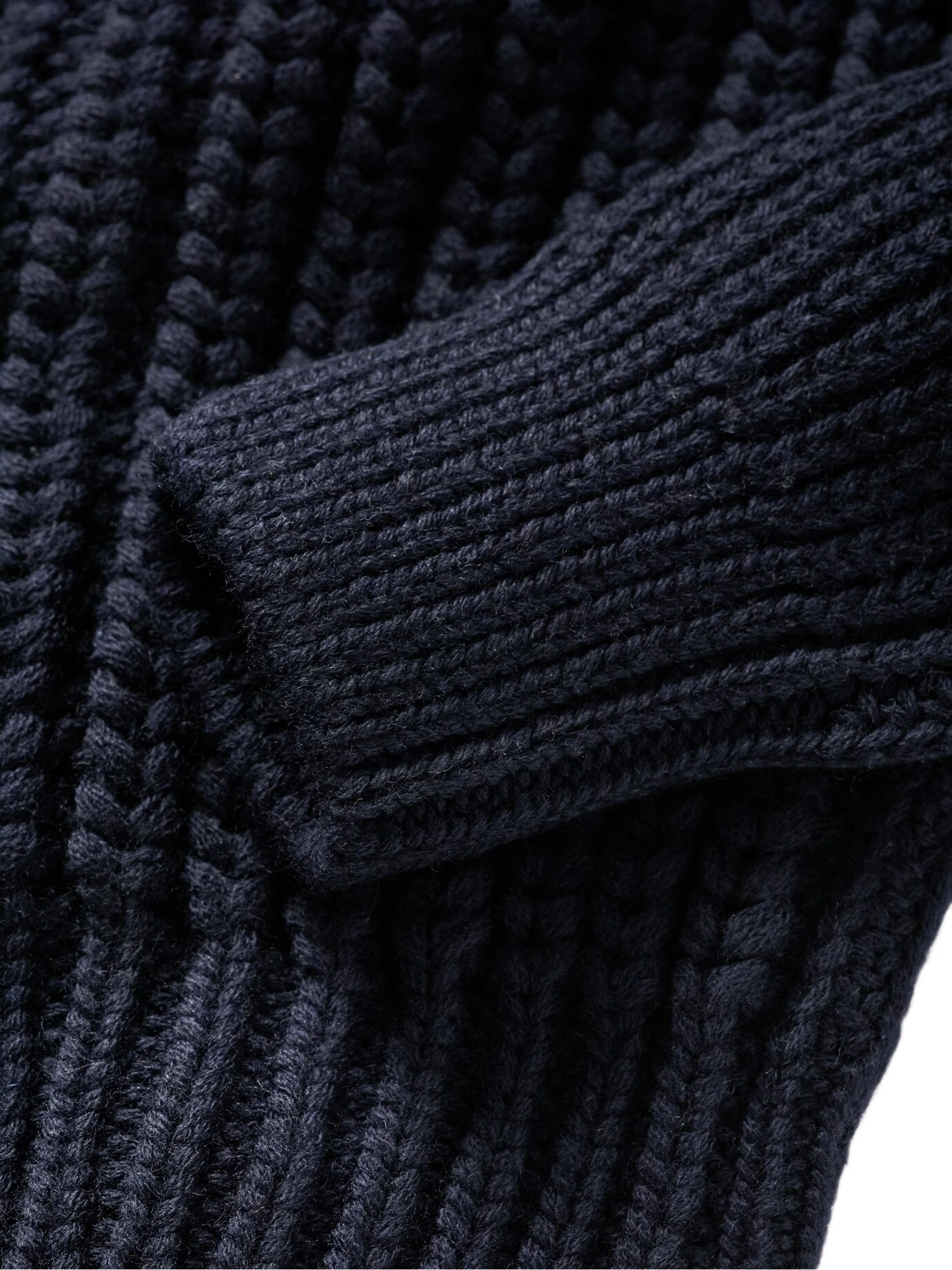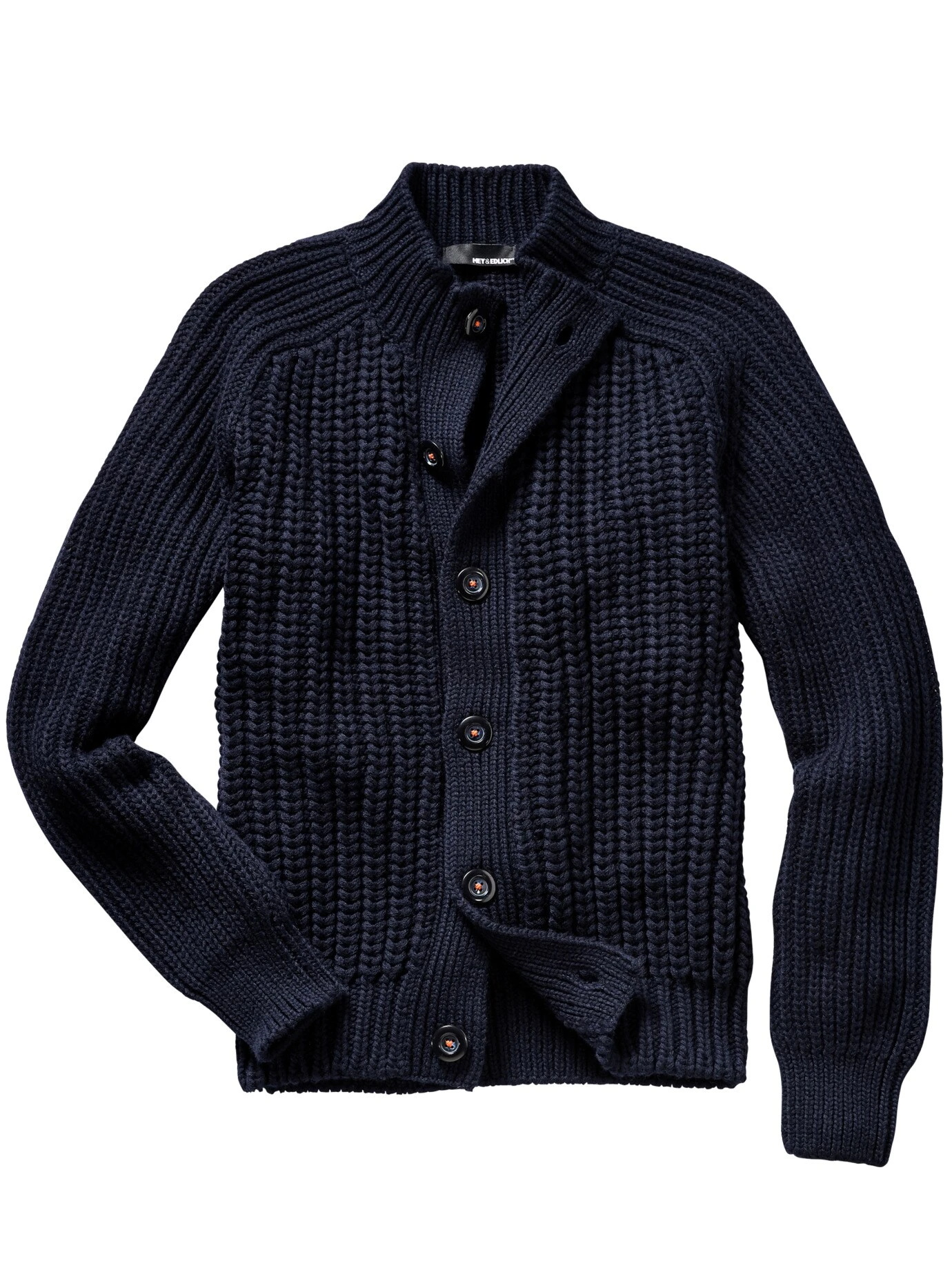 Einer, der schafft. In zugigen Räumlichkeiten wärmt er. Dafür sorgen seine fetten Drei-Gauge-Maschen (zum Vergleich: sieben ist üppig, 14 fein). Er ist eine wahre Materialschlacht aus Wolle. Der Cardigan isoliert Körperwärme, zieht weder Schmutz noch Staub an, widersteht selbst Flammen, ist nicht statisch und wenn Ihnen in Action mal warm werden sollte, nimmt er Feuchtigkeit auf, ohne danach zu riechen. Gehalten in einer Farbe, die zur gesamten Farbpalette passt. Ansonsten schlicht gearbeitet, mit Stehkragen und großen Knöpfen, die sich intuitiv greifen lassen.