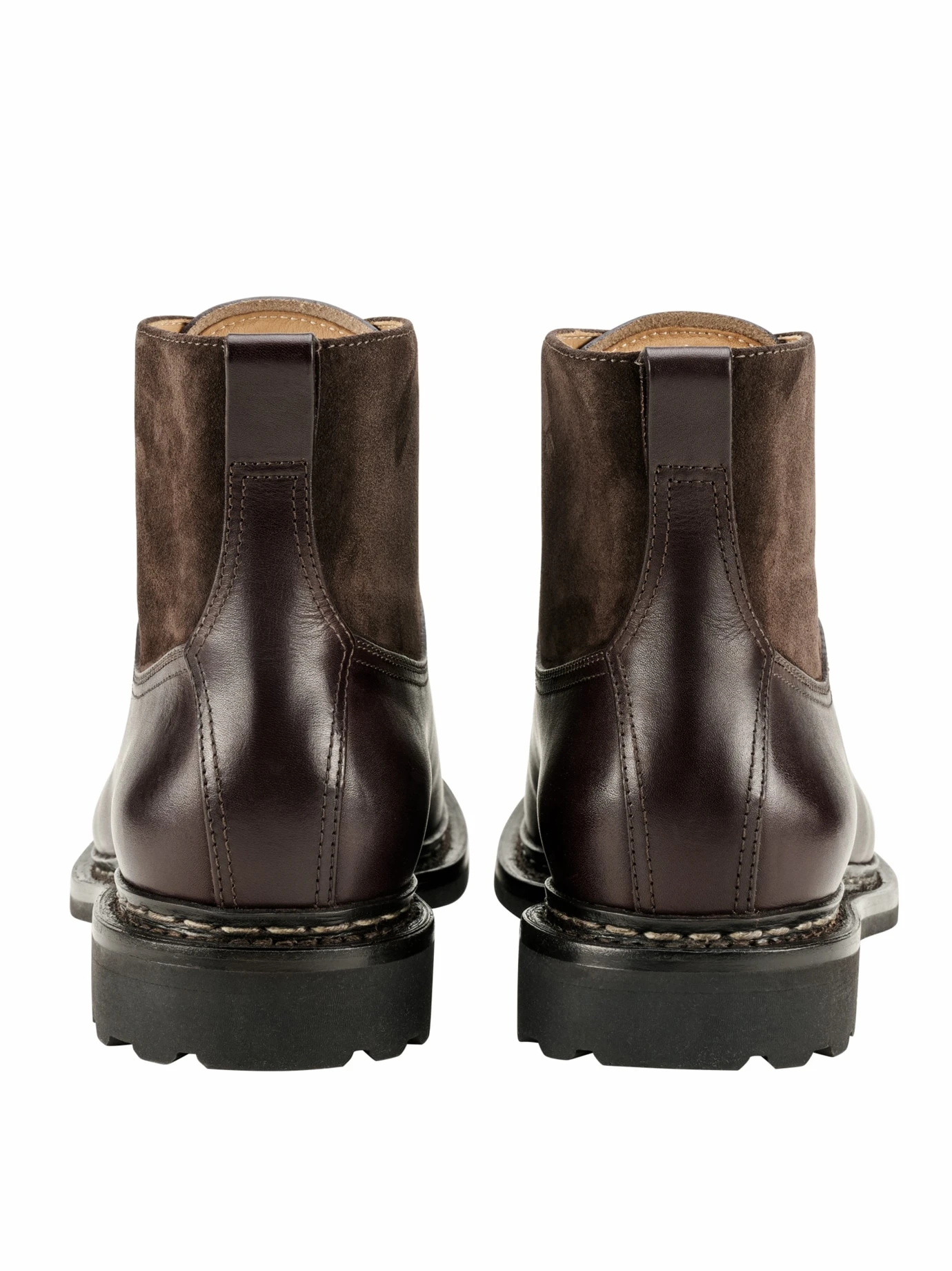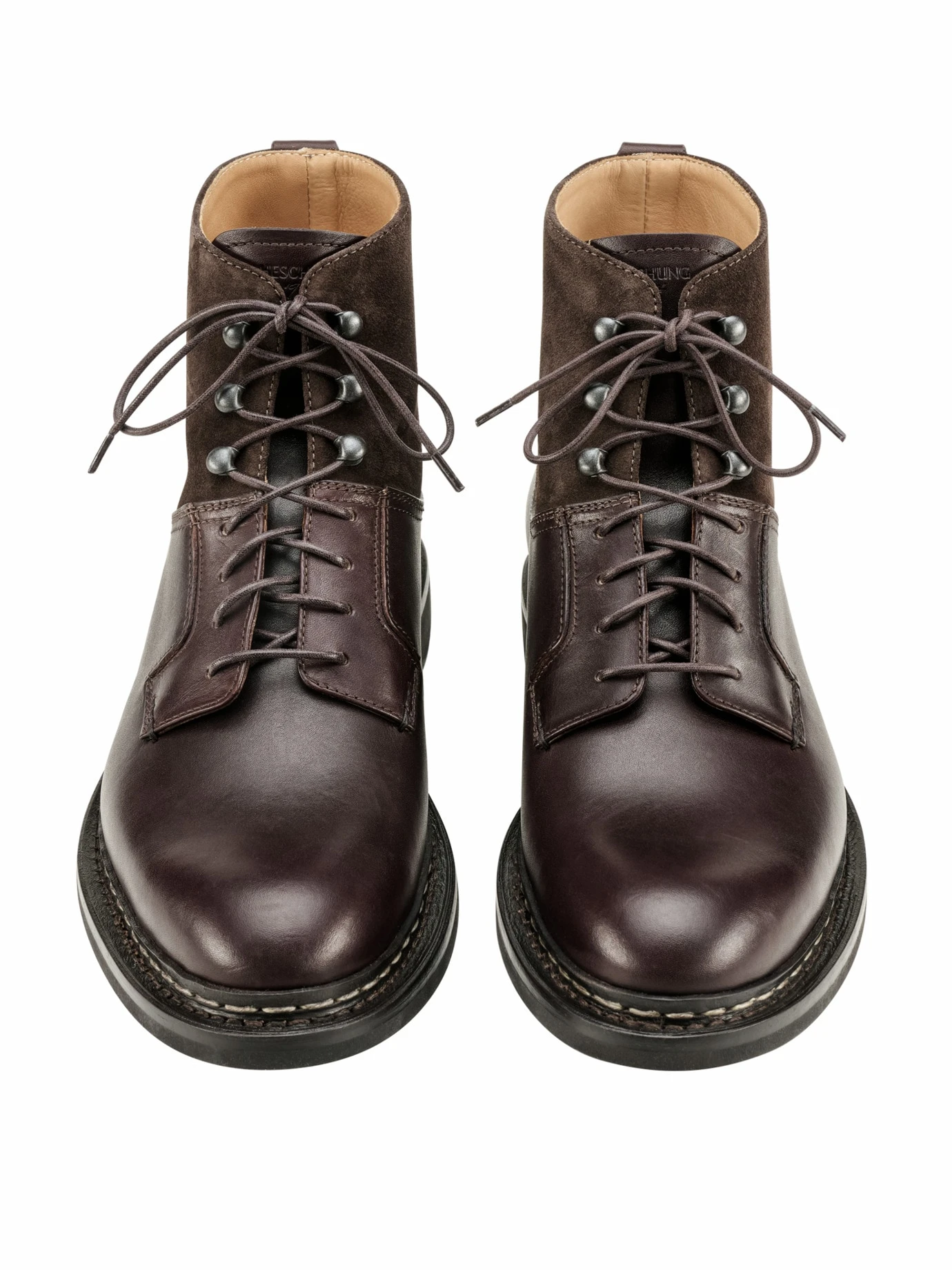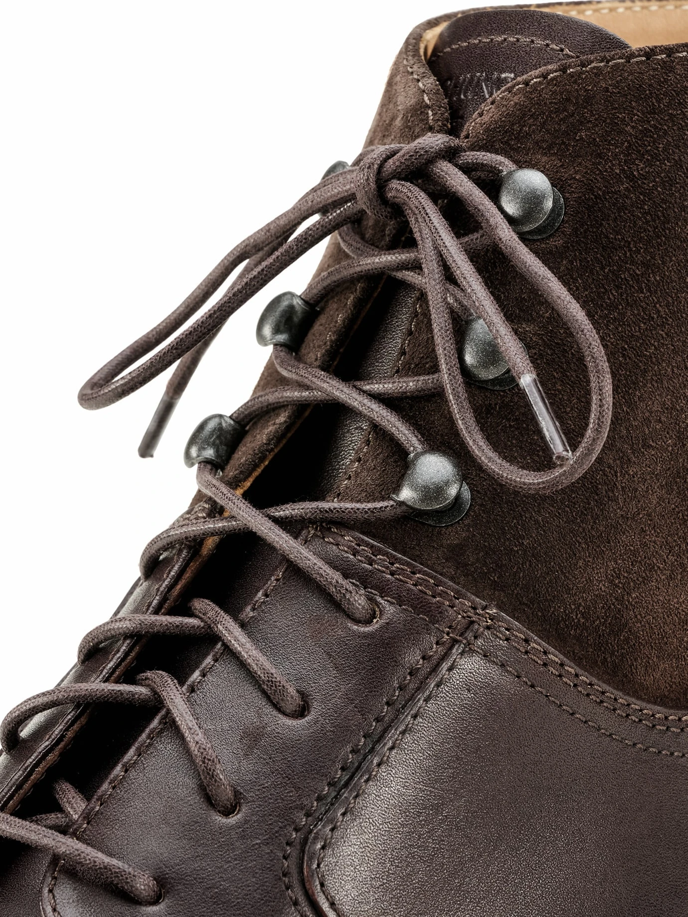 Mehr Handwerk am Fuß geht nicht. Der Schnürboot Cyprus stammt vom Leisten der französischen Werkstätten HESCHUNG, die seit 1934 das traditionelle Schuhmacher-Handwerk beherrschen, offizieller Lieferant des französischen Skiteams waren und bis heute die Reverse-Welt-Konstruktion anwenden. Eine rahmengenähte Machart, die Schuhe für ein ganzes Leben tauglich macht. Hier aus französischem Kalbleder, glatt und rau, Letzteres für die sportive Note.