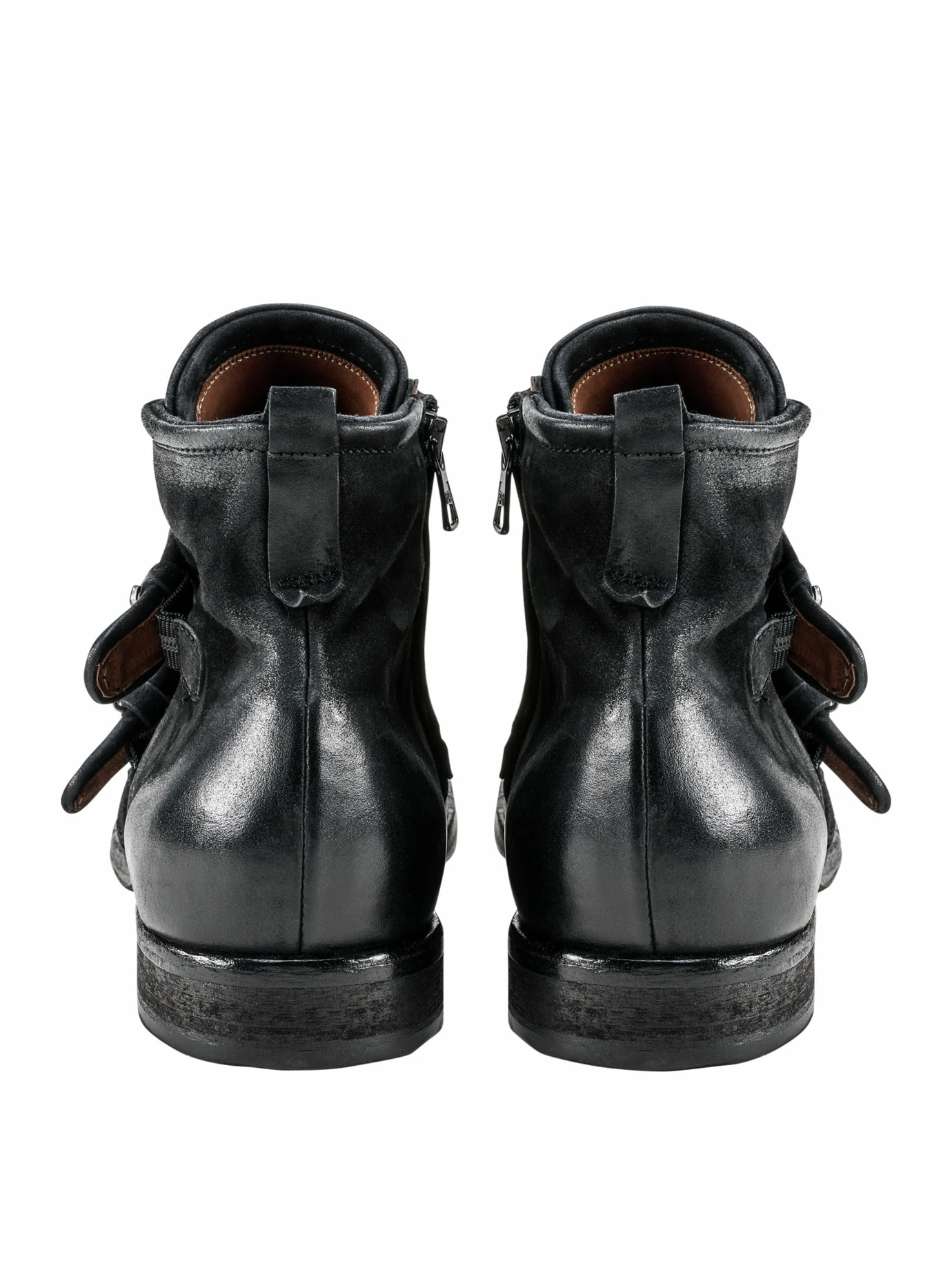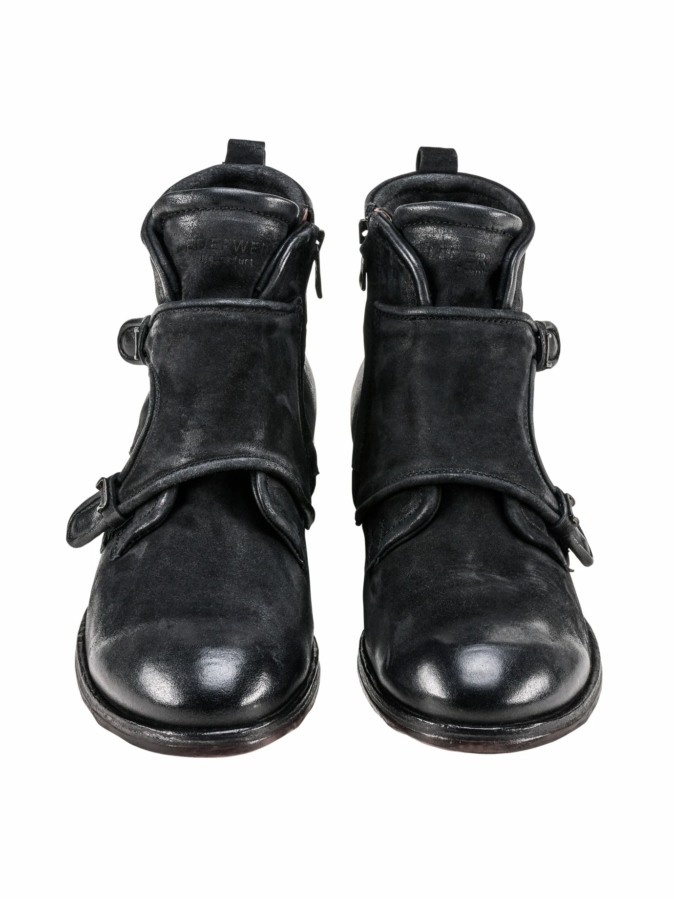 Patina als Stilelement. In Norditalien wird das robuste Rindleder so lange angeschliffen, bis es Charakter trägt. Extravaganz trägt der Boot dann durch die doppelte Verschlussschnalle, die an den Monk erinnert. Ist allerdings nur Tarnung, Sie gelangen bequem per seitlichem Zipper hinein. Außen derb, innen gefällig: Sie werden ihn immer öfter tragen, weil das Kalblederfutter für Ihre Füße eine Wohltat ist und im Gegensatz zu Schweinelederfutter nicht müffelt.