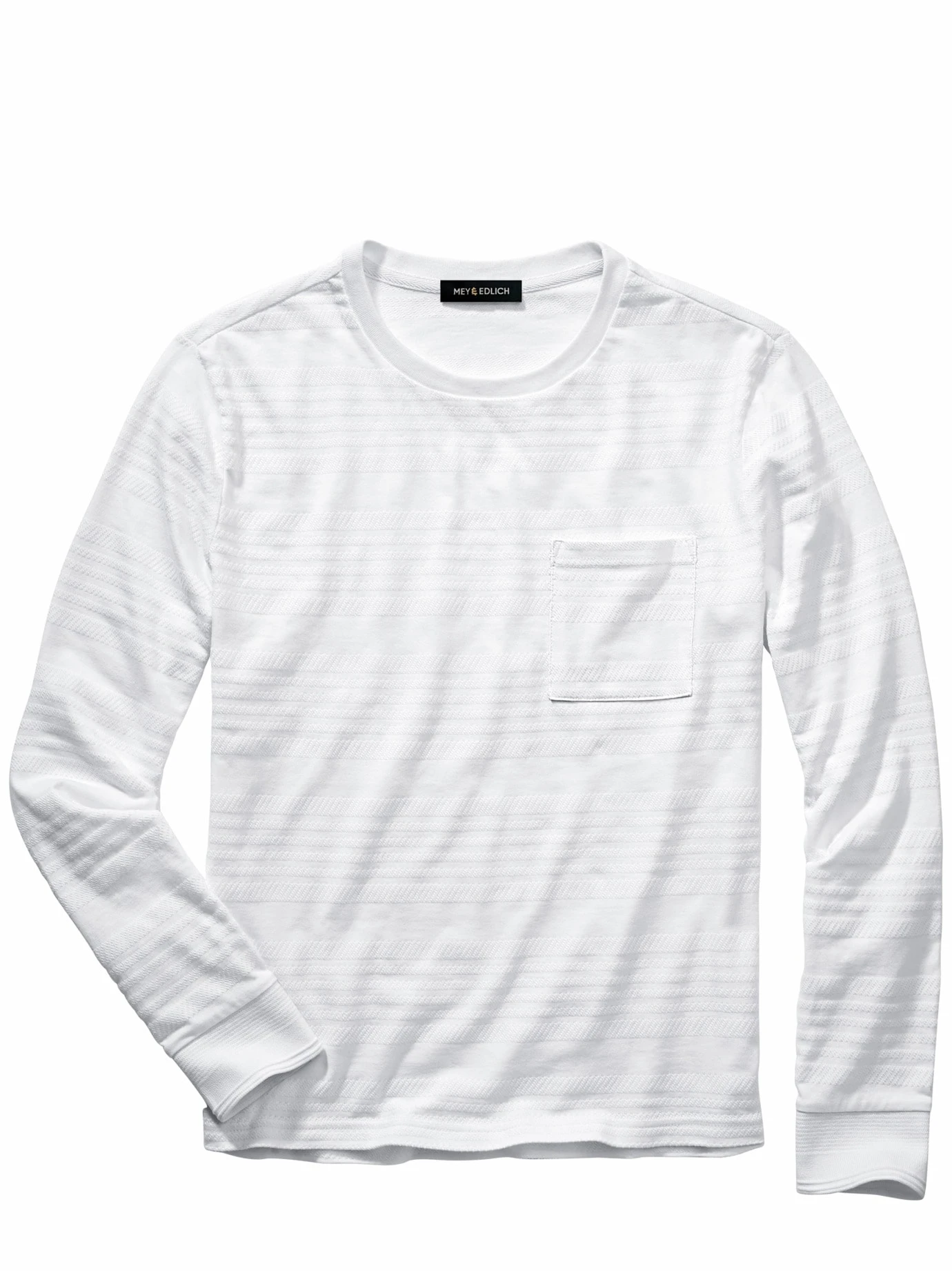 Weiß. Damit nichts von der Qualität ablenkt. Sein unnormal solider Stoff ist es, der dieses Shirt von anderen unterscheidet. Die feinen horizontalen Streifen entstehen als aufwendiges Jacquard-Muster und verleihen dem Shirt plastische Präsenz. Passt zu fast allem. Unterstützt das Saubermann-Image (falls es gebraucht wird). Spannende Option: Outfit in Schwarz-Weiß.