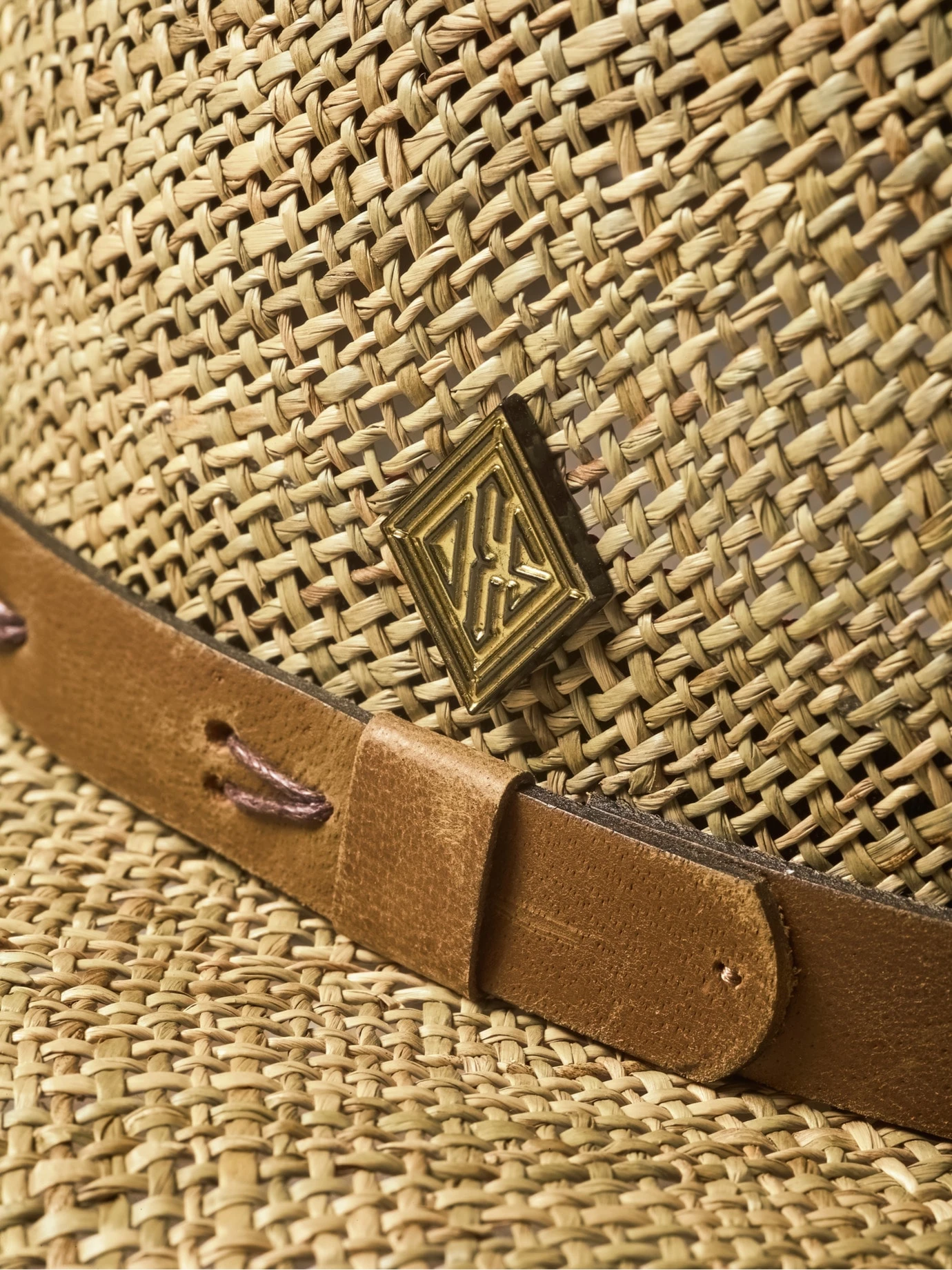 Zwischen den 1920ern und 1940ern tummelt er sich in der Unterwelt Chicagos und mischt später den amerikanischen „Film noir“ auf. Heute ist er modisch zurück, Diefenthal flicht ihn für den Sommer aus Burma-Stroh: sehr leicht und angenehm, schützt vor Sonne und sieht vor allem gut aus. Steht ausnahmslos jeder Kopfform. Die Garnitur ist stilecht aus amerikanischem Rindleder und ein schöner Kontrast zum ansonsten naturfarbenen Hut.