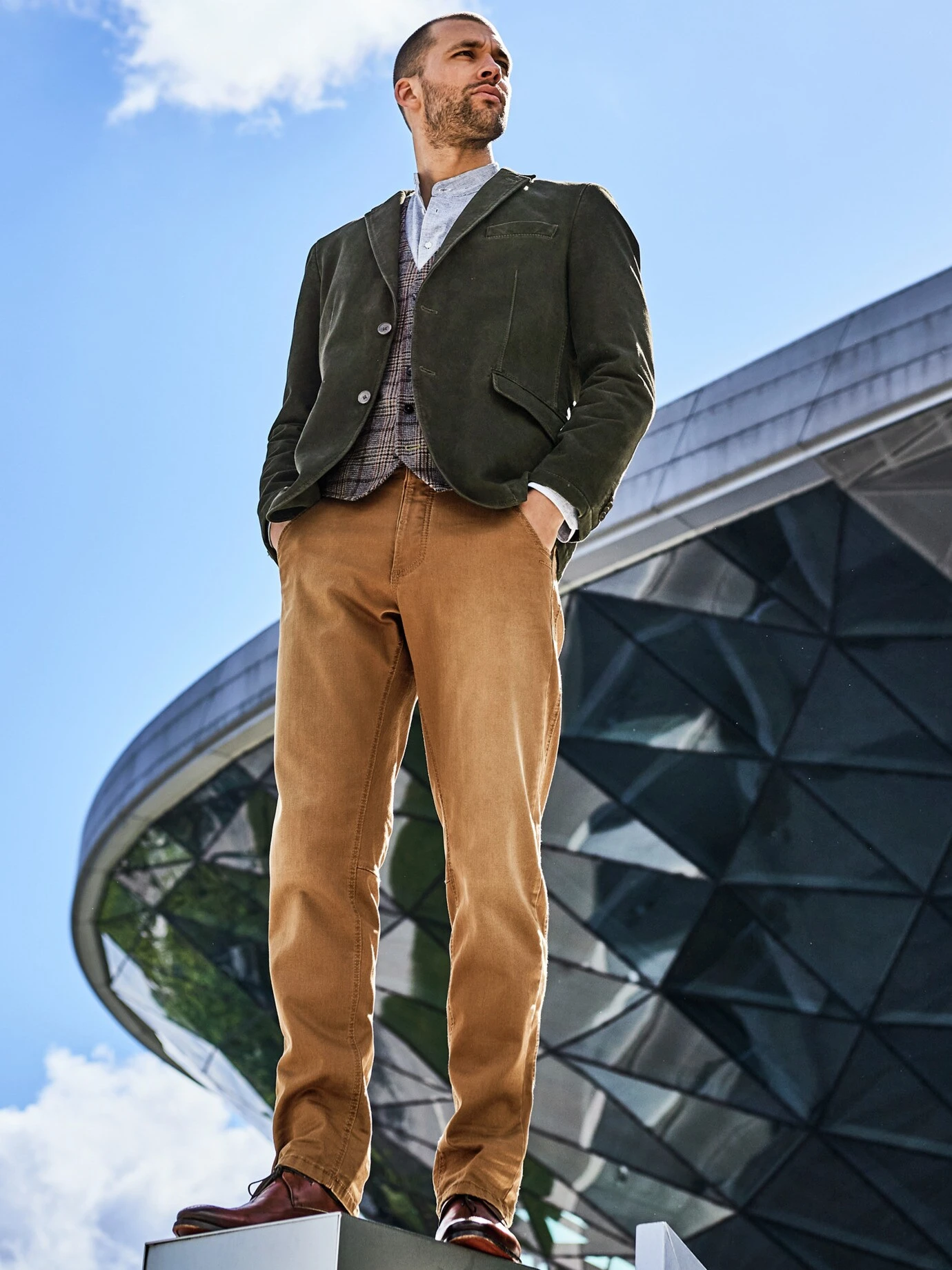 Dieses Sakko hat Zukunft. Auch in Deutschland. Sein Stoff stammt dafür aus einer kleinen Produktionsstätte aus dem Kreis Wesel. Vom Spinnen übers Weben bis zum Veredeln passiert hier noch alles vor Ort. Im Ergebnis ein robuster Baumwoll-Twill, der ähnlich viel aushält wie eine Jeans, aber deutlich gefälliger anliegt und in jede Richtung dehnbar ist. Denen gewidmet, die umdenken. Die nur bei wichtigen Terminen unterm Sakko Hemd tragen und ansonsten ein buntes Shirt bevorzugen. Baukasten-Prinzip: Das Sakko können Sie einzeln tragen oder mit gleichnamiger Hose (Nr. 24-6972-4) als Anzug.