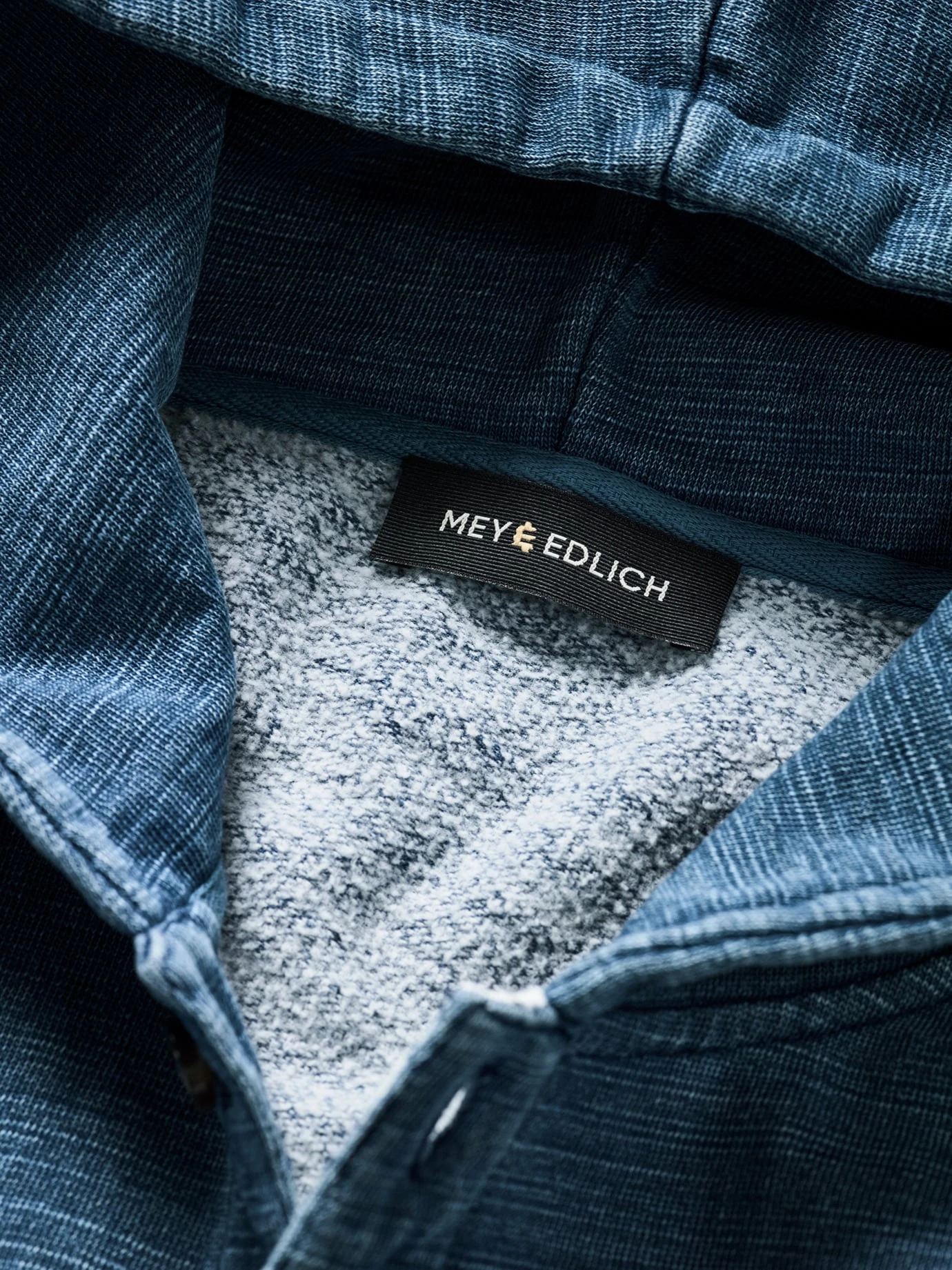 Überziehen. Entspannt sein. Die Farbe ist fleckig-scheckig, sie lebt mit, hinterfragt nicht, sondern verblasst mit dem Erlebten leicht, dank der Indigofärbung. Die Knöpfe erinnern an ein sportliches Henley, wenn Sie die Knopfleiste öffnen, trägt die Kapuze ein gutes Gegengewicht und es entsteht ein Wohlfühlabstand zum Hals. Einmal angezogen verspricht er ein gutes Gefühl auf der Haut, gefertigt aus einem Baumwoll-Hightech-Garn, so trägt er sich schön leicht.