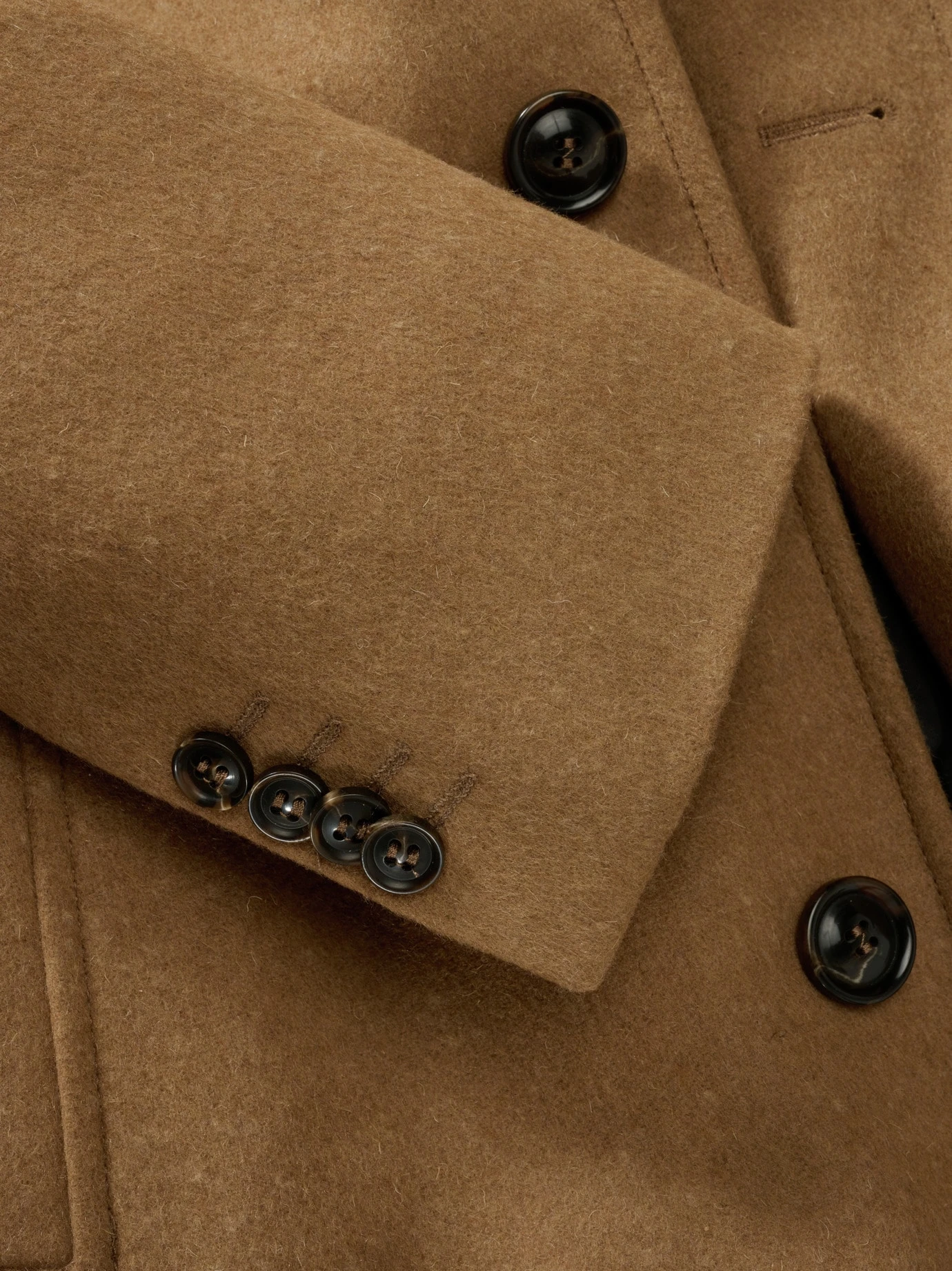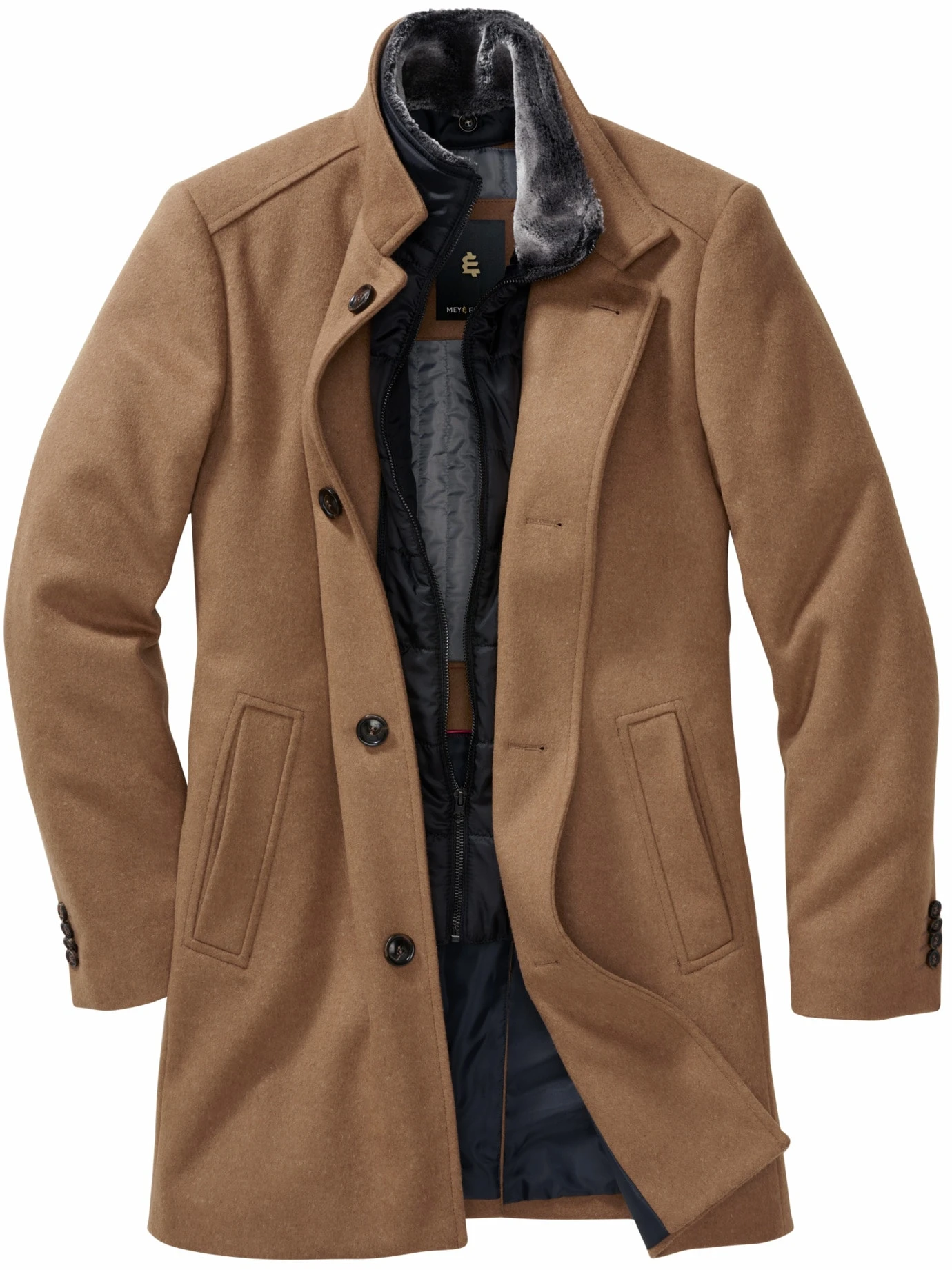 Wenn Luxus eine Farbe trägt. Er basiert auf dem kamelfarbenen Mantel, wie ihn in den 1980ern die Mode forciert. Seine Länge, die knapp übers Knie reicht (Rückenlänge: 89 cm), der große Kragen und die breite Schulterpartie sind geblieben. Dieser Mantel ist heute besser. Er ist gearbeitet aus italienischem Wollstoff, mit einem Anteil technischer Fasern, die Pilling vorbeugen. Dadurch sieht er selbst nach Jahren gut aus, bleibt fest und isolierend. Darüber hinaus trägt er einen herausnehmbaren Westeneinsatz (als Schalersatz), sein (Kunst-)Fell wärmt den Hals. Noch immer zum Anzug, ansonsten schön zur Chino oder Jeans.