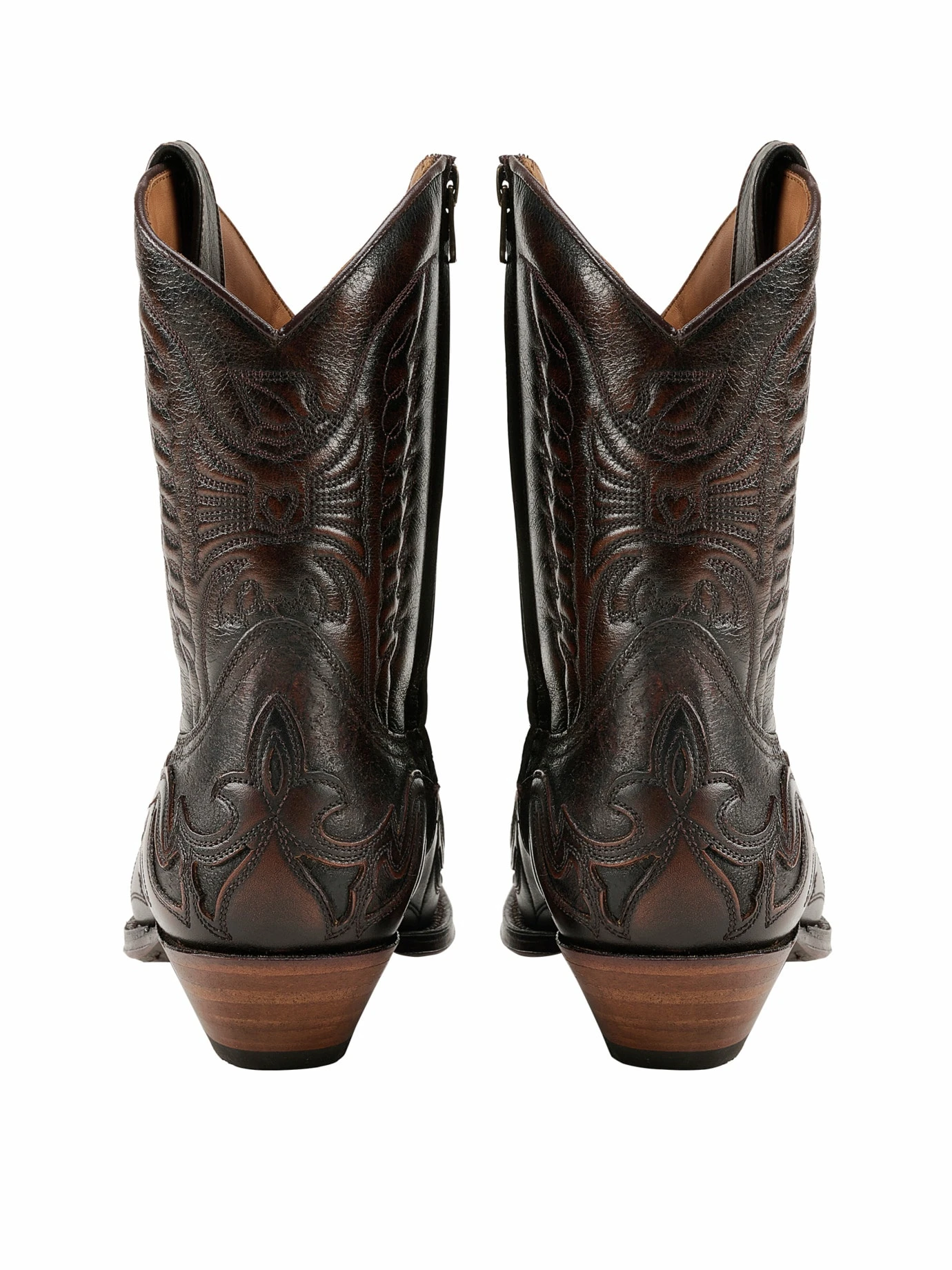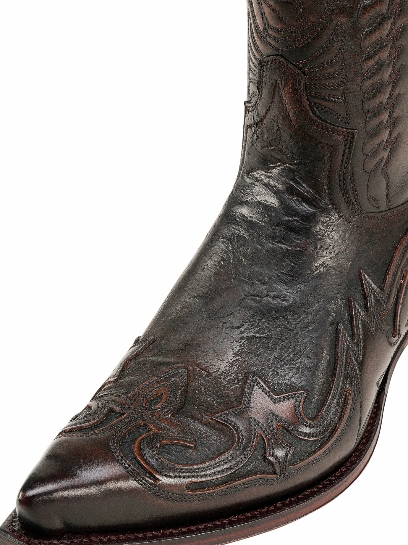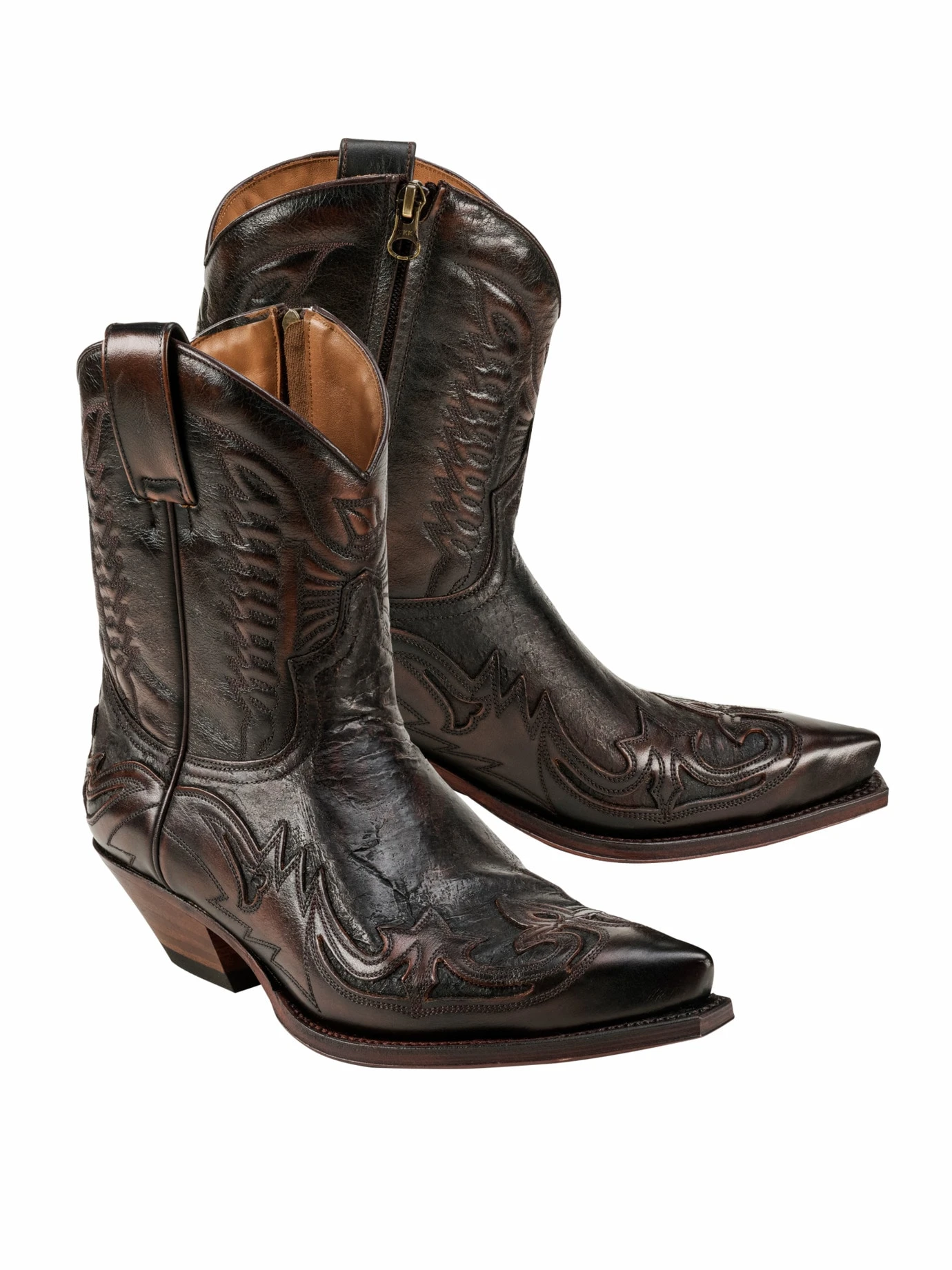 Handgefertigt. Rahmengenäht. Er zählt zu den neuesten Westernstiefeln aus dem Hause Sendra®. Vorne spitz, hinten schräg, mit Reißverschluss zum Reinschlüpfen. Verarbeitet so, wie Sie es von einem Stiefel, der für Generationen gemacht ist, gewohnt sein dürfen. Die Lederbrandsohle liegt auf einer weichen Korkfüllung, damit sich Ihr individuelles Fußbett bildet. Gefüttert mit Rindleder, das für eine optimale Lüftung sorgt. Die Rindleder stammen aus spanischen Gerbereien und tragen Patinaoptik.