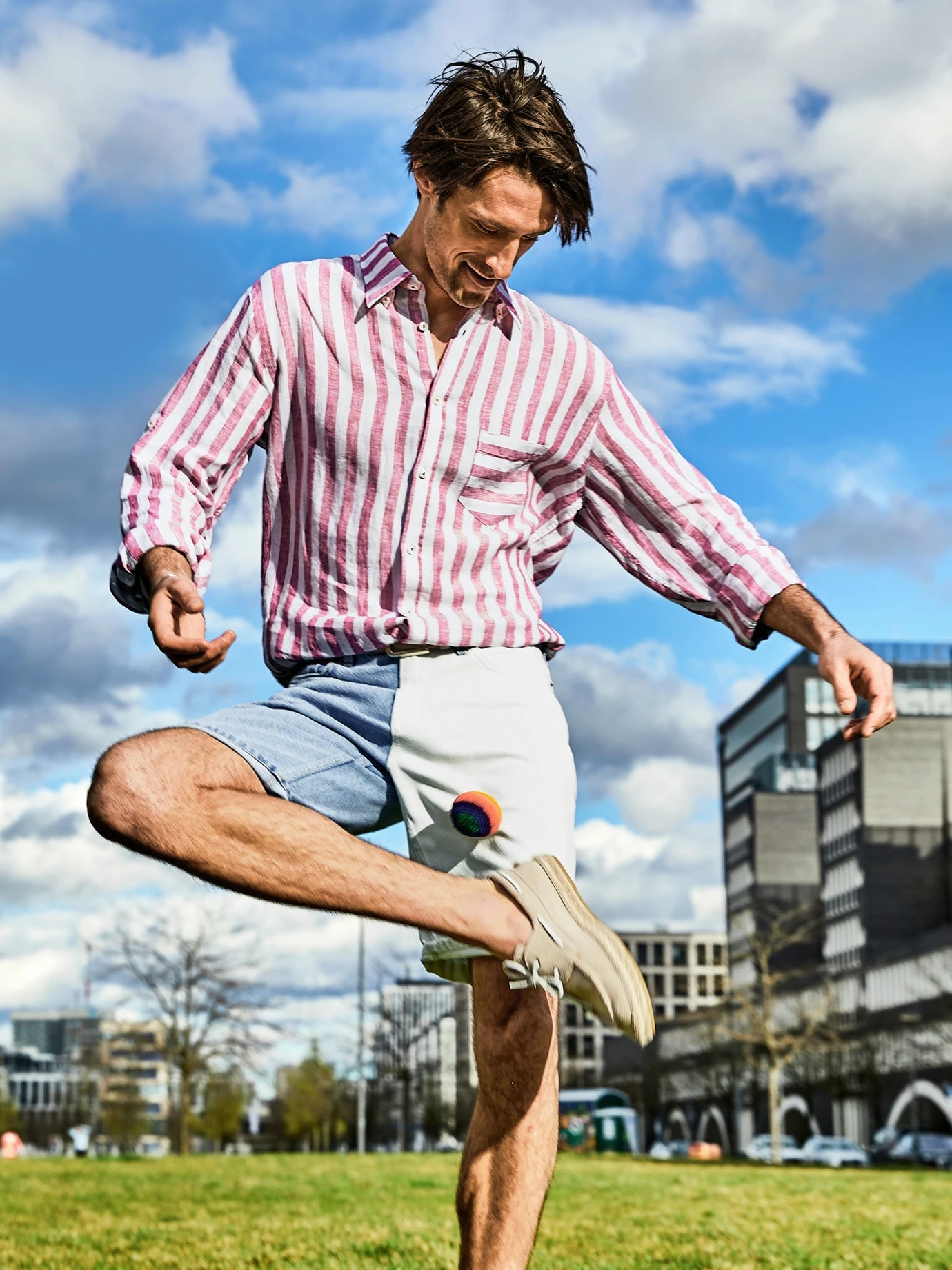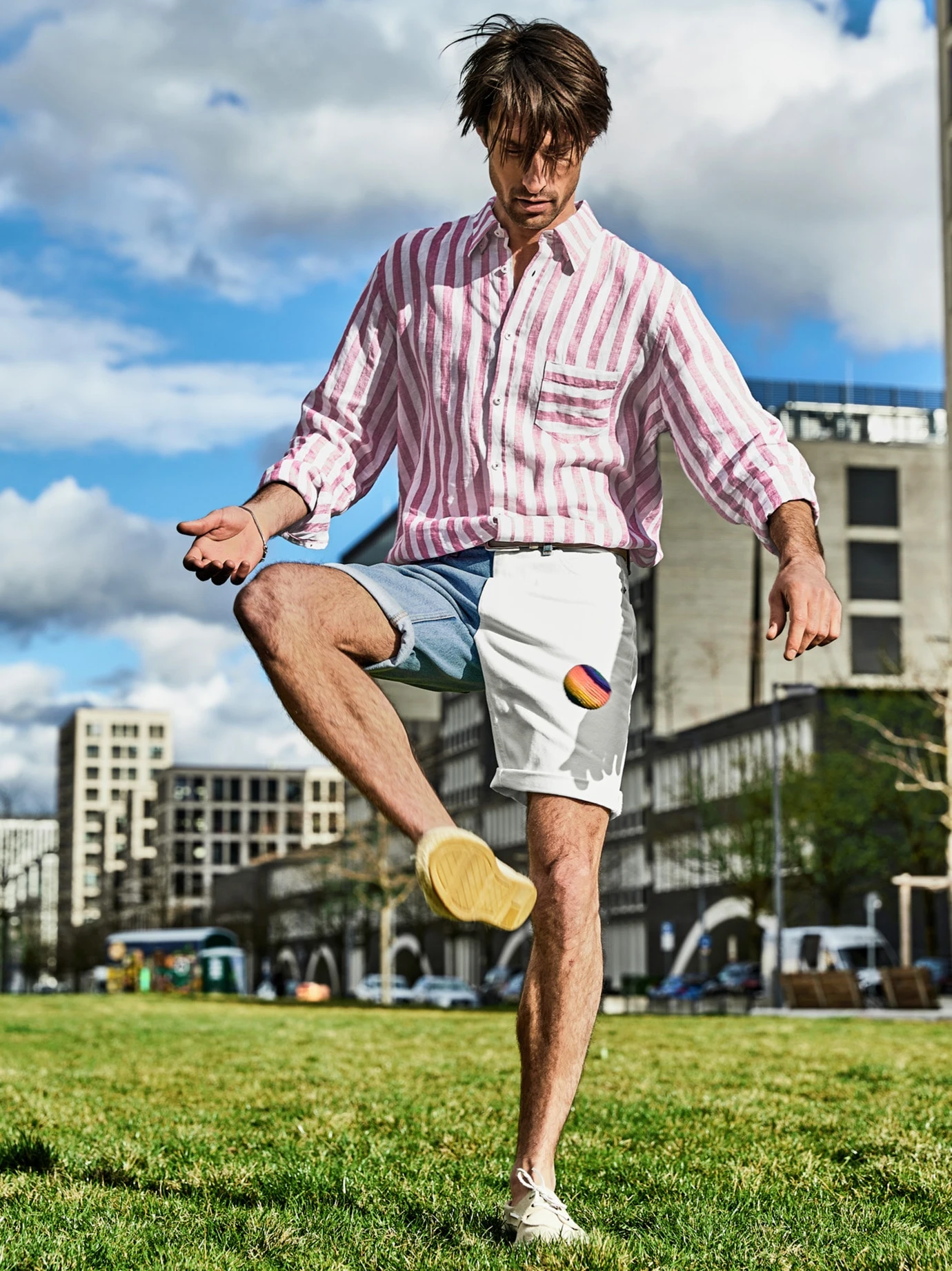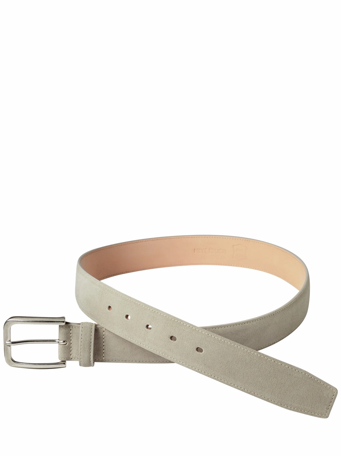 Solide Arbeit. Das Rauleder dieses Manufakturgürtels passt sich durch den leicht bogenförmigen „bombierten“ Querschnitt perfekt an die Körperform an. Der lichte Grauton geht gut zu hellen Sneakern.