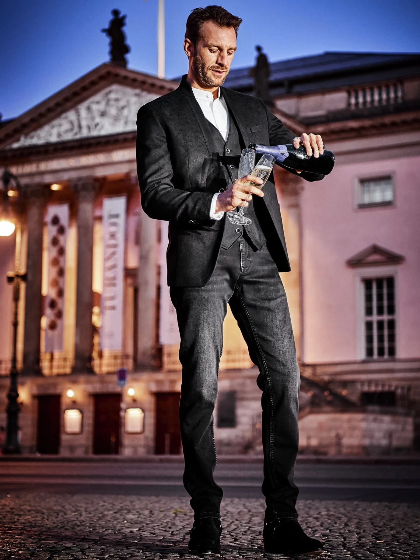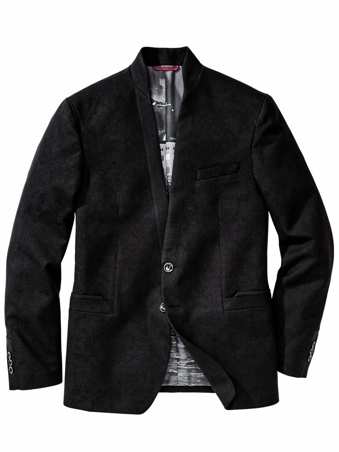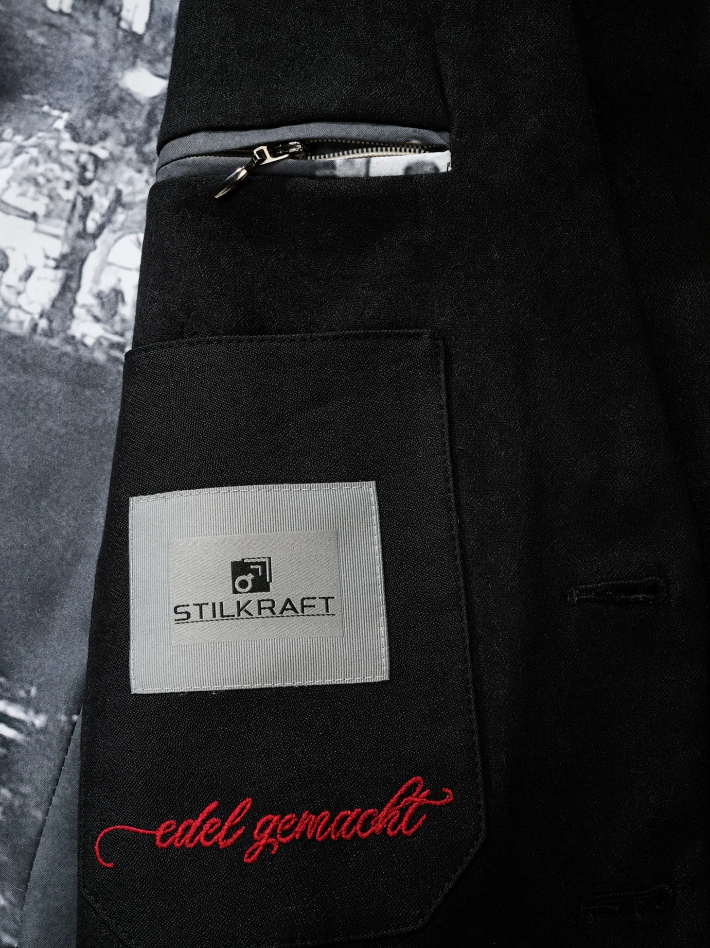 Extravagant im Auftritt. STILKRAFT interpretiert das Smokingsakko neu. Das exklusive Jacquardgewebe im verhaltenen Fantasie-Dessin wird Öko-Tex-zertifiziert in Österreich auf Seidenwebmaschinen gefertigt. Dabei erzeugt die feine Baumwolle in Kombination mit Seide einen eleganten Matt-Glanz-Effekt, der besonders wirkt im Scheinwerferlicht. Der Kontrasteinsatz an der vorderen Kante und der Stehkragen aus Uni-Stoff sorgen für eine optische Anlehnung an den bekannten Schalkragen. Ansonsten im zeitlosen STILKRAFT-Look. Das Futter ist zusätzlich bedruckt mit der Salzburger Skyline.