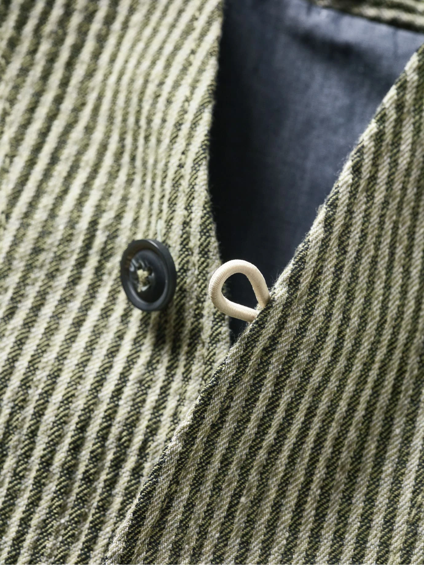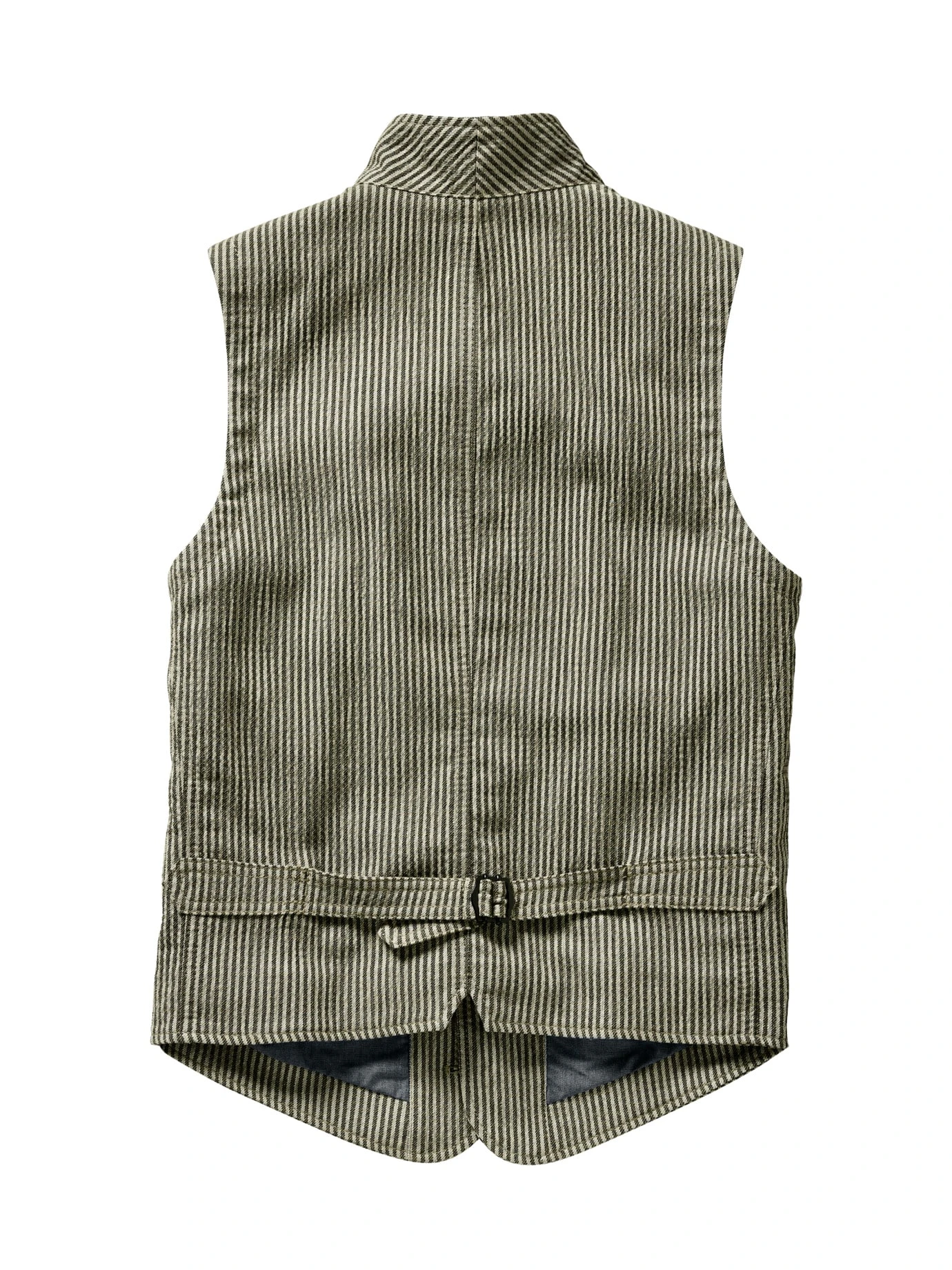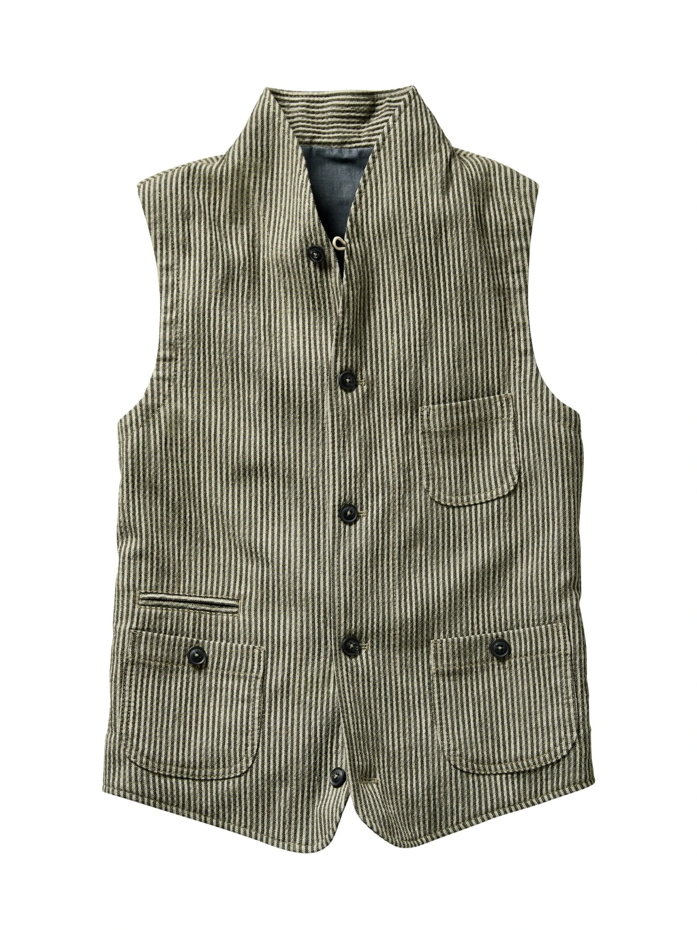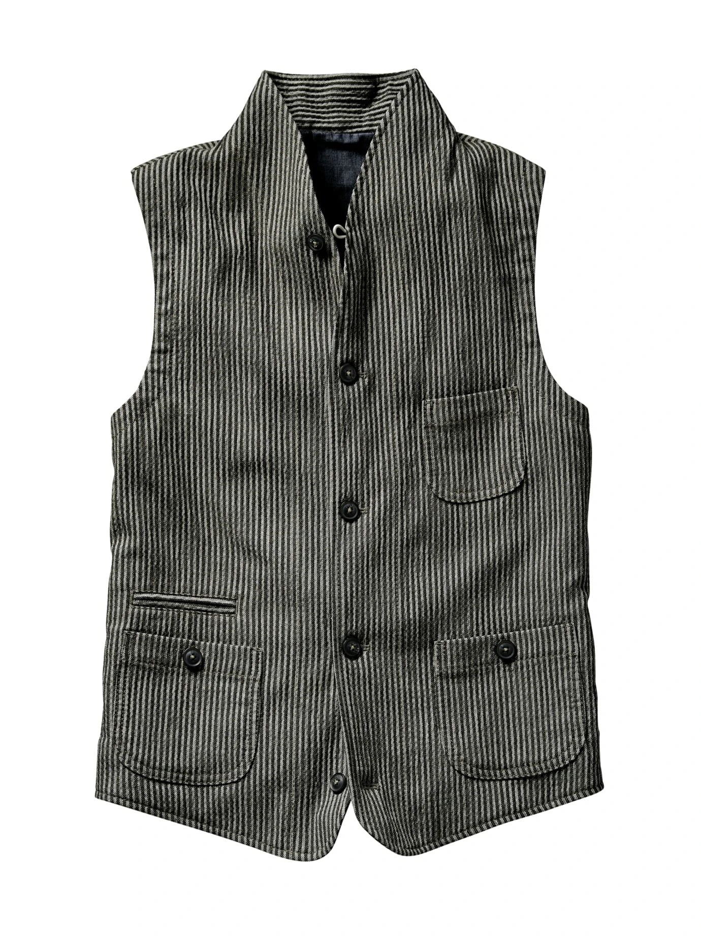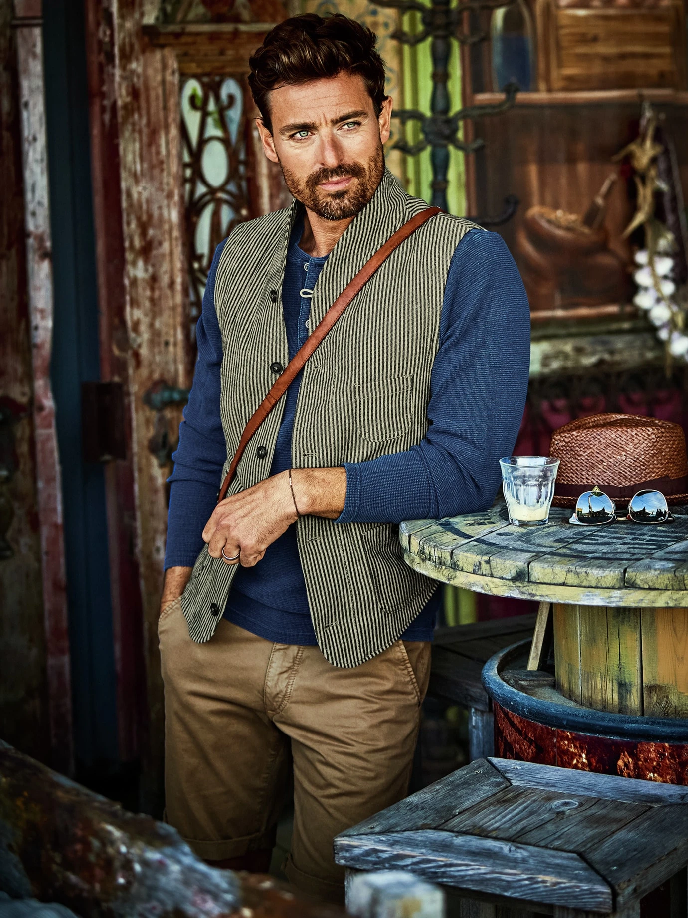 Zugeknöpft ist nur die Weste. Darin steckt einer, der am liebsten ungewohntes Terrain in Jeans oder Cargo betritt. Ihre Besonderheit liegt im Schalkragen: cool entweder hochgestellt (dafür zuknöpfen), lässig mit oberstem Knopf geöffnet (so blitzt das Shirt auf) oder nonchalant die Weste komplett offen tragen (der ideale Sommerjackenersatz). Welche Aktion Sie vorgeben, der italienische Stoff wird nachgeben. Trägt sich leicht und dank der guten Taschenanzahl auch die Tools für Abenteuer am Körper.