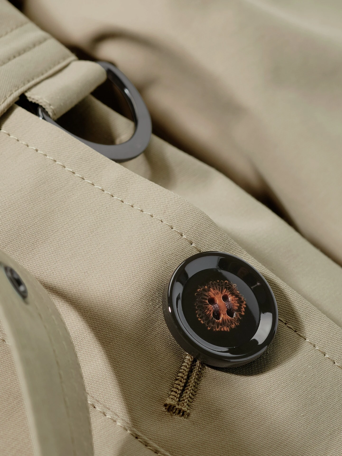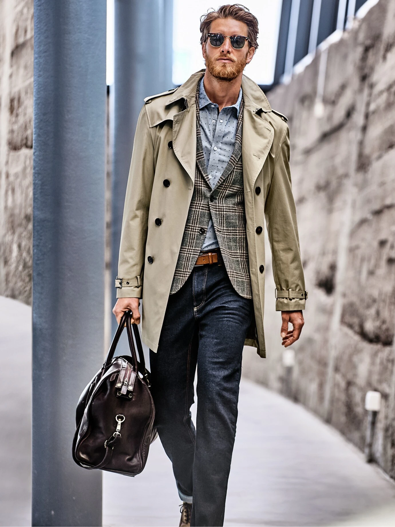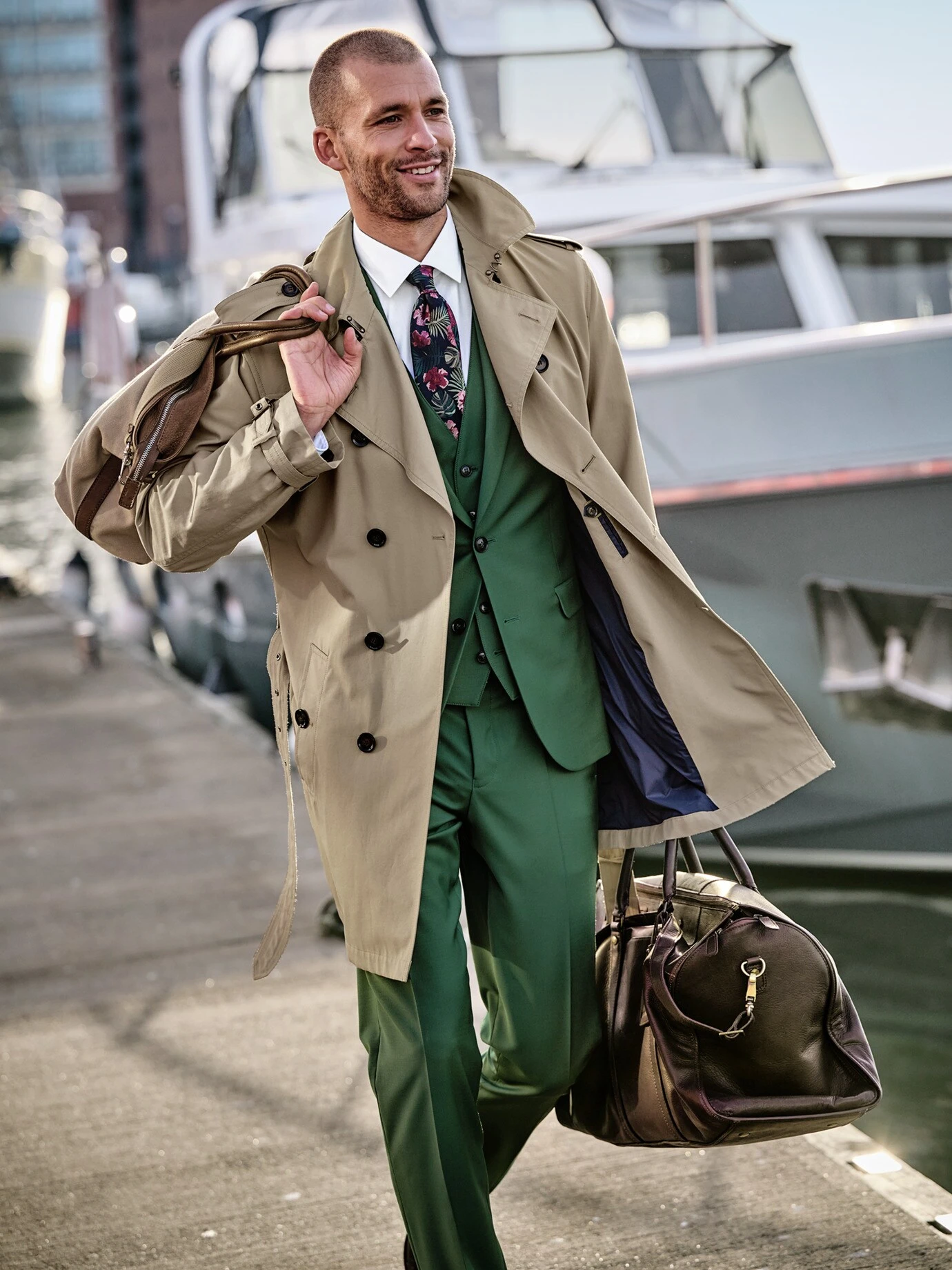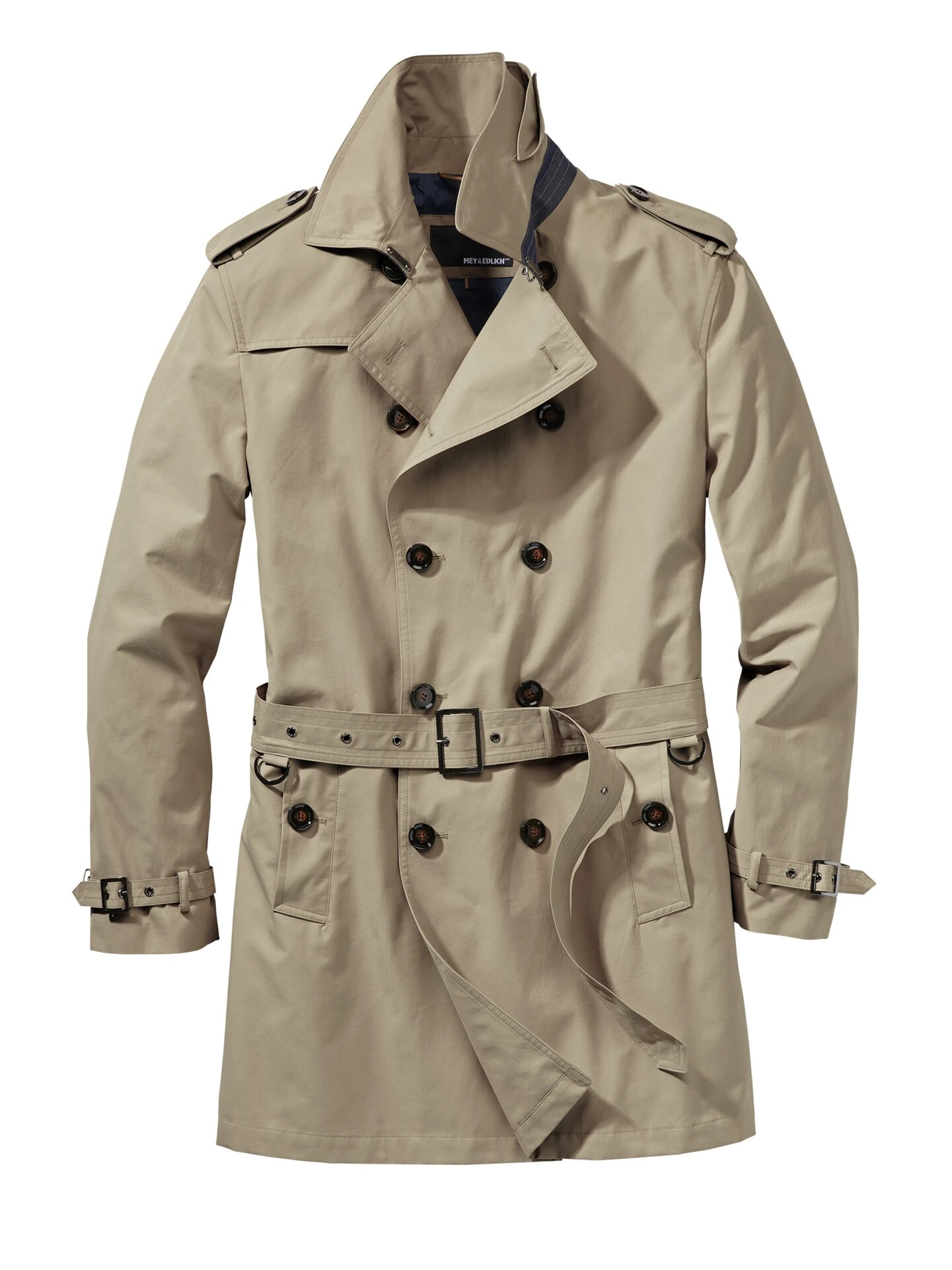 Seine entspannte Aura verdankt er den sympathisch chaotischen Kommissaren der 1960er und 70er. Doch auch die schnappten den Täter immer. Gemacht aus robustem Baumwoll-Gabardine, der für kurze Schauer wasserabweisend ausgerüstet ist. Als Reminiszenz an das Original trägt der Trench Ärmelriegel, Schulterklappen und Sturmklappe, die verhindert, dass es zieht oder der Anzug durchnässt. An den Schultern sitzt er streng, ansonsten ist der Schnitt so gewählt, dass ein schlankes Sakko drunter passt. Rückenlänge bei Größe 52 ca. 92 cm. Den Gürtel tragen Sie offen oder hinterm Rücken gebunden. Gute Farbe, die bei Verfolgungsjagden in belebten Straßen der Tarnung diente und heute unkompliziert wie Schwarz ist.