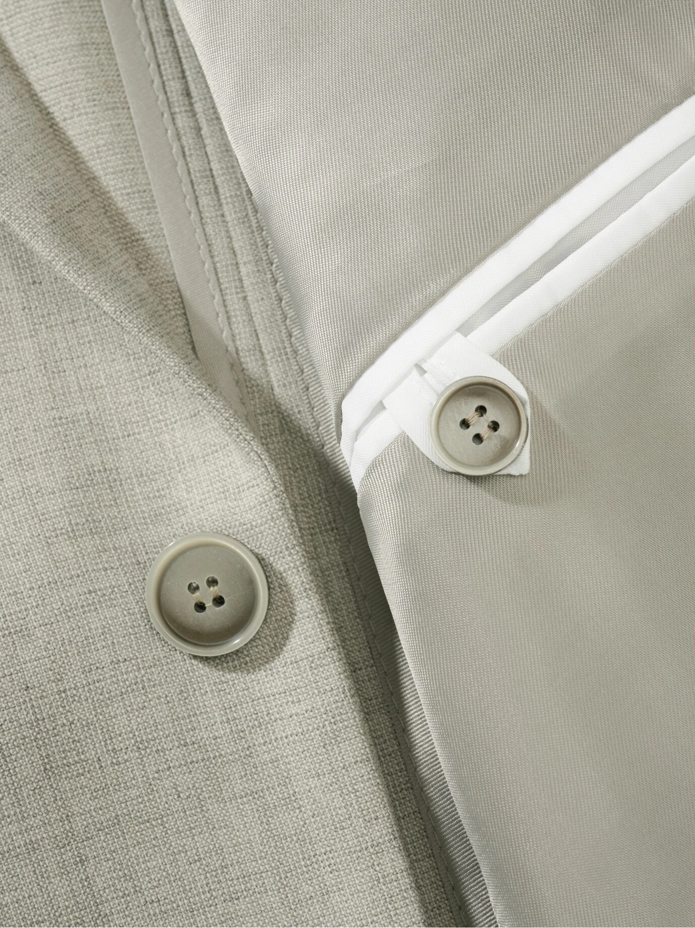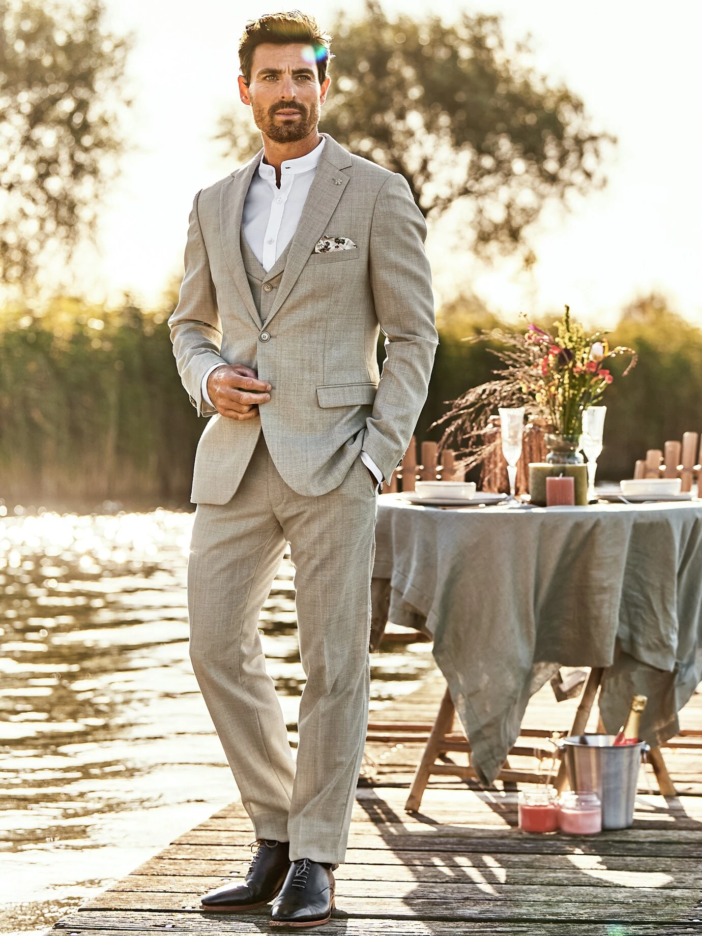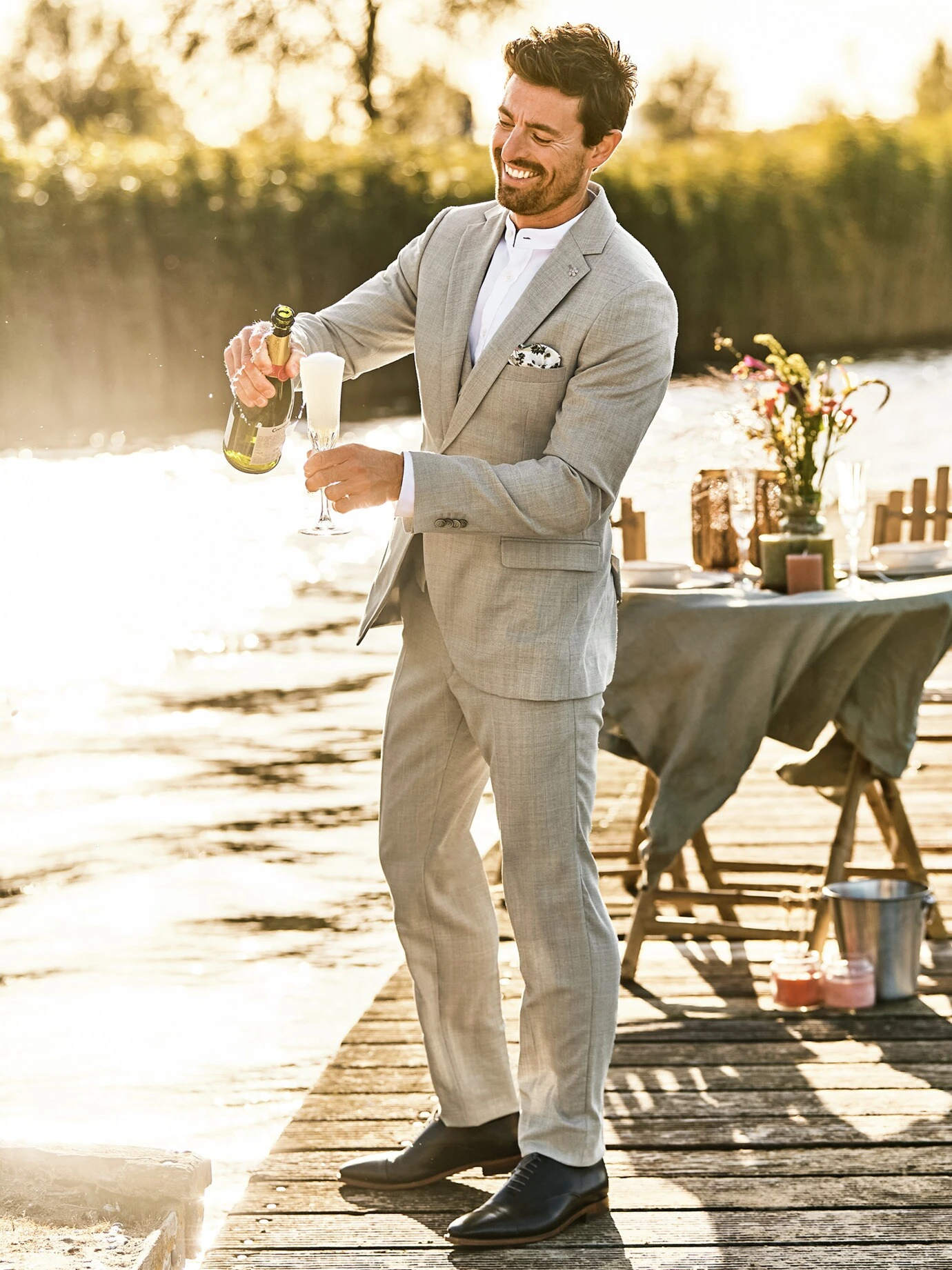 So antworten Sie jetzt mit „Ja“. Dieses Sakko stammt aus dem Baukasten des Ja-ich-will-Anzugs. Zur Hochzeit natürlich als Dreiteiler getragen, mit passender Hose (24-6811-6) und Weste (24-6810-9). Nach Rücksprache mit dem Bräutigam funktioniert das Sakko aber auch solo für den Trauzeugen, Brautvater oder andere Gäste. Dann wählen Sie z. B. die smarte Kombination mit weißem Stehkragenhemd und Einstecktuch. Der Stoff stammt von Vitale Barberis, naturelastische Schurwolle, die beim Tanzen die nötige Bewegungsfreiheit gibt und Sie über den Abend hinweg nicht ins Schwitzen kommen lässt.
