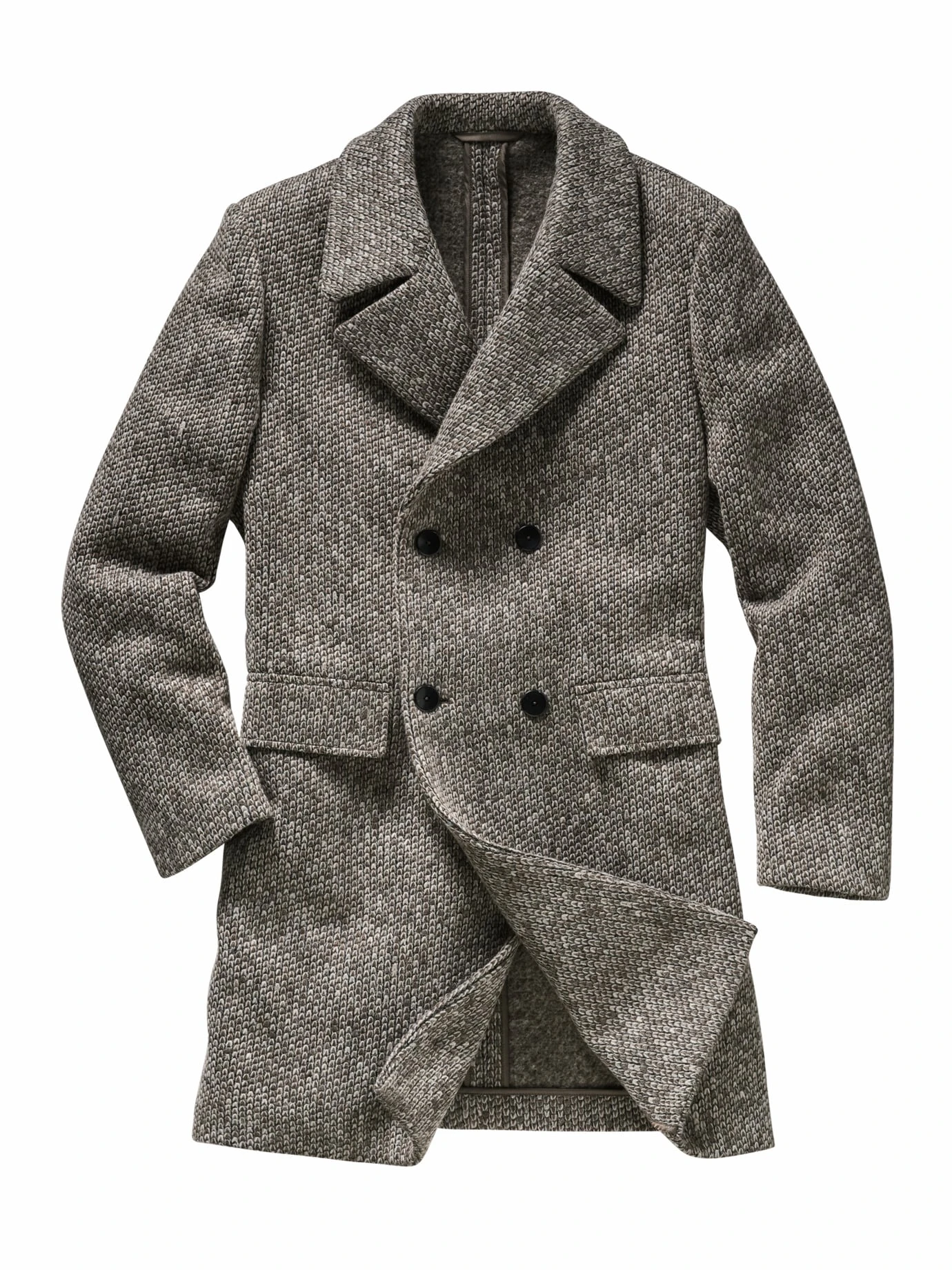 Betritt Neuland. Italienisches Design garantiert Stil. Dass speziell dieser Mantel, angelehnt an den klassischen Paletot (knielang, körpernah, tailliert), mehr kann als nur gut auszusehen, liegt einem findigen Kreator am Herzen – sollte er doch sein Gefährte auf einer Kanadareise werden. Sprich gut gerüstet für wetterbedingte Unwägbarkeiten und unbedingt wärmend. Letzteres ist das Steckenpferd der großzügig verarbeiteten, hochwertigen Schurwolle: Dank ihrer gestrickten Oberfläche speichert sie optimal Wärme und liegt hier ungefüttert direkt auf dem Körper auf, während das glatte Ärmelfutter das Hineinschlüpfen erleichtert. Echt italienisch (und funktional dazu): der Strukturstoff und der großzügige Reverskragen. Edel mit doppelter Knopfleiste.