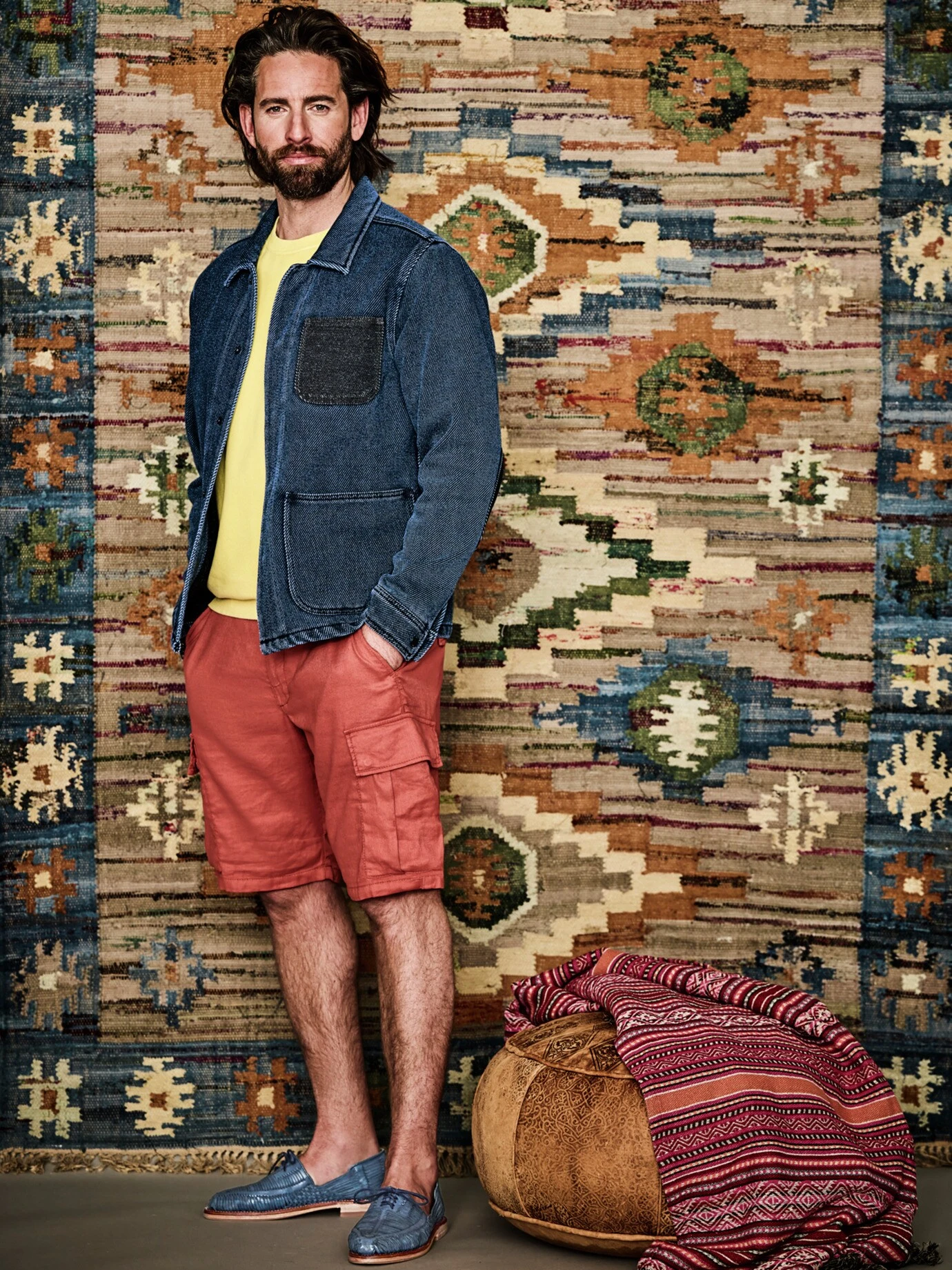Sie ist alles, außer eine Jeansjacke. Von ihr hat sie sich nur die Indigo-Färbung abgeschaut. Der authentische Blauton bewahrt sich aber selbst nach häufigem Tragen seine Intensität. Beim Rest trifft Lebensgefühl auf Experimentierfreude: Der breite Twill aus Baumwolle (hautfreundlich) und Hightech (formstabil) ist ultrafest verwoben, durch die spezielle Webart entsteht die dunklere Innenseite des Stoffes. Charakterprägend sind die fetten aufgesetzten Taschen (in denen Hände und Tickets verschwinden) und die Patches. Die Knöpfe verlaufen versteckt, damit nichts vom Blau-in-Blau ablenkt, ihr Schnitt ist als Overshirt etwas weiter. Damit passt unter die Denim-Alternative ein Longsleeve oder T-Shirt, dazu gekrempelte Chinos und Sneaker.