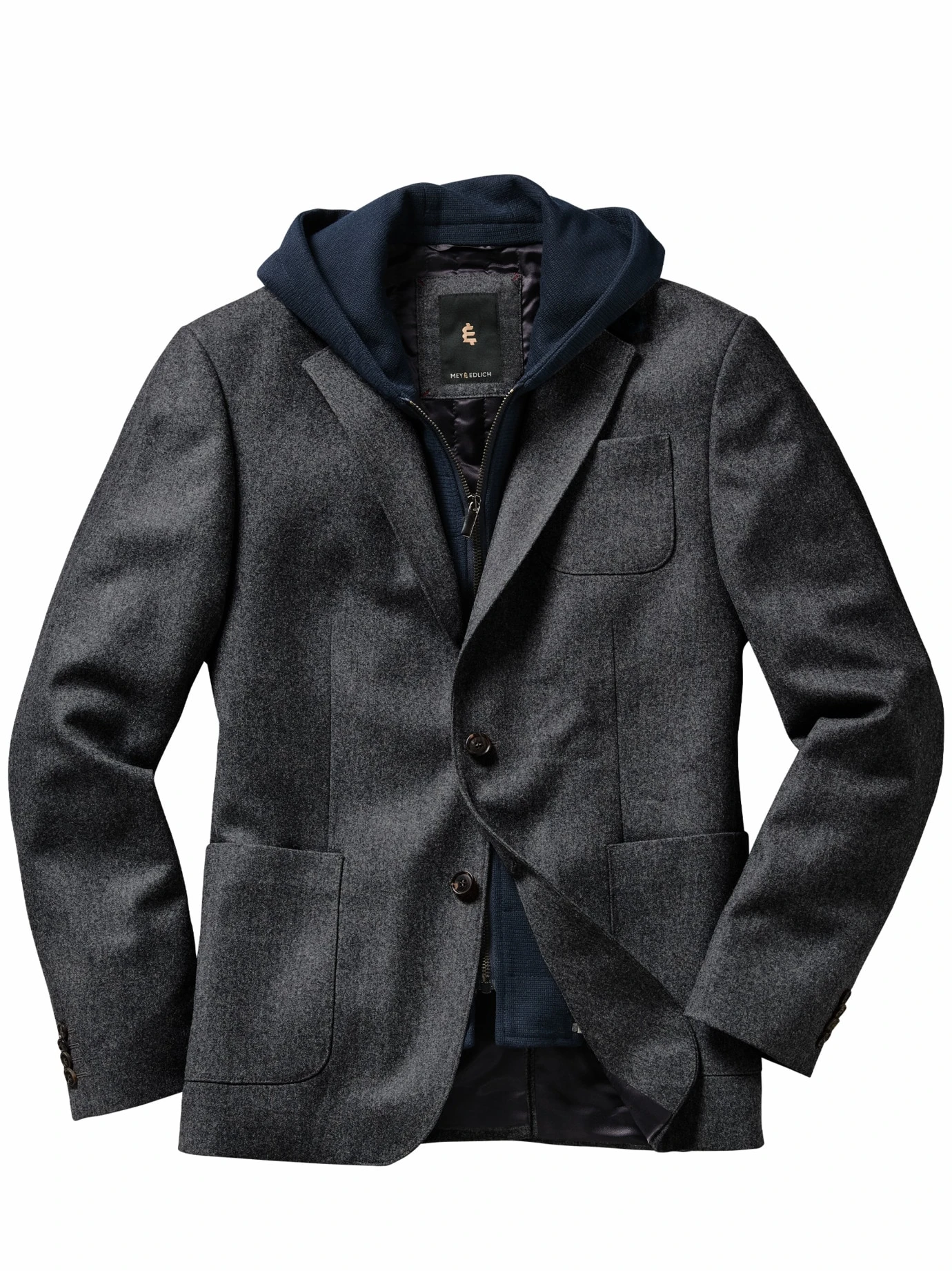 Von denen, die seit Jahrenzehnten prädestiniert sind für die hochwertigsten Tuche Italiens. Die Lanificio Fortex liefert den Schurwollstoff dieses Sakkos. Seine Garne sind fein und hochgedreht und damit erholt sich dieses Sakko schnell von Knittern und Falten. Die nötige Souveränität verleiht die Konstruktion, mit aufgesetzten Taschen, die heraustrennbare Kapuze samt Sturmblende bedient Agilität und Sportlichkeit. Sie trägt einen ähnlich festen Stand wie ein teures Polo, hält also bei Bedarf auch wirklich auf dem Kopf. Gefüttert ausschließlich mit reiner Viskose, dem hochwertigsten aller Futterstoffe. Auf Büffelhornknöpfe zu schließen.