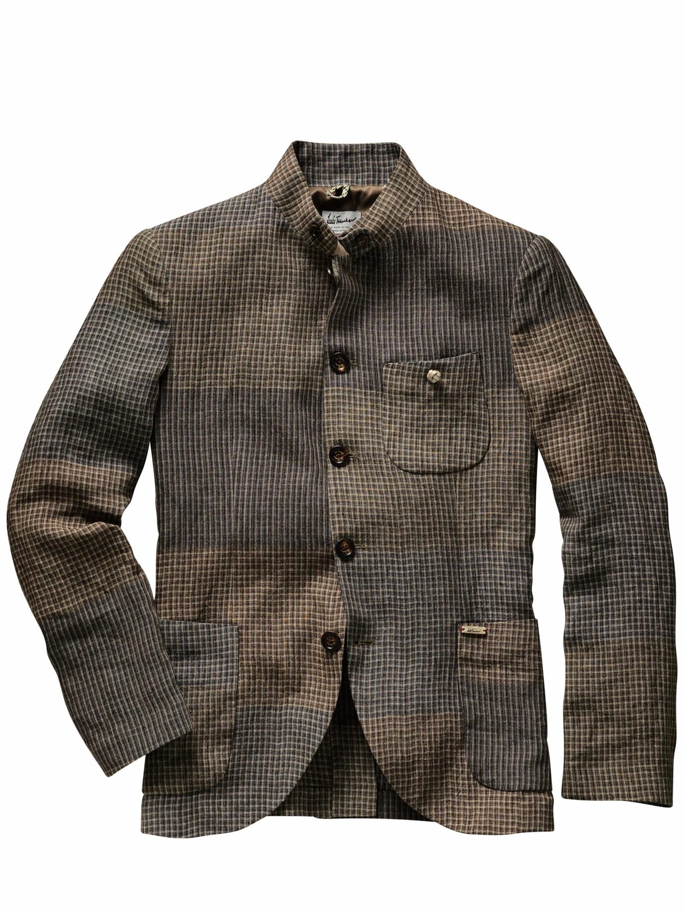 In Südtirol nur an den schönsten Tagen anziehen. Dieses Sakko erinnert an den Smoking Südtirols, ein Stehkragensakko, das Elemente der typisch alpinen Tracht trägt. Luis Trenker interpretiert es allerdings mit Lusandro sehr zeitgenössich. Sein Leinengewebe stammt aus Italien, liebevoll vor Ort in einem feinen Patchwork-Stil zusammengefügt. Interessanter als ein herkömmliches Karo, dazu kombinieren Sie ruhig die Weste Lusebastian (Nr. 24-6477), zur Gartenparty oder Sommerhochzeit reicht aber auch vollkommen ein schlichtes Strickpolo.