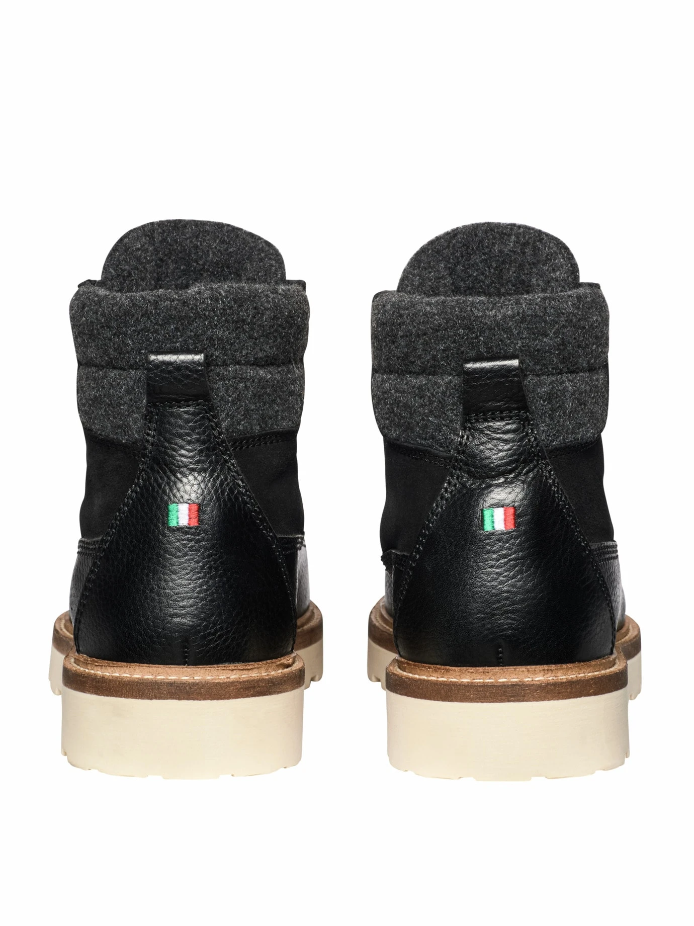 Verarbeitung: Durch sein Futter aus wärmendem Filz fühlen sich die Füße selbst auf langen Schneestrecken geborgen und bleiben warm. Außen trägt er eine Mischung aus italienischem Rindleder und Filz, damit kein Wasser reinkommt.