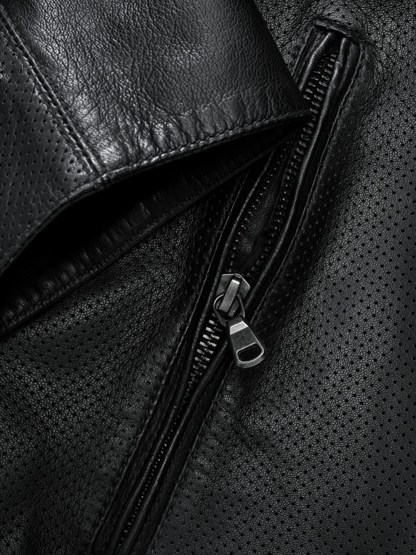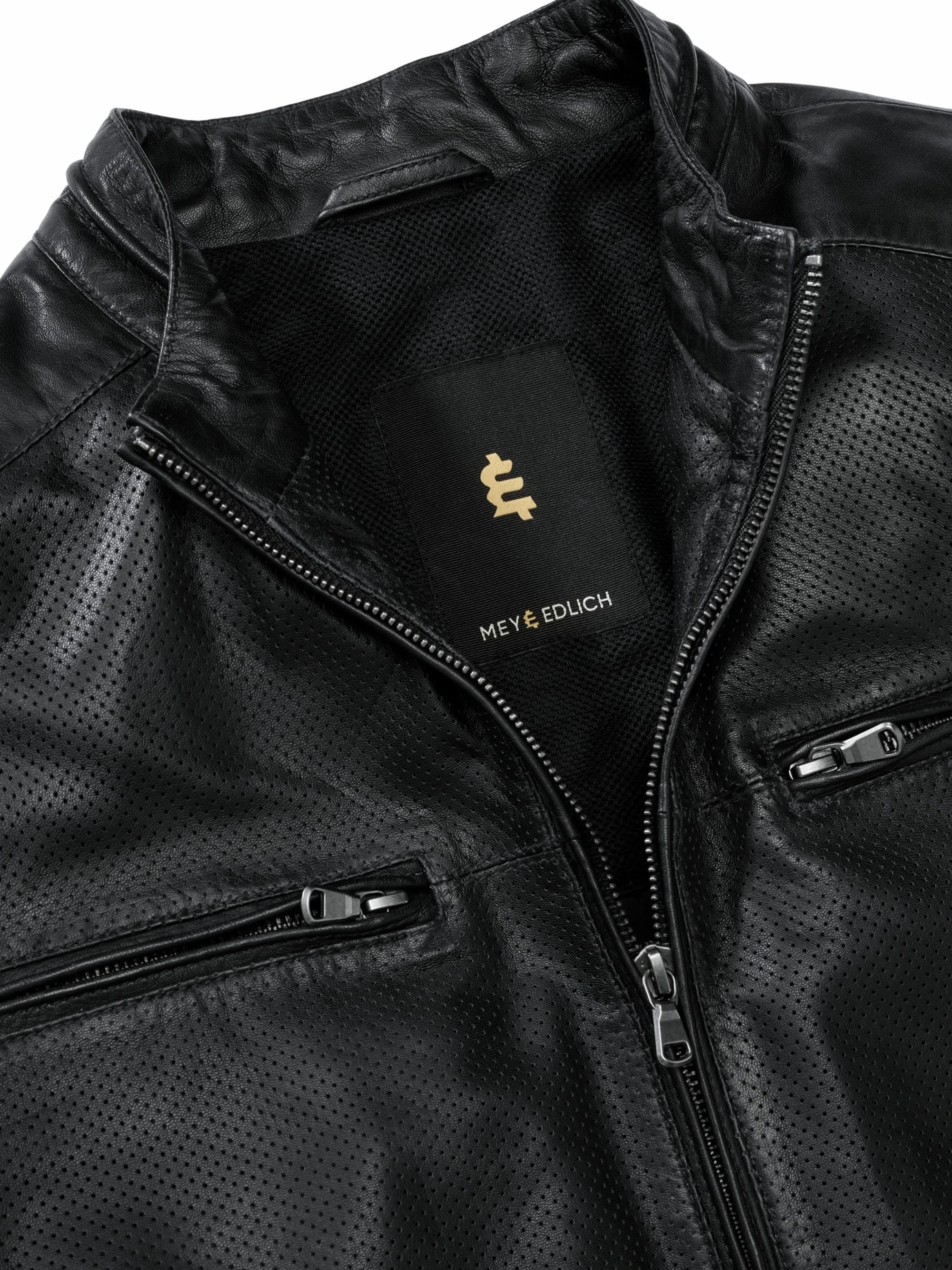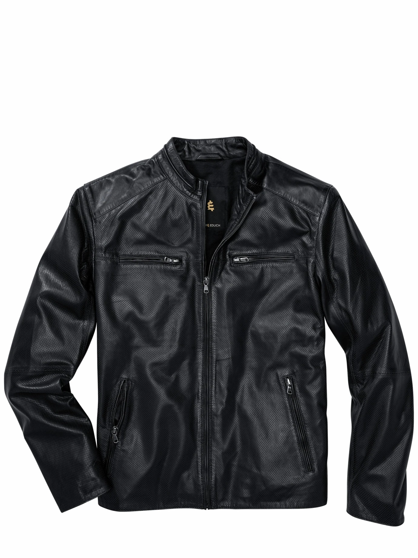 Baut auf Luft und Leder. Wie das Lochblech bei Industriebauten und Museen prägt die Perforation das Gesicht der Lederjacke. Die Kunst: Die Lochung so hinzubekommen, dass sich die Hitze an warmen Tagen in der dunklen Jacke nicht staut und sie dennoch genügend Stand hat. Zur luftigen Konstruktion passt das weiche, leichte Lammleder, das sich im Laufe vieler Sommer als erstaunlich robust erweist. Der lässige Blouson kann gut mit T-Shirt und Jeans, in die Mailänder Pinacoteca di Brera geht’s mit leichtem Hemd, Chino und geputzten Lederschuhen.