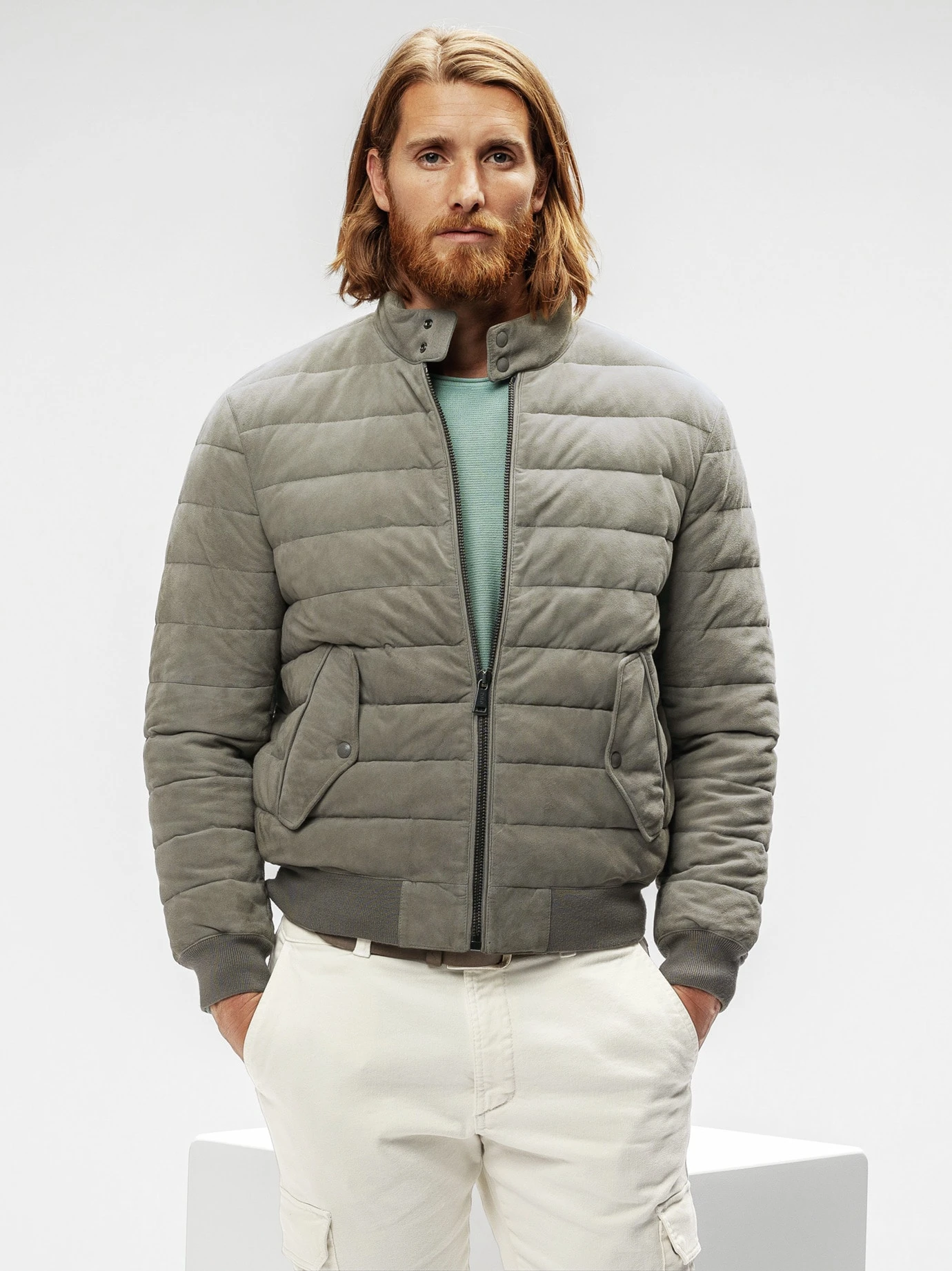 (Fast) ausgefallen: London Fog. Ein heller, aber unempfindlicher, warmer Grauton, der für Lederjacken noch ungewöhnlich ist, da der Kontrast zu schwarzer Hose häufig zu hart ist. Diese ist gearbeitet aus butterweichem Ziegenvelours. Zusätzlich gesteppt, damit harte Winterstürme eintreffen können. Strickbündchen verhindern, dass der Wind drunterkriecht. Die Blinddrücker halten den Kragen gut verschlossen. Zusätzlich ist das Leder fein imprägniert, damit hält die Jacke Nebel samt leichtem Sprühregen ab. Mehr nicht. Mehr will aber auch keiner.