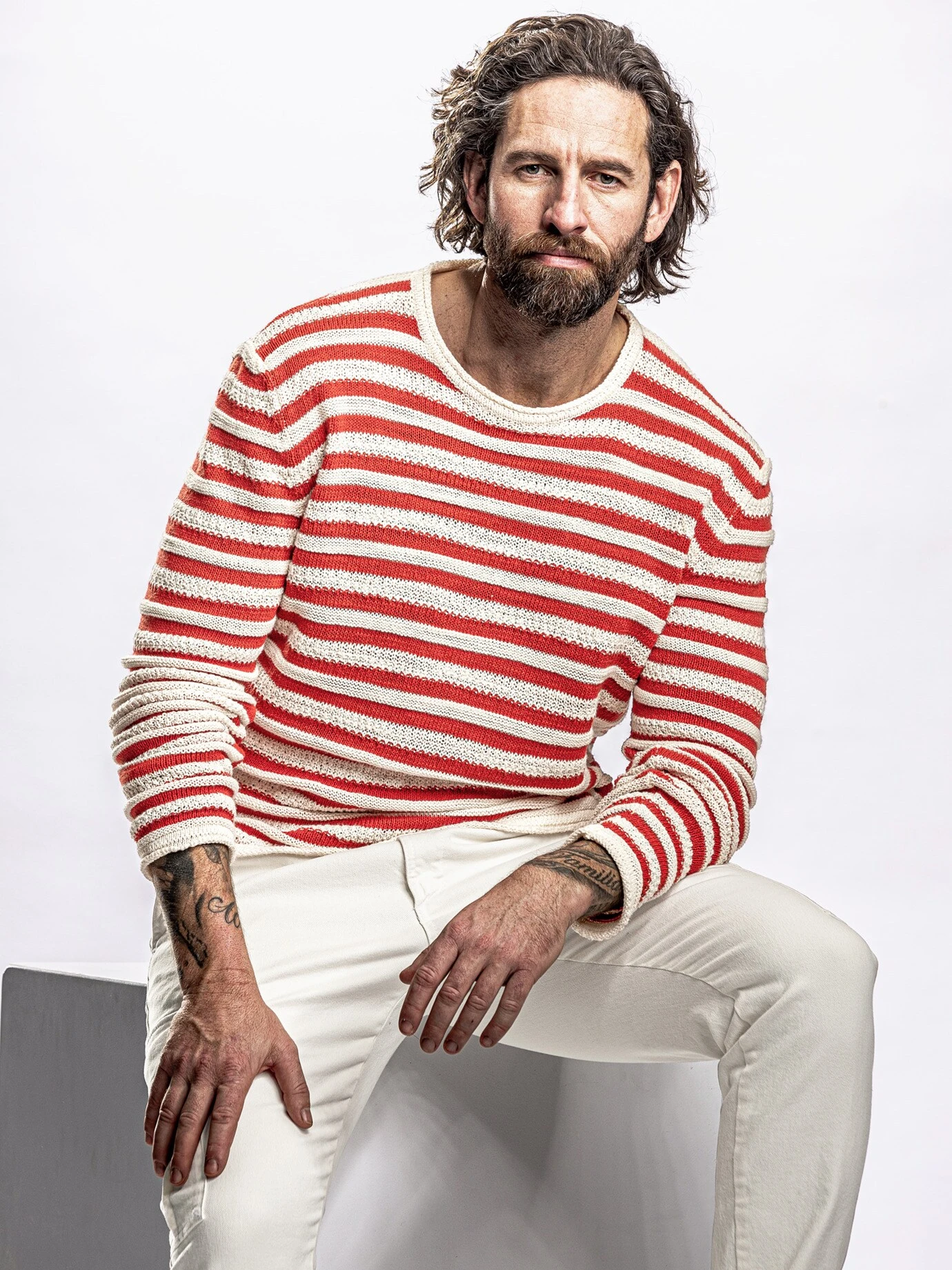 Linientreu. Auf die Pasta der Mamma lässt vermutlich kein Italiener was kommen, geht unserem italienischen Stricker genauso. Daraufhin haben wir gemeinsam den Pasta-Pullover entwickelt. Vom Prinzip ein dicker Streifen, die Basisfarbe ist stets die Spaghetti, der Rest ist Geschmacksache. Gestrickt aus einem echten Sommergarn in wunderschöner Technik, viel Baumwolle trifft auf Leinen. Damit ein Pullover, der gemacht ist für laue Sommerabende zur Jeans, passt aber auch gut zum Dinner unters blaue Sakko.
