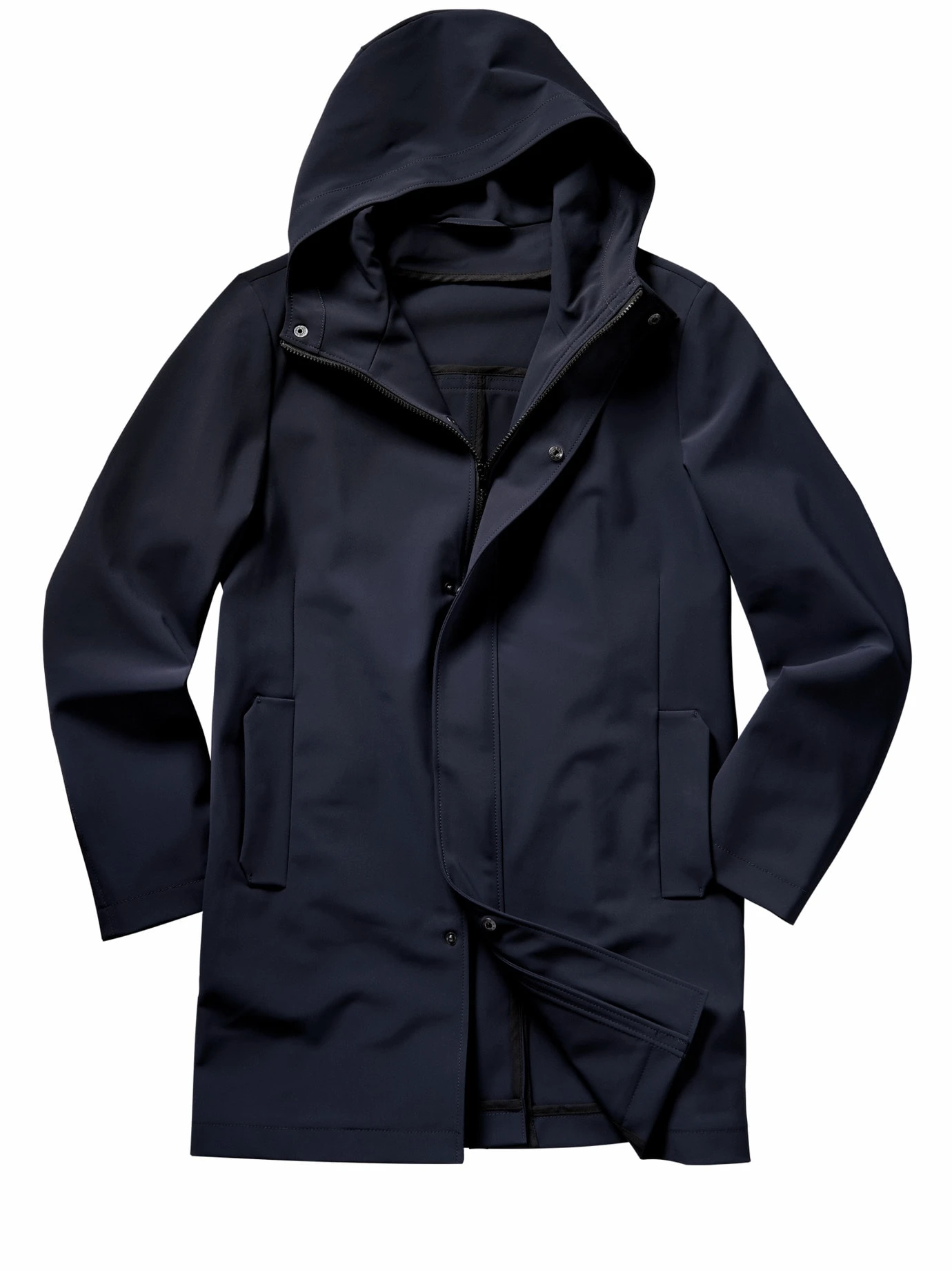 Eine Macht überm Anzug. Von Anfang an entwickelt, um auf dem Weg zum Job vor sämtlichen Widrigkeiten zu schützen. Der Power Move Coat bedient sich modernster Hightech-Materialien. Er ist wasserabweisend und winddicht, als Anzugmantel für Geschäftsreisen zudem konsequent auf Dynamik getrimmt: leicht (wiegt nur 400 Gramm), ungefüttert, flexibel, knitterarm und bei Bedarf auf ein taschenfreundliches Maß zusammenfaltbar. Dank des geraden Schnittes mit den verdeckten Leisten wirkt er clean und damit zeitlos. Mögliche Zweckentfremdungen sind eingeplant, im Zusammenhang mit Jeans, Pulli und Sneakern wirkt er, offen getragen, sportlich.