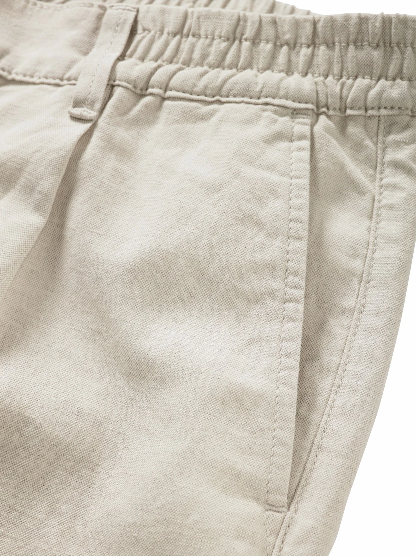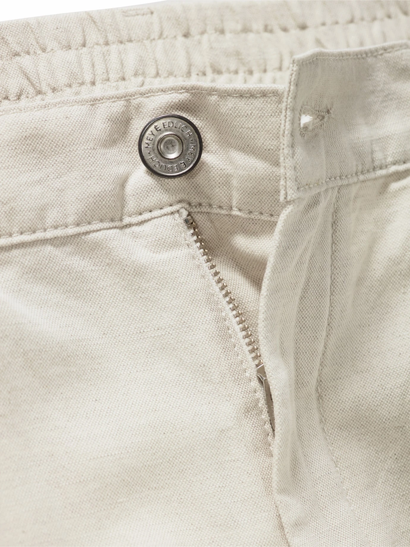 Wirkt auf den ersten Blick: heller Naturton, üppiger Tucheinsatz, gute Outline. Das Volumen strahlt Entschlossenheit aus, formt starke Beine und schafft Komfort. An heißen Sommertagen sorgt es zusammen mit dem hohen Leinenanteil für Kühlung und Luftaustausch. Die kleine Bundfalte bringt Fasson in den Schnitt, der nach unten schmal ausläuft.