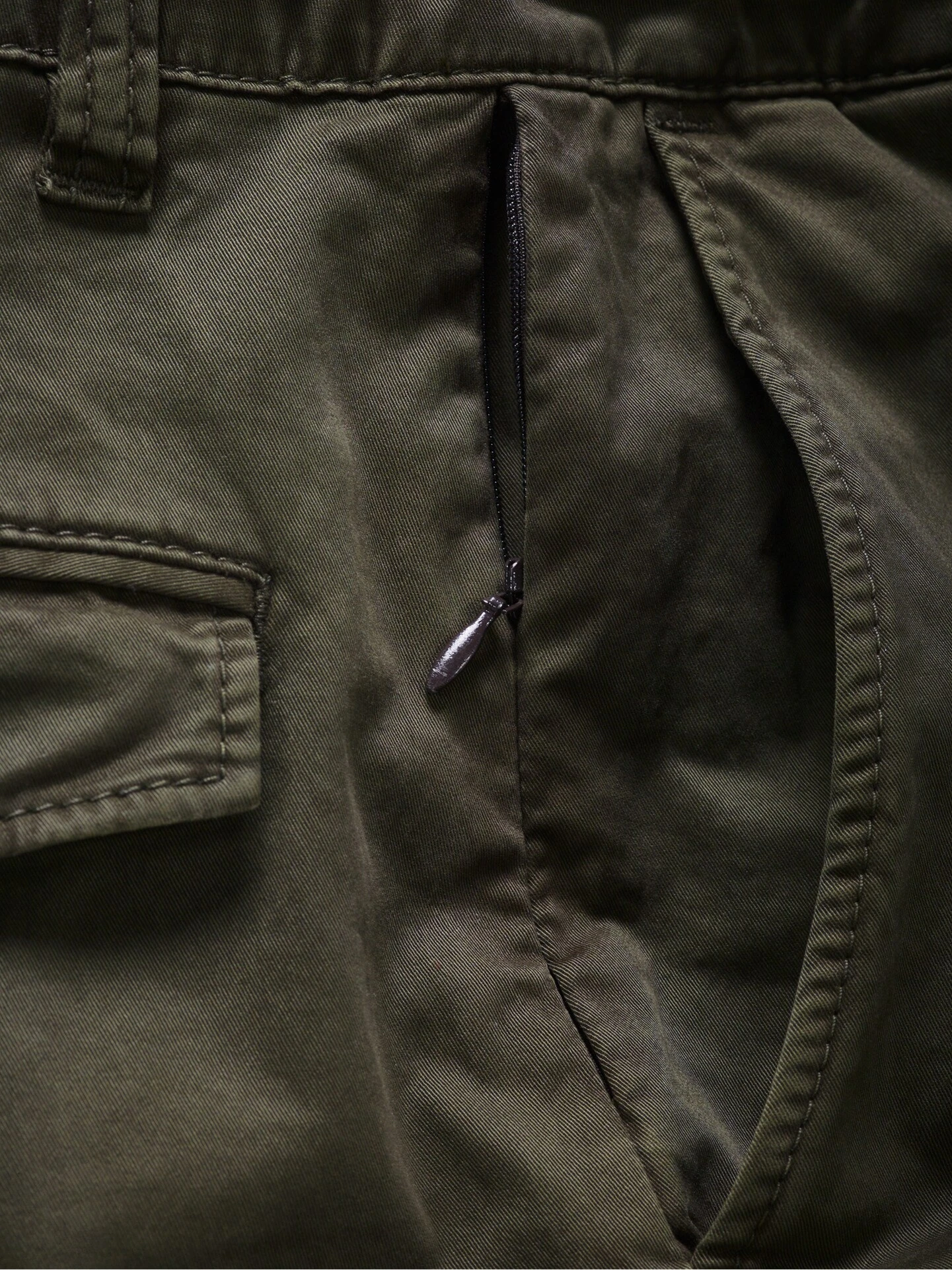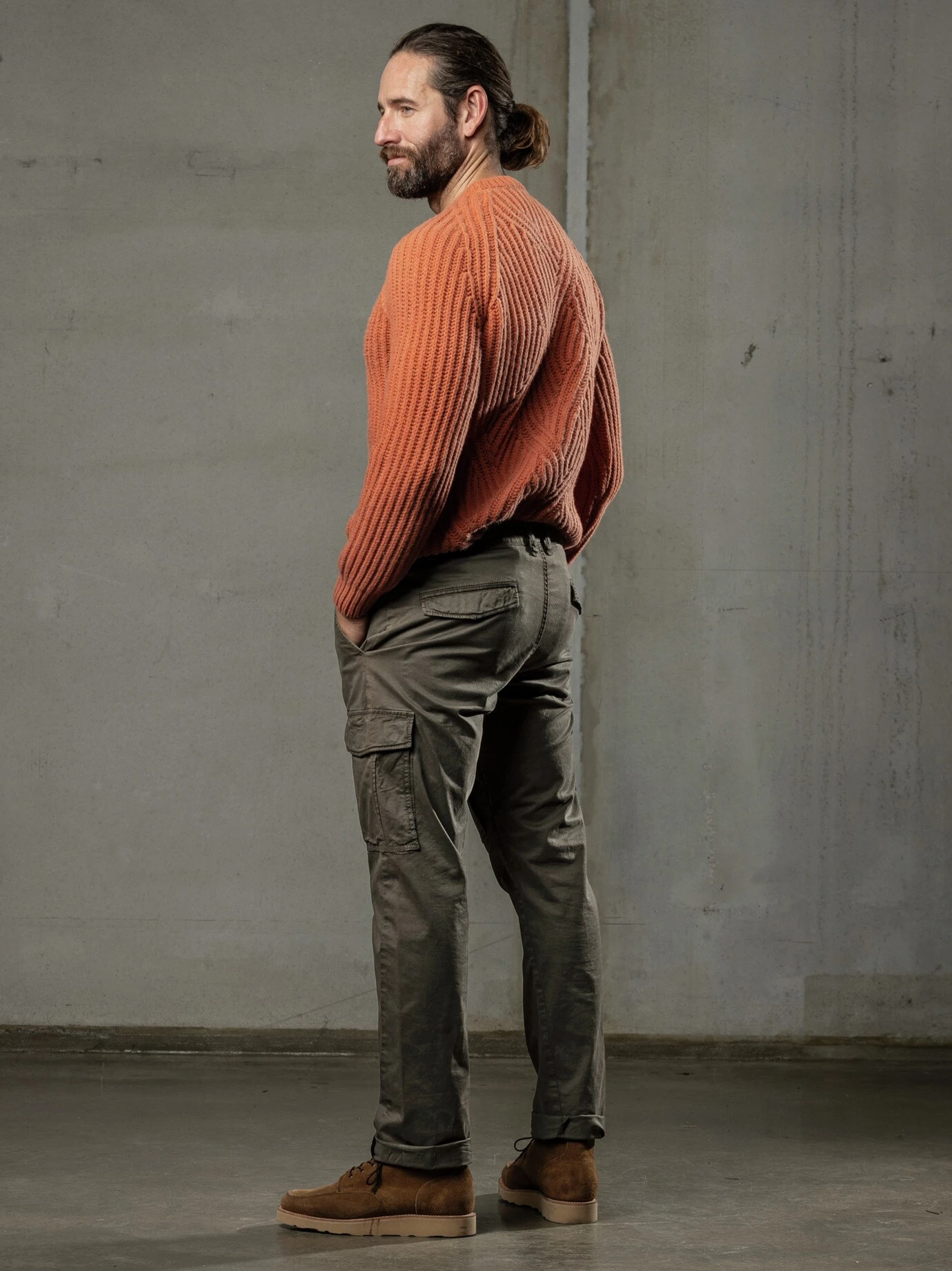 Was ist Dein nächstes Projekt? Hauptsache, es passt in diese Hose. Zwei Einschubtaschen für die Hände, eine nahtlose Reißverschlusstasche für Kleinkram. Drei Cargotaschen für Werkzeug und Krempel oder für Schreibgerät und Smartphone, zwei Gesäßtaschen für Geldbörse, Schleifpapier oder Schlüsselkarte. Gemacht aus stabiler Baumwolle und einem Anteil flexiblen Elasthans. Erneuerter Schnitt: obenrum bequem, zur Wade hin schmaler (Fußweite 39 cm) und mit Tunnelzug. Zum Werkeln mit T-Shirt und Jeanshemd, modisch zum Business Pitch mit Sakko.