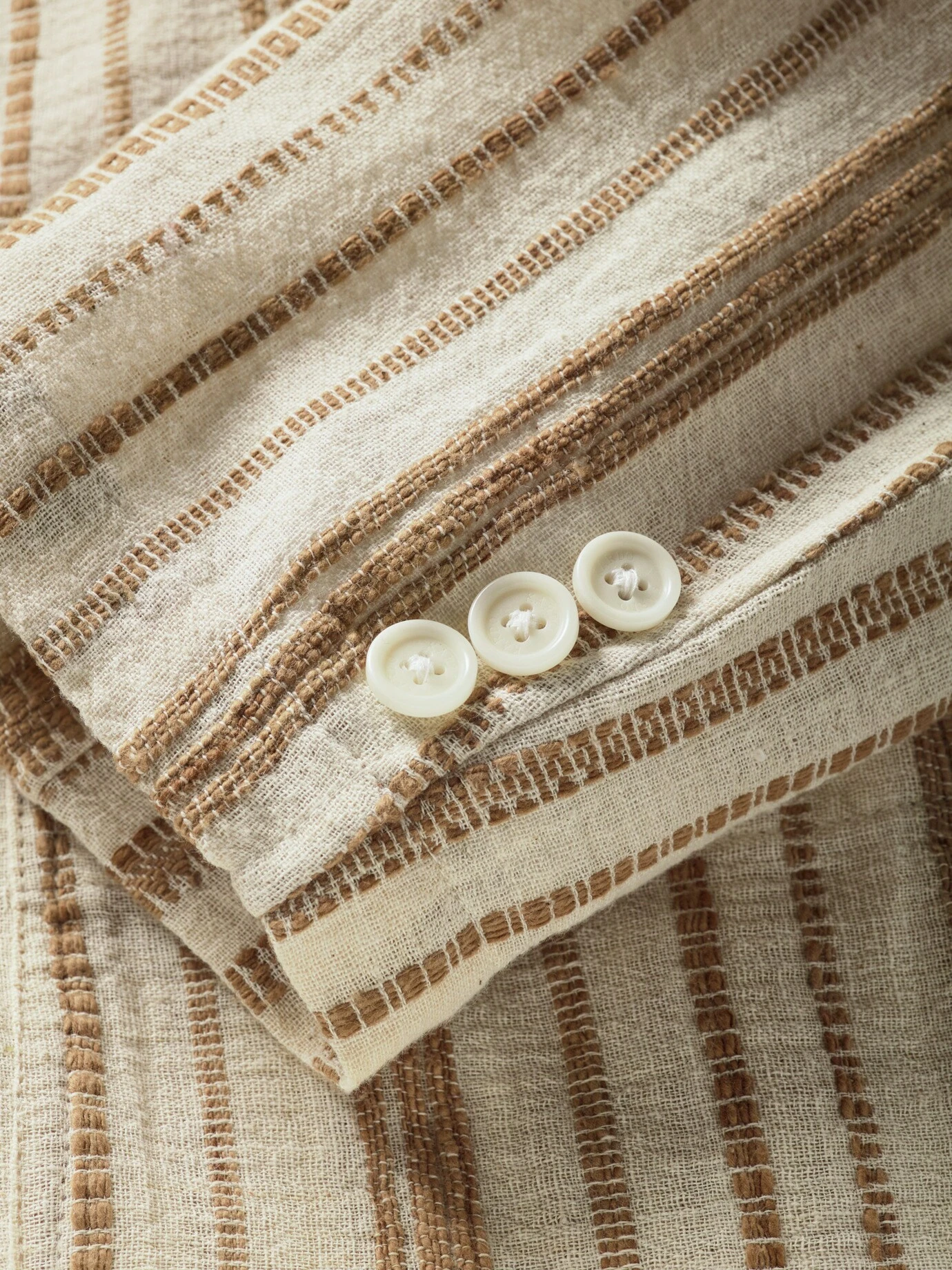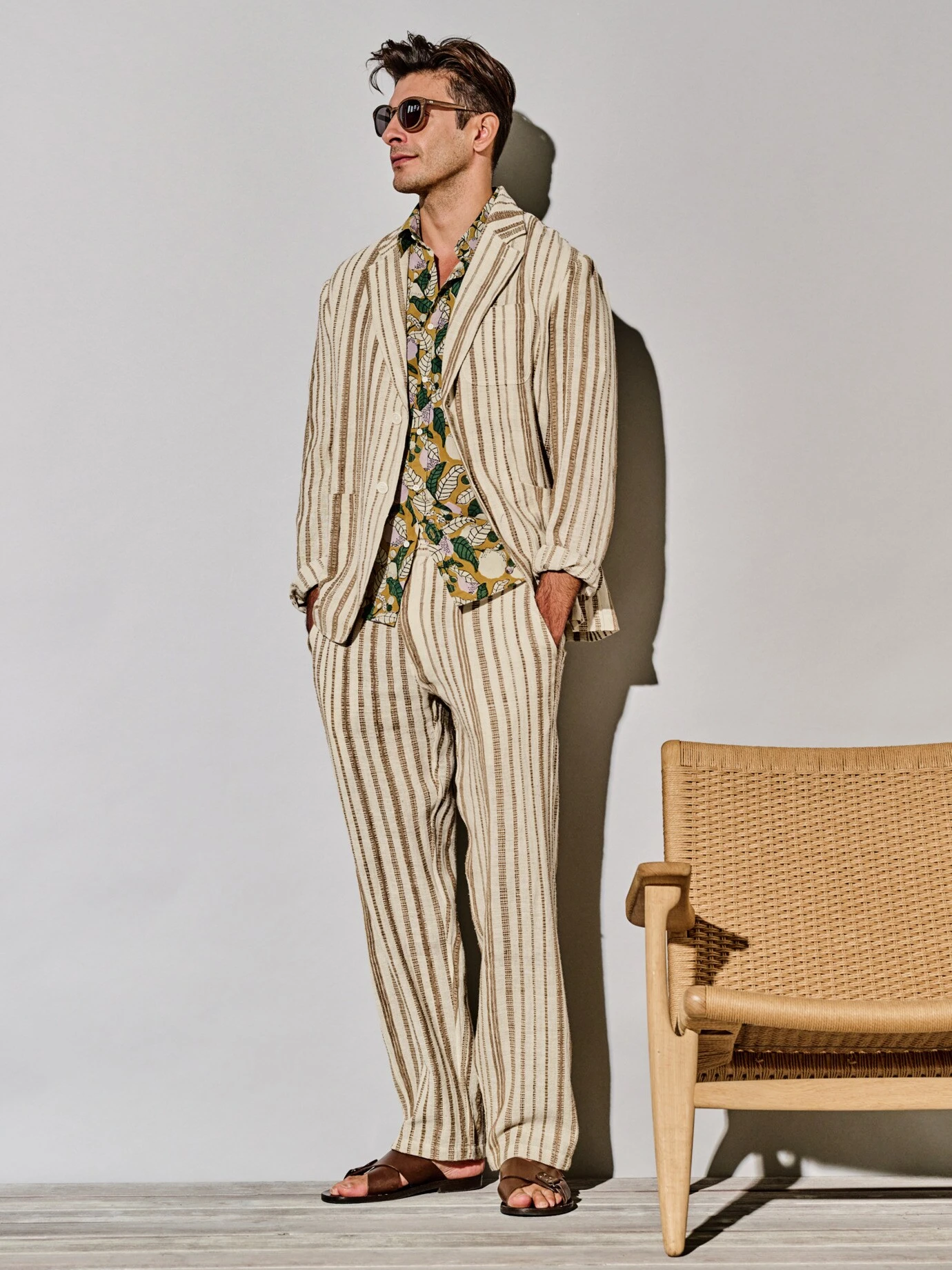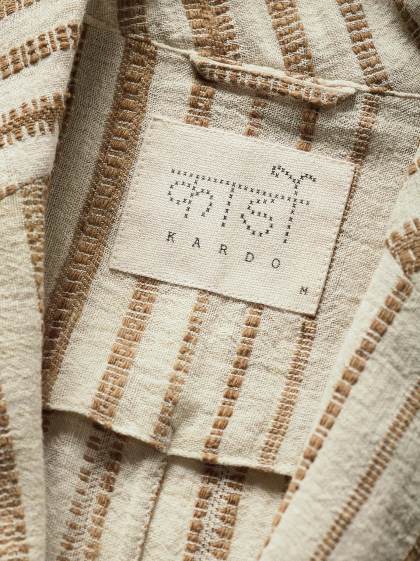 Slow-Fashion, die schnell begeistert. Hinter jedem Sakko steckt hier ein Gesicht. Es stammt aus einer Werkstatt in Neu-Delhi. Hier wurde es entworfen. Ein und derselbe Schneider hat alle Teile von Anfang bis Ende von Hand zugeschnitten, genäht und sorgfältig mit Hilfe fair bezahlter Handarbeiter fertiggestellt. Kardo nennt das „ONExONE“-Produktion. Jeder Name wird auf dem Etikett vermerkt. Auf diese Weise unterstützt Kardo Handwebereien in ganz Indien. Durch die Zusammenarbeit erleben traditionelle Fertigungstechniken eine Renaissance. Die Auswirkungen auf die Umwelt können auf ein Minimum reduziert werden. Trägt sich fühlbar gut, dazu passen hervorragend übrigend weiße Leinenhemden.