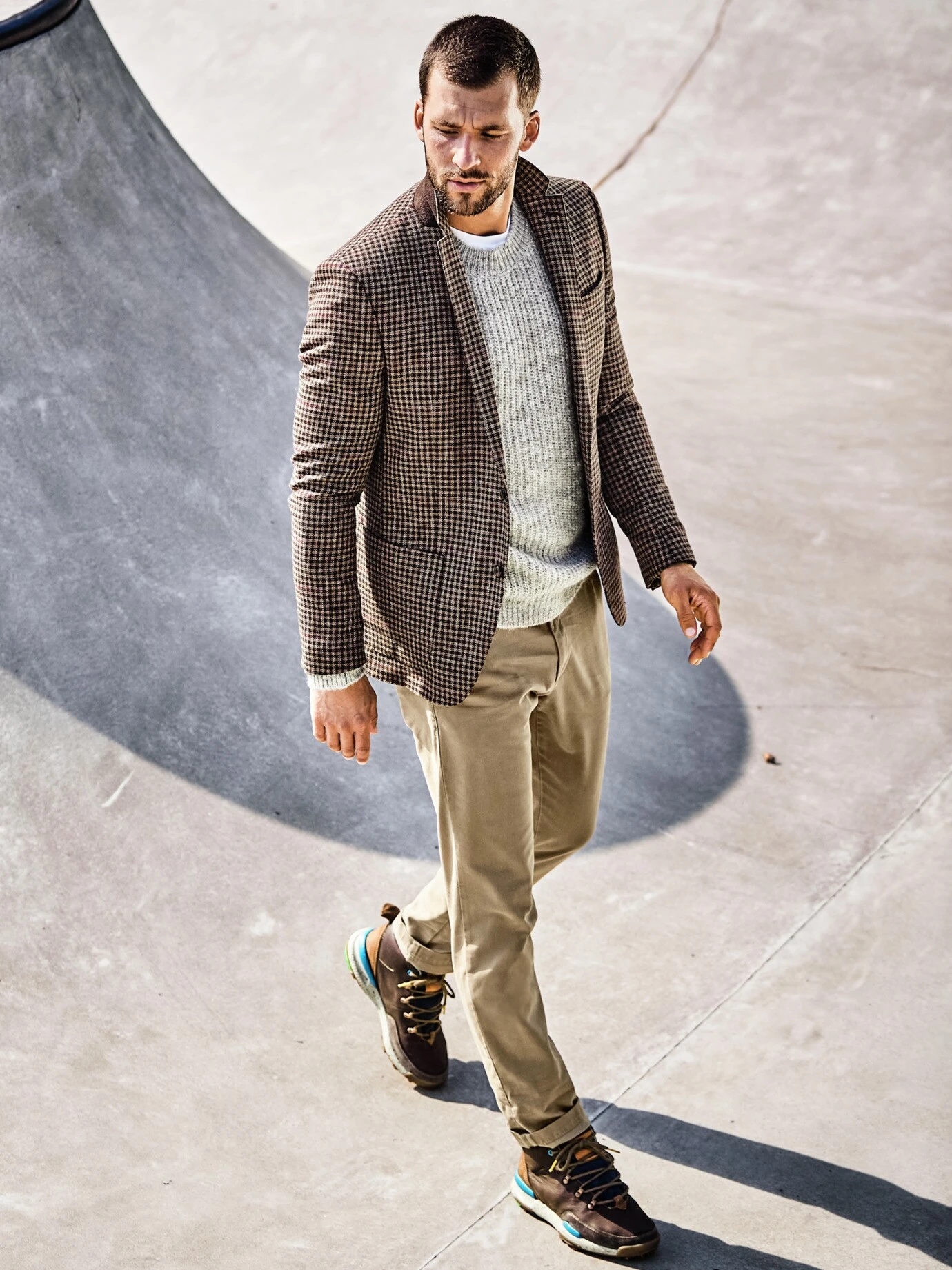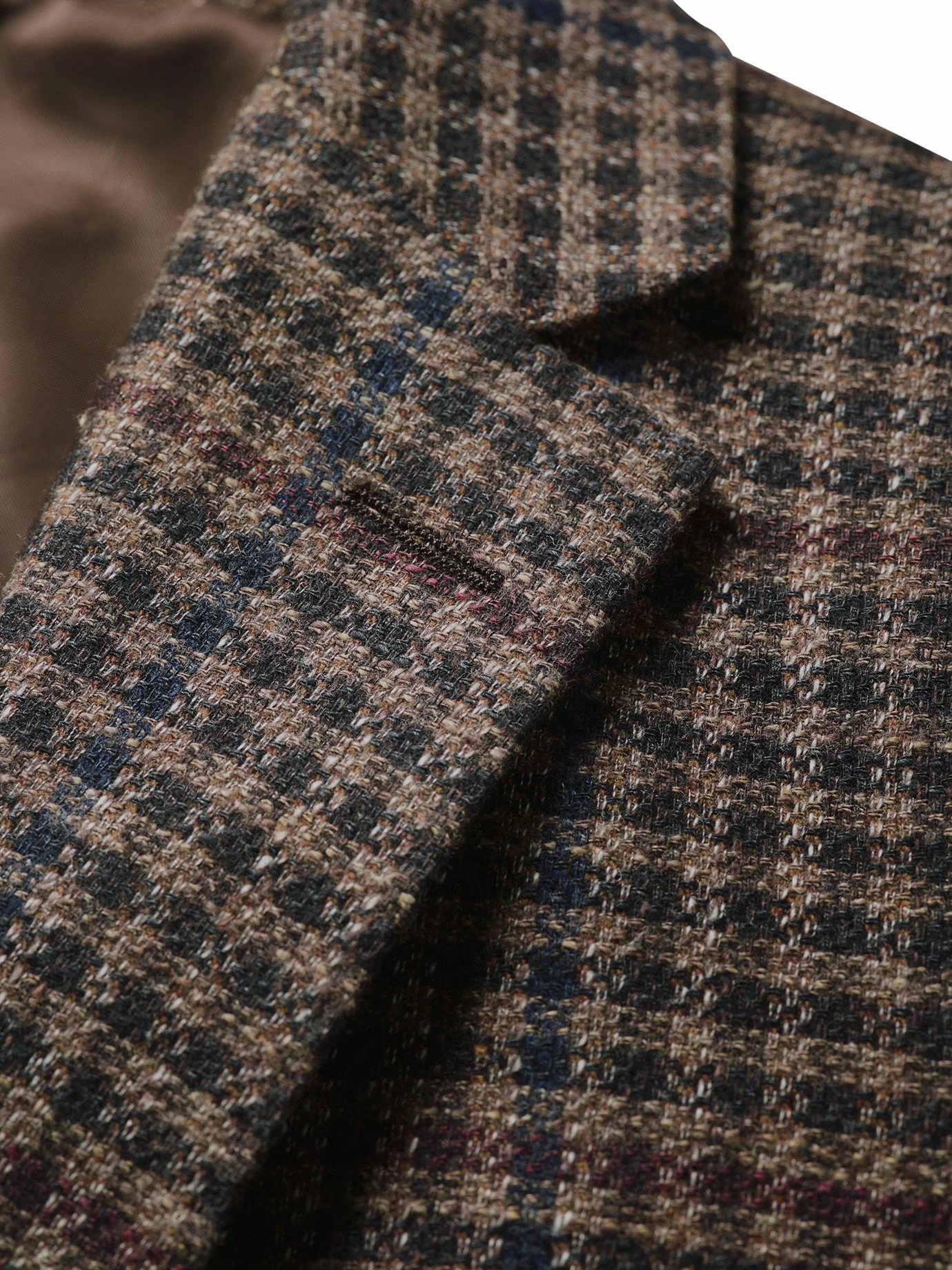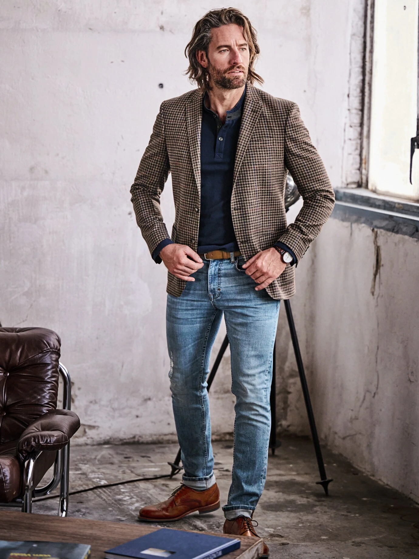 Aus den Salons mit schweren Vorhängen entsprungen. Inspiration für dieses Sakko fanden wir auf den alten Bildern von Räumlichkeiten mit üppigen Teppichen und Bücherregalen, die eine Leiter benötigen. In unserer Vorstellung trug man hier genau ein solches Sakko. Mit ordentlich gearbeitetem Karomuster, aber doch leicht genug, um neue Maßstäbe im Philosophieren zu erreichen. Das Tuch stammt daher aus Italien, gefordert ordentlich (dank Schurwolle), Leinen macht es luftig. Auf Hochglanz polierte Lederschuhe tun dazu gut, passt aber auch lockerer zum Shirt.
