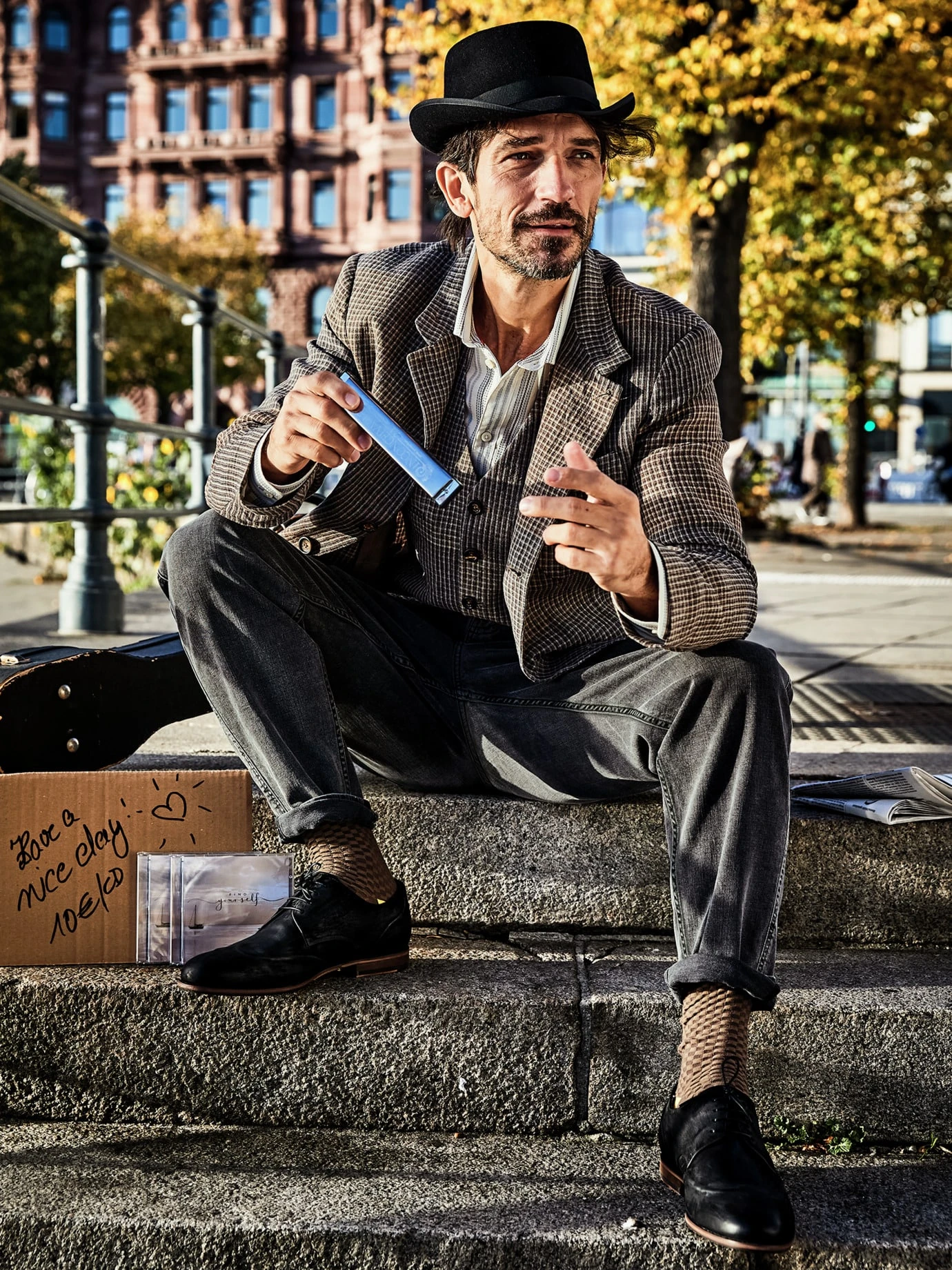 Gewitzte Socke. Das Schachbrettmuster ist das Highlight, das sich aufgrund der zurückhaltenden Tonalität nicht in den Vordergrund drängt. Nur ab und an blitzt das leuchtend gelbe Bündchen am hochgerutschten Hosenbein durch.