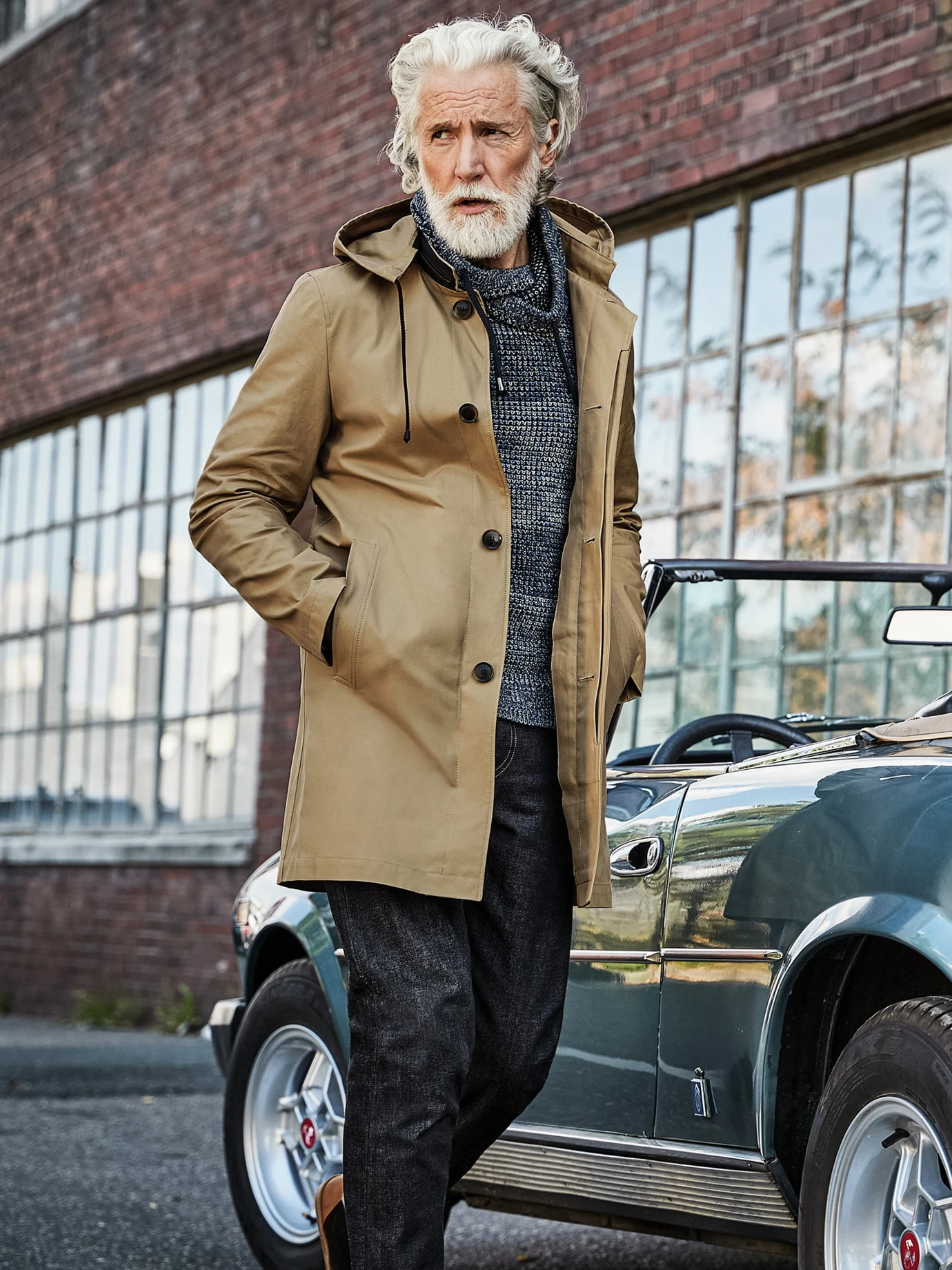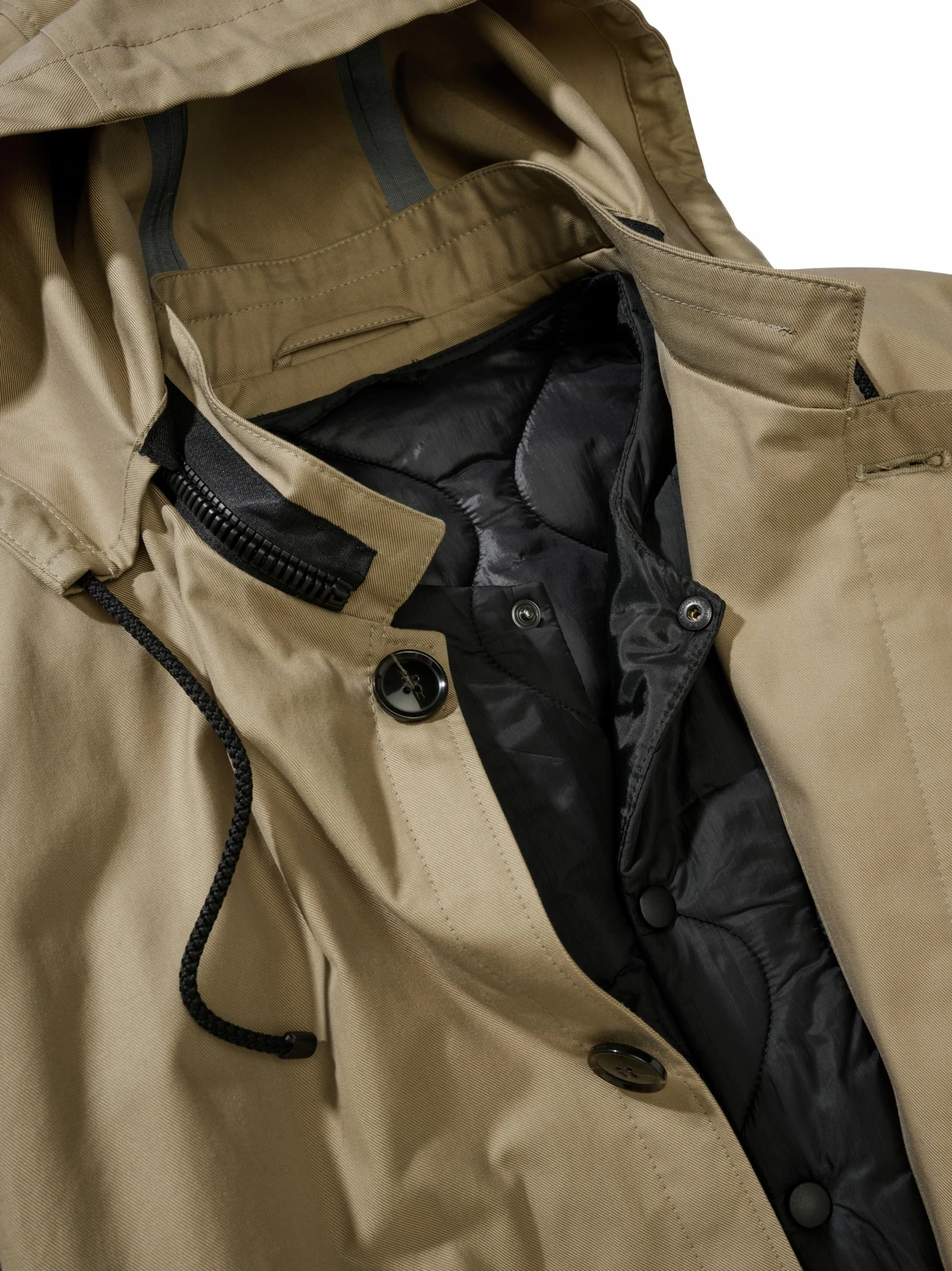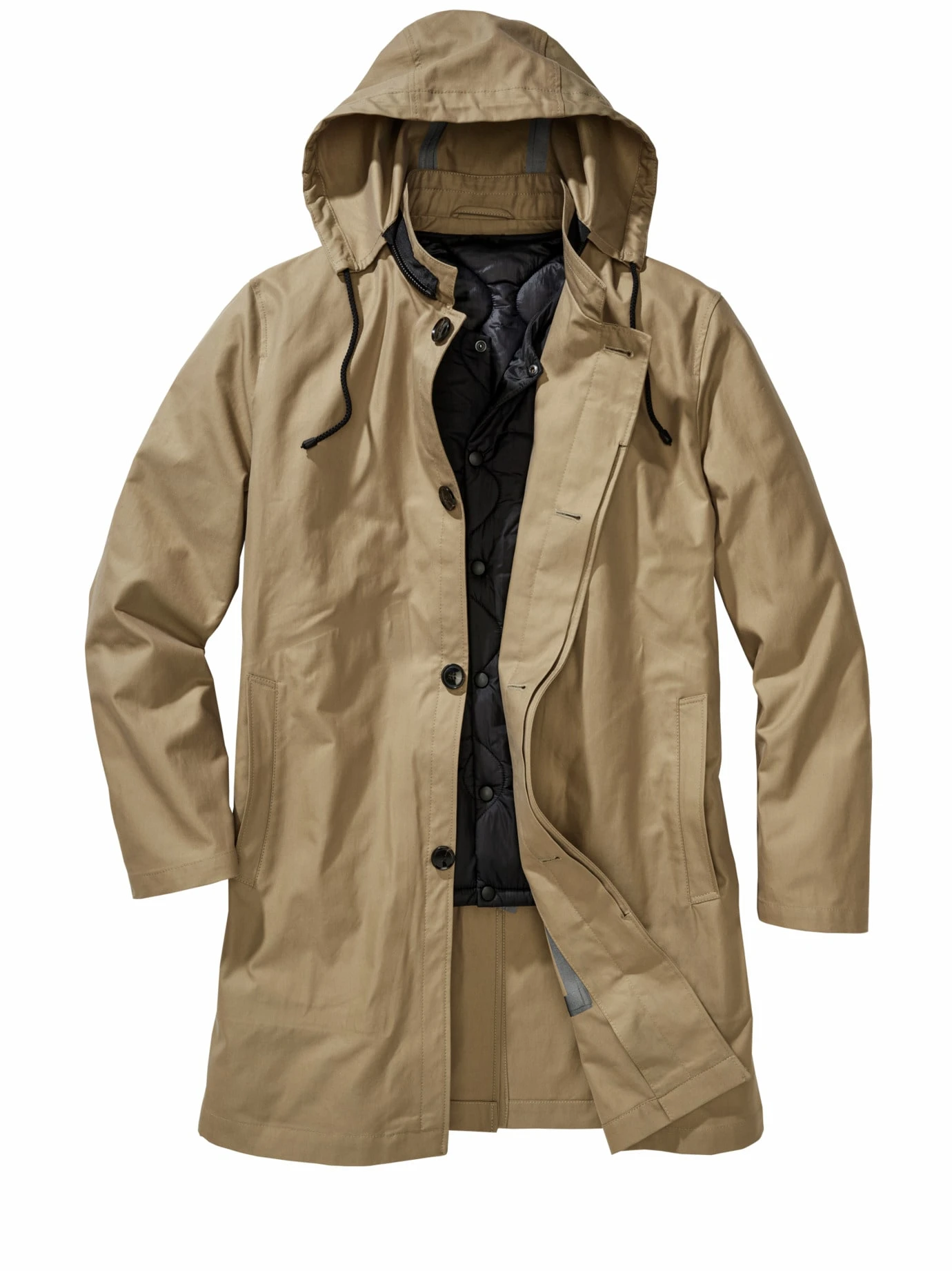 Innovative Kapuzen-Umsicht. Die Kapuze dieses Mantels ist als Rotor eingearbeitet. Selbst mit Kapuze auf dem Kopf geht sie mit, in der Bewegung läuft sie einfach auf einem Zahnkranz mit, der sich als Kontrast am Kragen abzeichnet. Garantiert freie Sicht und gute Wärme. Die ausknöpfbare Weste kann auch nach innen geknöpft werden, damit sie unterm Sakko unsichtbar wärmt. Vom portugiesischen Traditionsweber Riopele stammt der dicht gewebte Baumwollstoff, der die Jacke einen kurzen Schauer überstehen lässt.