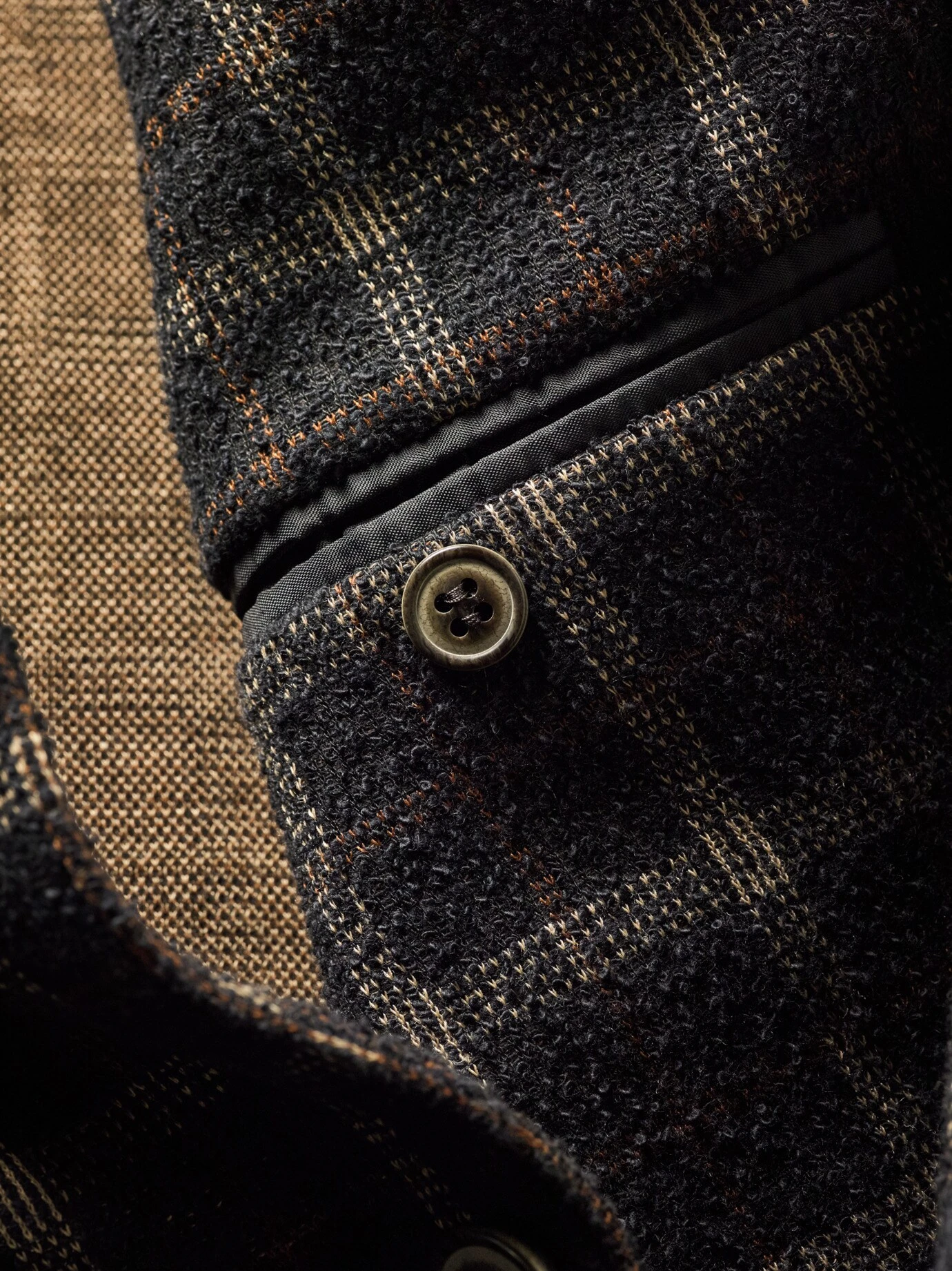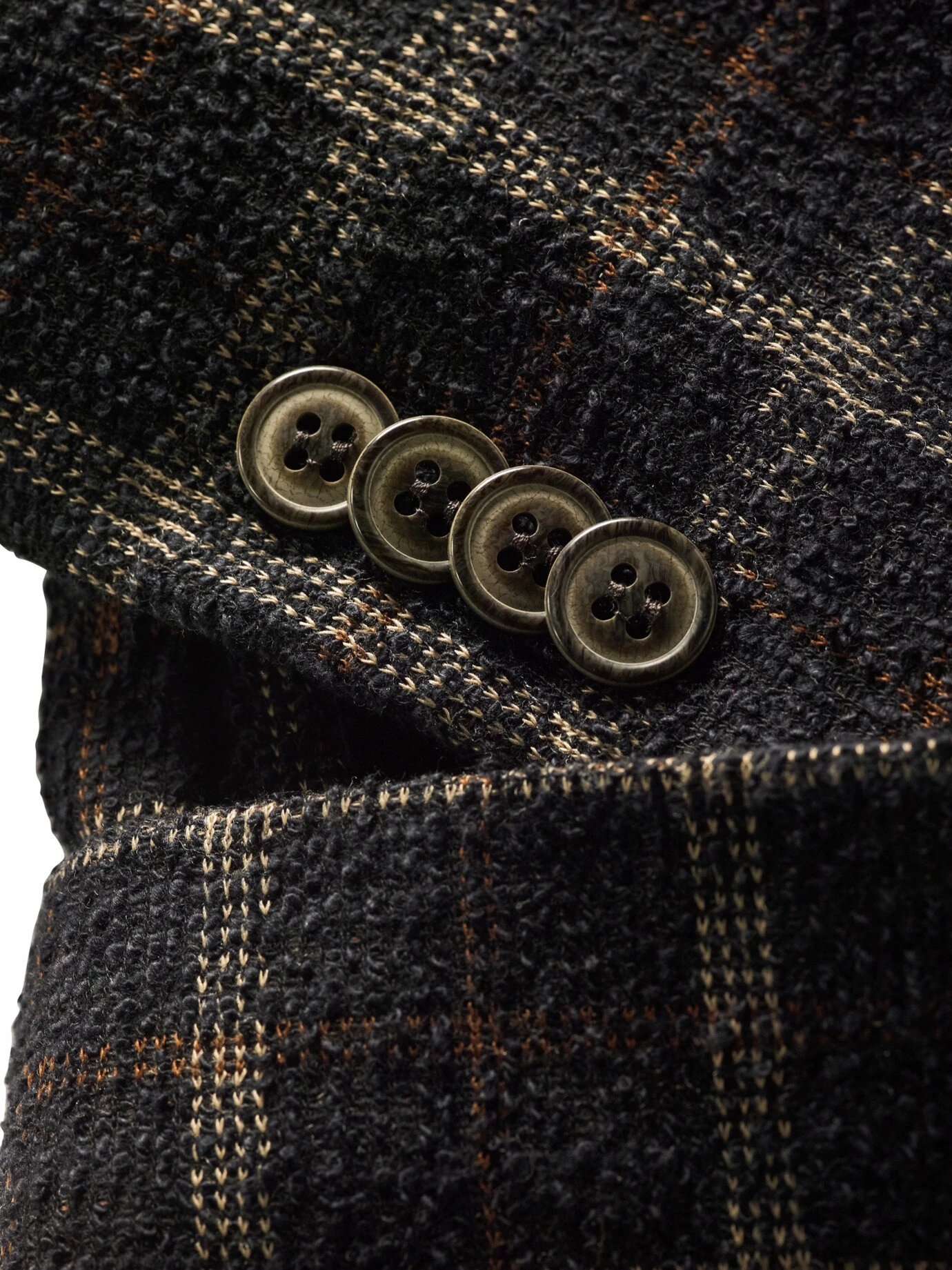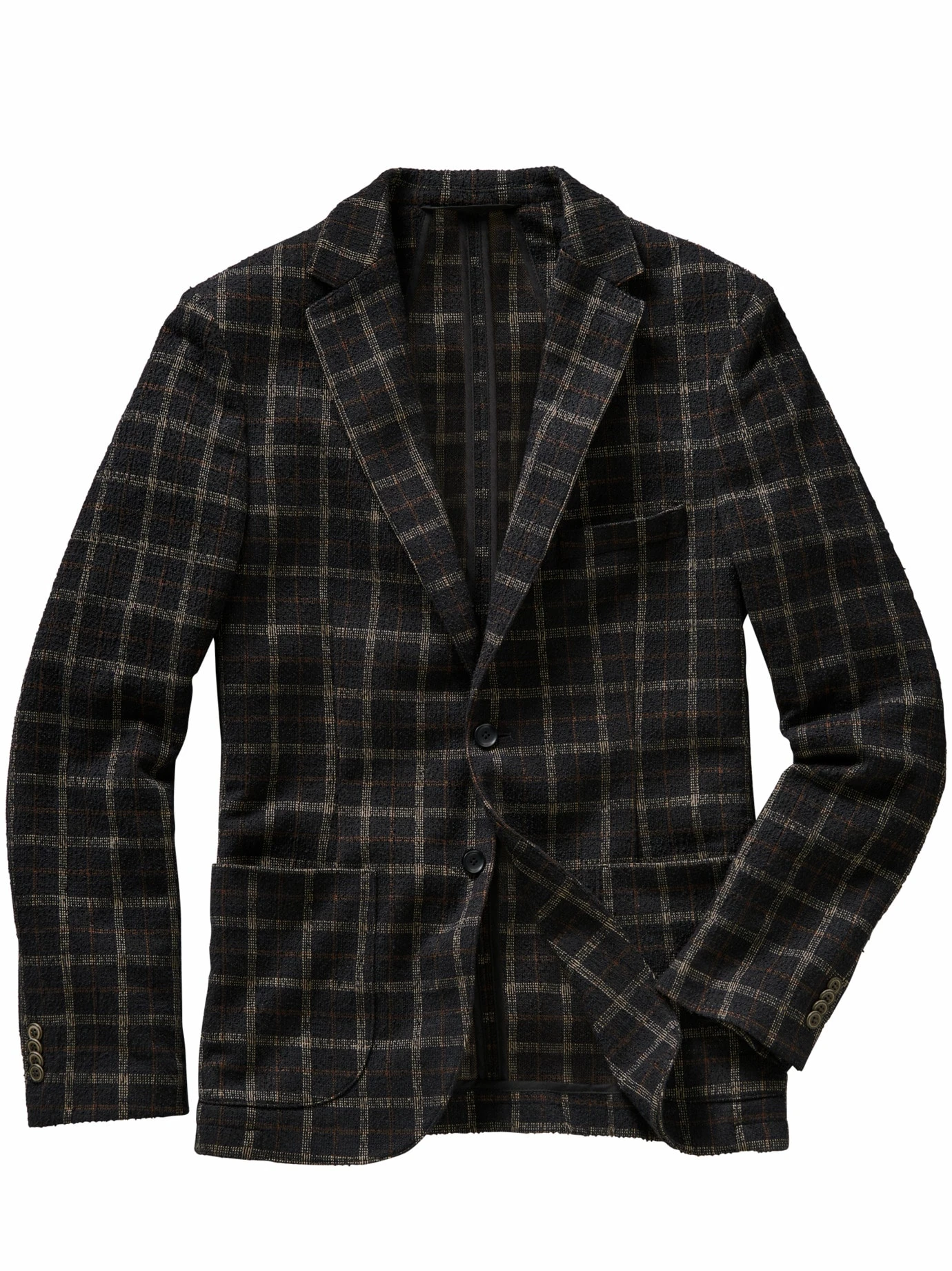 Im Genuss von Zeiten des Spinnrades – dieses Sakko ist aus einem Winter-Bouclé gearbeitet. Sie erkennen es an den typischen Unregelmäßigkeiten (die gibt es üblicherweise nur bei handgesponnenem Garn), was mehr Geschichte aufweist als die aalglatten Stoffe, die der Markt sonst zu bieten hat, und am Verzicht auf das Futter. Der italienische Weber verleiht dem Sakko so das nötige Volumen, knitterarm und unempfindlich ist es eh. Passend dazu abgesetzt im Heritage-Karo und die Knöpfe in Vintageoptik. Gewusst wie: in Kombination zur namensgleichen Weste (Nr. 24-6781-2).