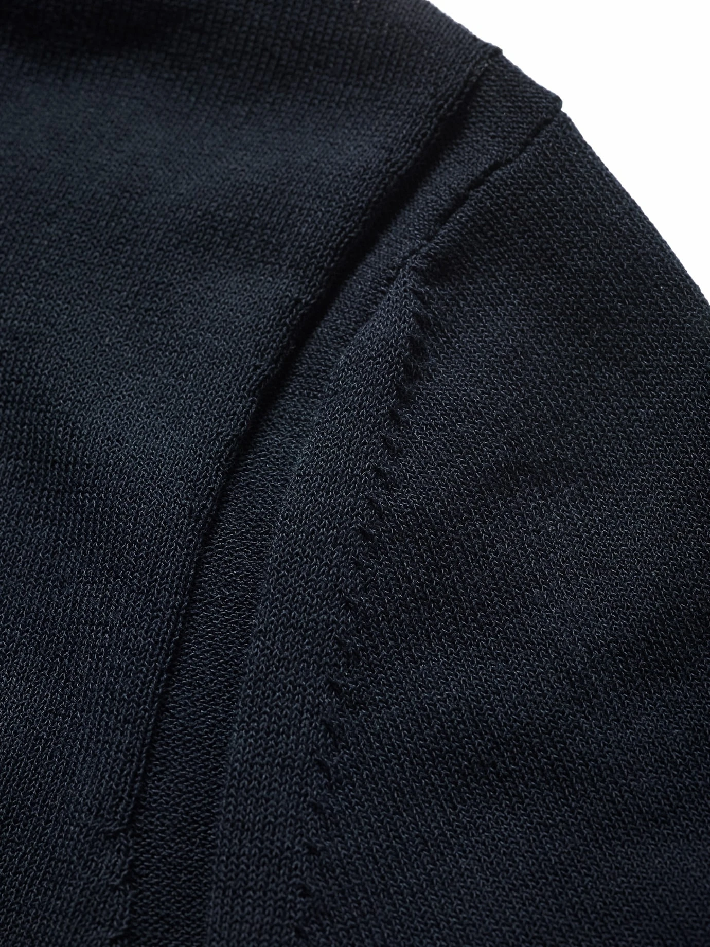 Schaut aus wie beim guten Italiener. Stilsicher, mit der richtigen Noblesse und Leichtigkeit, all diese Dinge treffen auf diesen Pullover zu. Gestrickt in Italien aus einem sehr feinen Garn (in 14 Gauge), durch die hohe Teilung der Maschen entsteht ein luxuriöser Griff. Schmiegt sich unbedarft an Ihre Haut. Und macht eine wirklich gute Figur auch unter Anzugsakkos. Edel aber auch solo zur Chino, passt einfach in die Kategorie lockere Alternative zum Hemd.