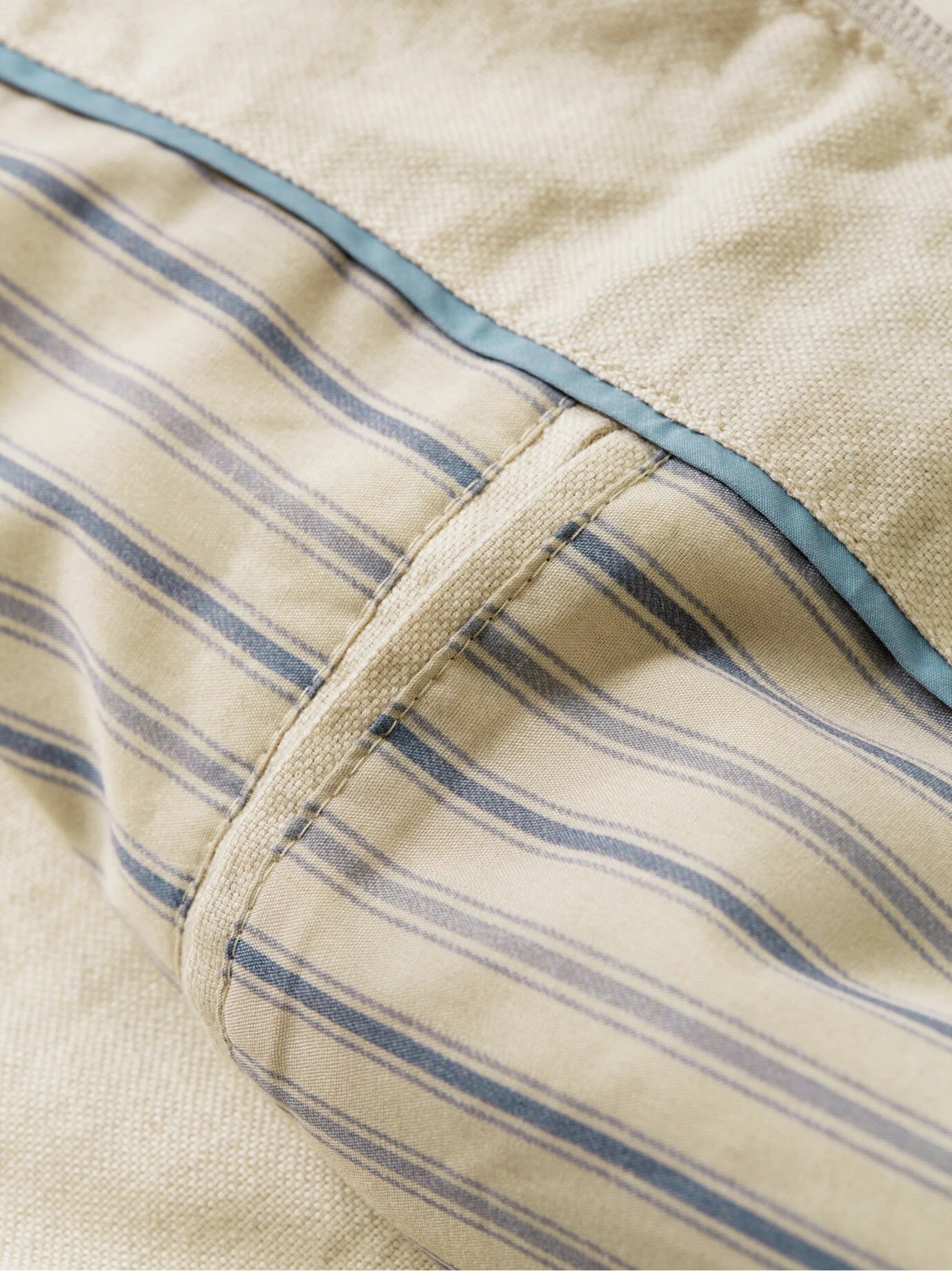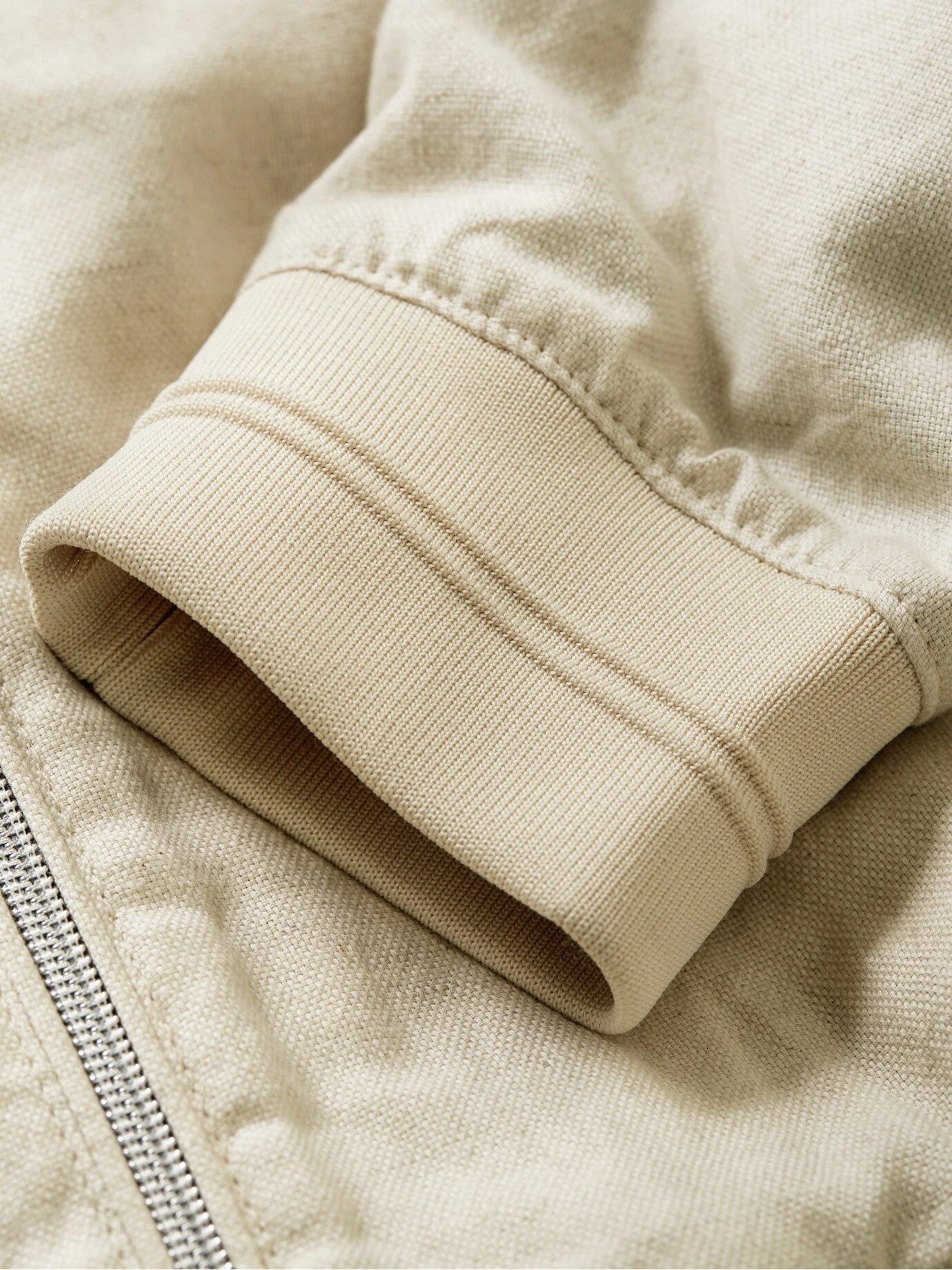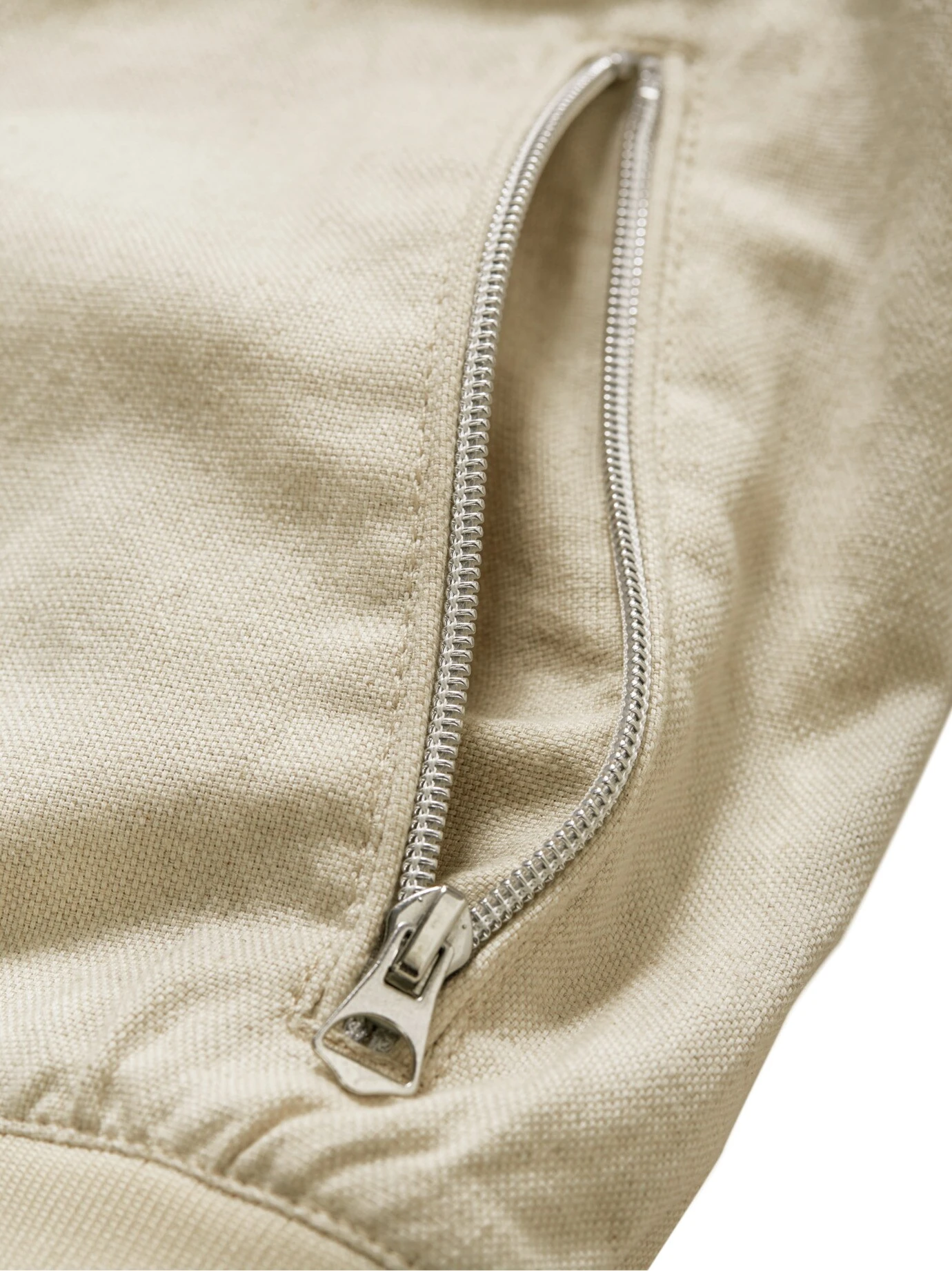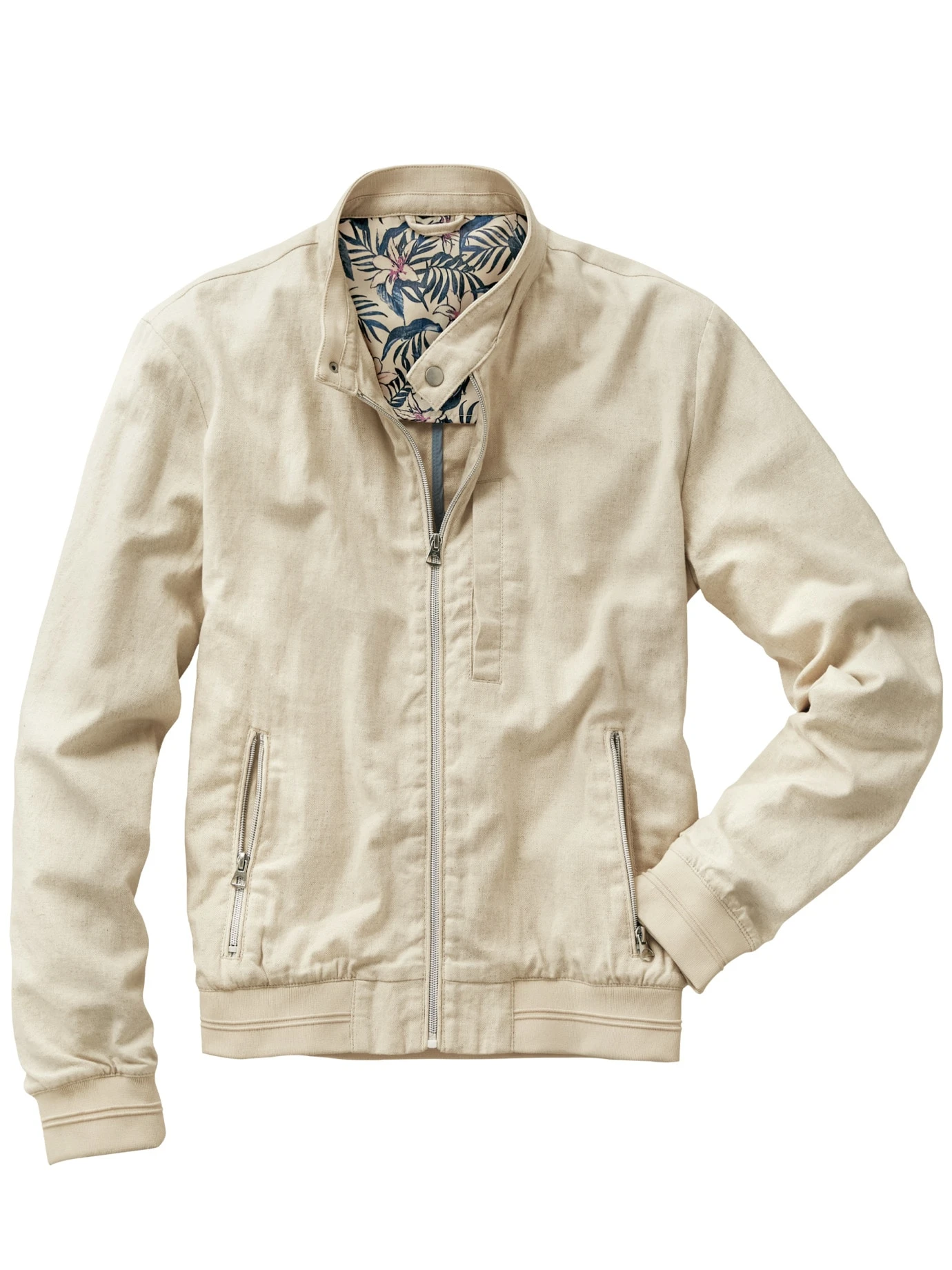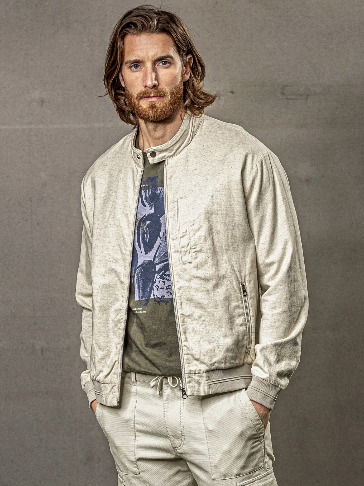 Eine Ode an die Hitze. Seine Farbe natürlich (und verzeiht damit den Staub heißer Straßen), sein Stoff sommererprobt. Die Materialmischung aus Baumwolle und Leinen liegt leicht und luftig auf der Haut und knittert nicht so schnell wie eine Jacke aus reinem Leinen. Der knackig-kurze Schnitt betont die Hüftknochen, lässig hochgeschobene Ärmel kurbeln die Vitamin D-Produktion mittels Sonnenlicht an. Wenn Sie den Blouson im Strandcafé über den Stuhl werfen, wird der coole Palmenprint im Innenkragen sichtbar. Lässig mit Shirt darunter, zur Jeans oder Chino, je nach Wetterlage Sandalen oder Sneaker.