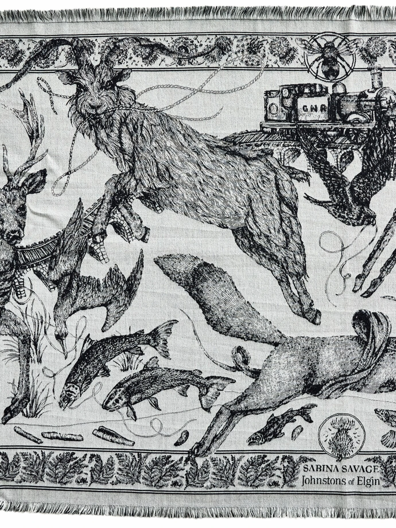 Überdimensionales Prachtstück. Anlässlich des 225-jährigen Firmenjubiläums kreiert Johnstons of Elgin1797 gemeinsam mit der englischen Designerin Sabina Savage diesen Schal. Das Muster gleicht einem viktorianischen Wandteppich. Alles handgezeichnet, alles Geschichte von Johnstons of Elgin. Begonnen vom Fluss Lossie, an dem alles begann, über Vikunja, der Kaschmirziehe bis hin zum Big Ben. Statt bedruckt aufwendig eingewebt. In nichts weniger als hochwertiges Kaschmir samt Seide. Eine Beschreibung würde diesem Kunstwerk nicht gerecht.