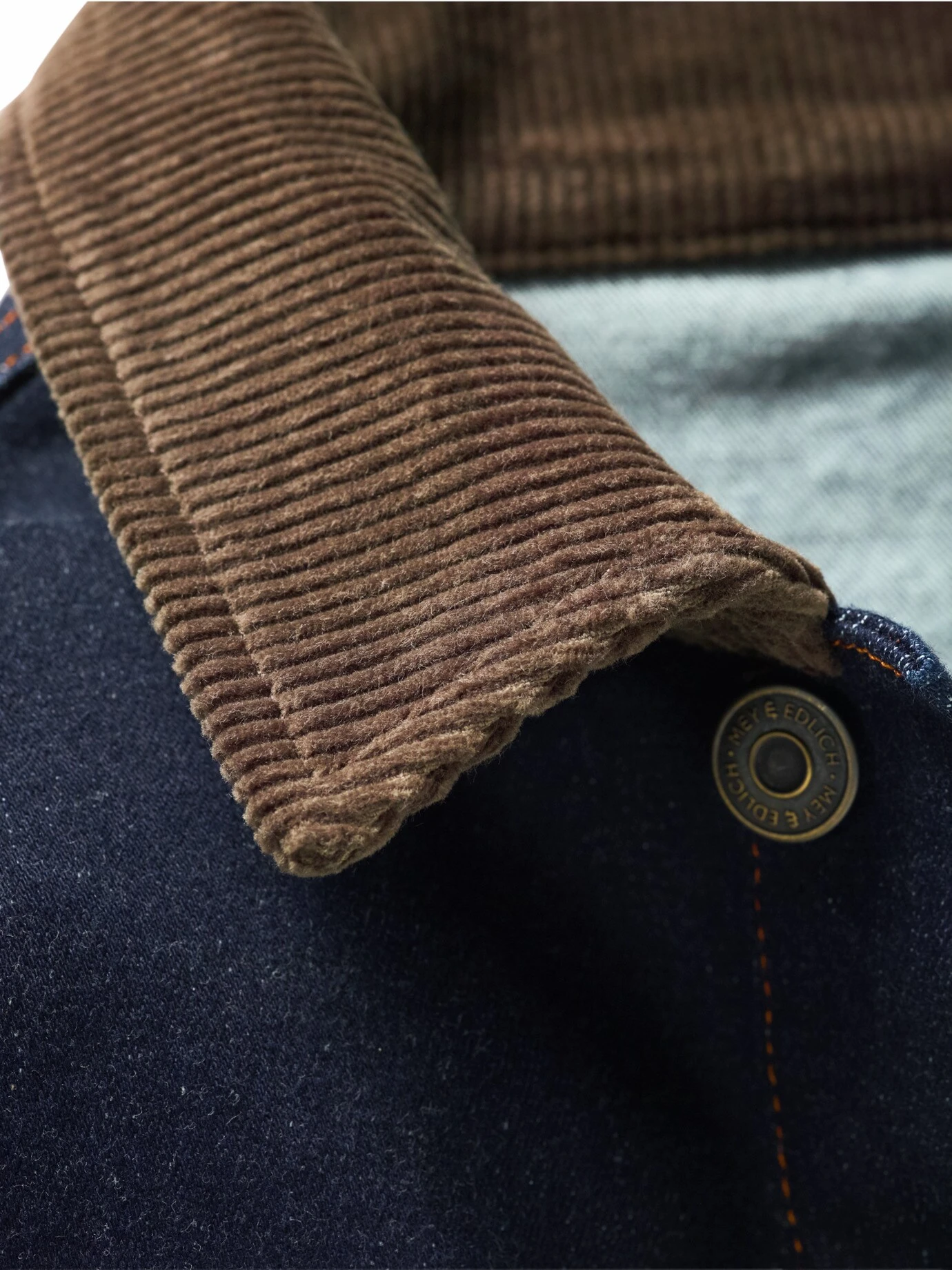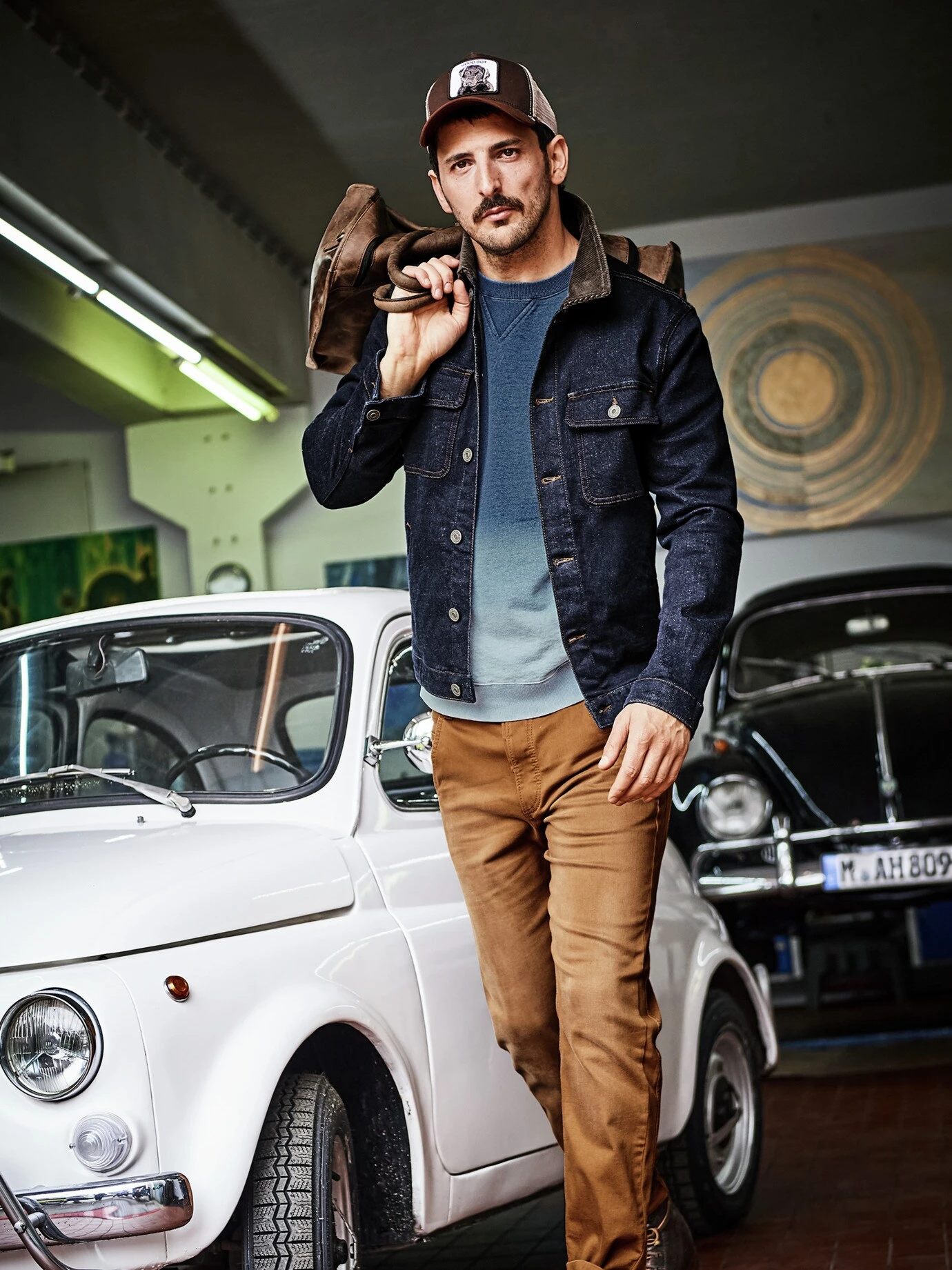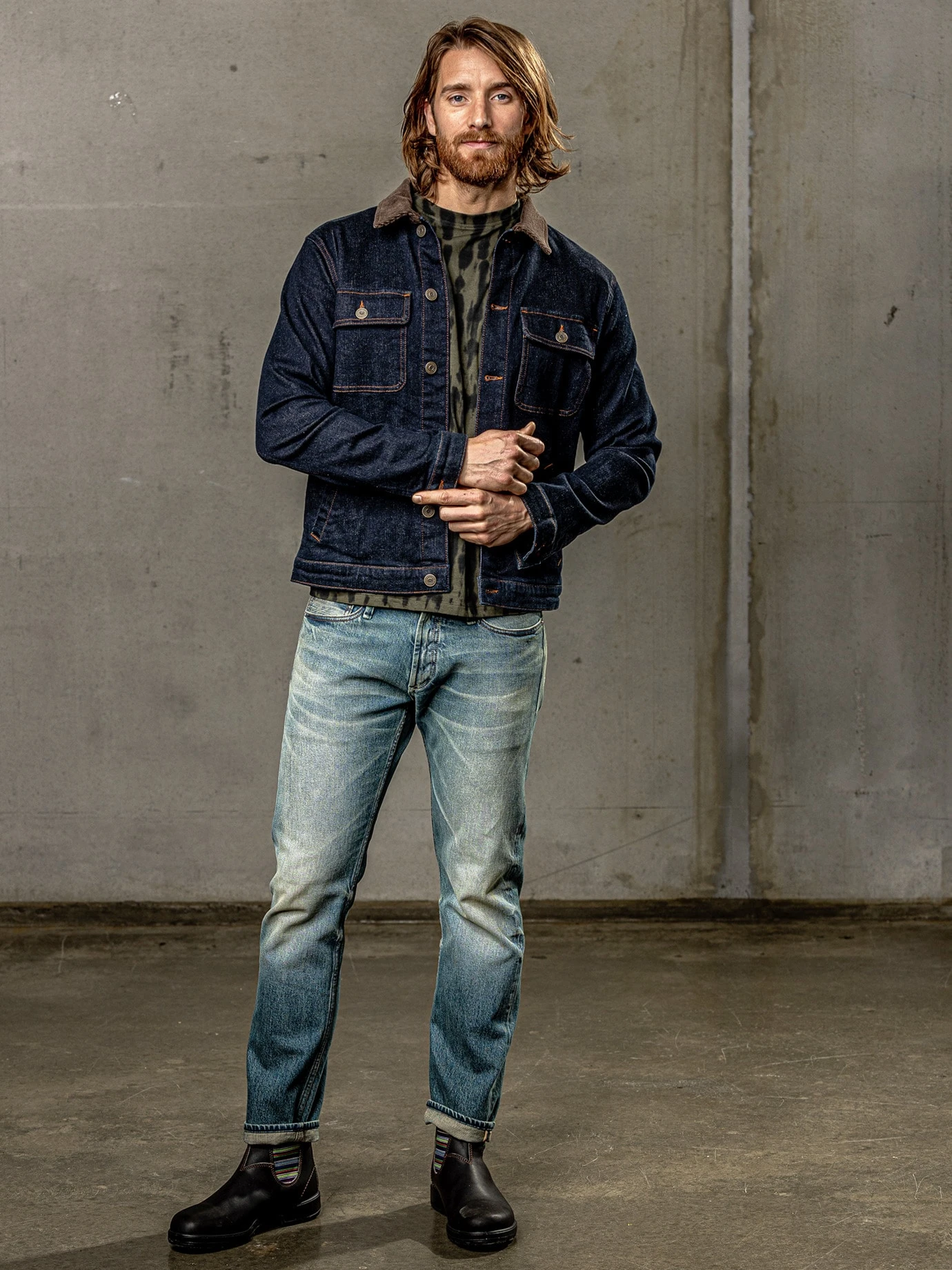 1.000 gute Gründe sprechen für diese Jeansjacke. Hier die Top Five. 1. Das tiefe, wie frisch aufgesprühte Blau wurde ohne Bleichmittel nur kalt gespült. 2. Die weiche Bio-Baumwolle für das gute Gewissen, der Schuss Elasthan sorgt für die Beweglichkeit. 3. Der workermäßige, dem Herbstwind trotzende Cordkragen. 4. Der gradlinige, klassische Schnitt. 5. Die unendlichen Pulli-Sweatshirt-kernige-Hose-Sneakers-Kombinationsmöglichkeiten.