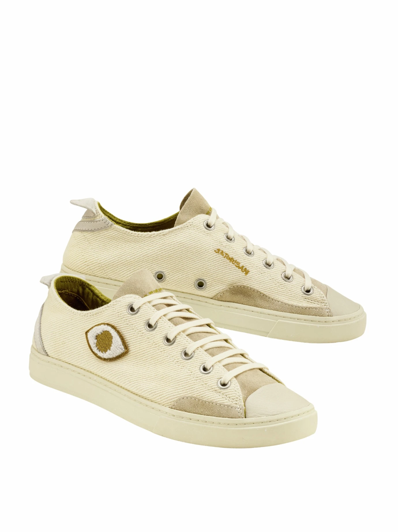 Über diese Sneaker wacht das Auge von Satorisan. Zumindest im übertragenen Sinne – das Herzauge symbolisiert das japanische Koto, das die Emotion über alles stellt. Vernäht auf strapazierfähige Baumwolle, die mit natürlichen Farbstoffen eingefärbt und anschließend in kleinen handgefertigten Trommeln gewaschen wird, bis der Vintage-Effekt authentisch ist. Sorgt obendrein für ein angenehmes Fußklima.