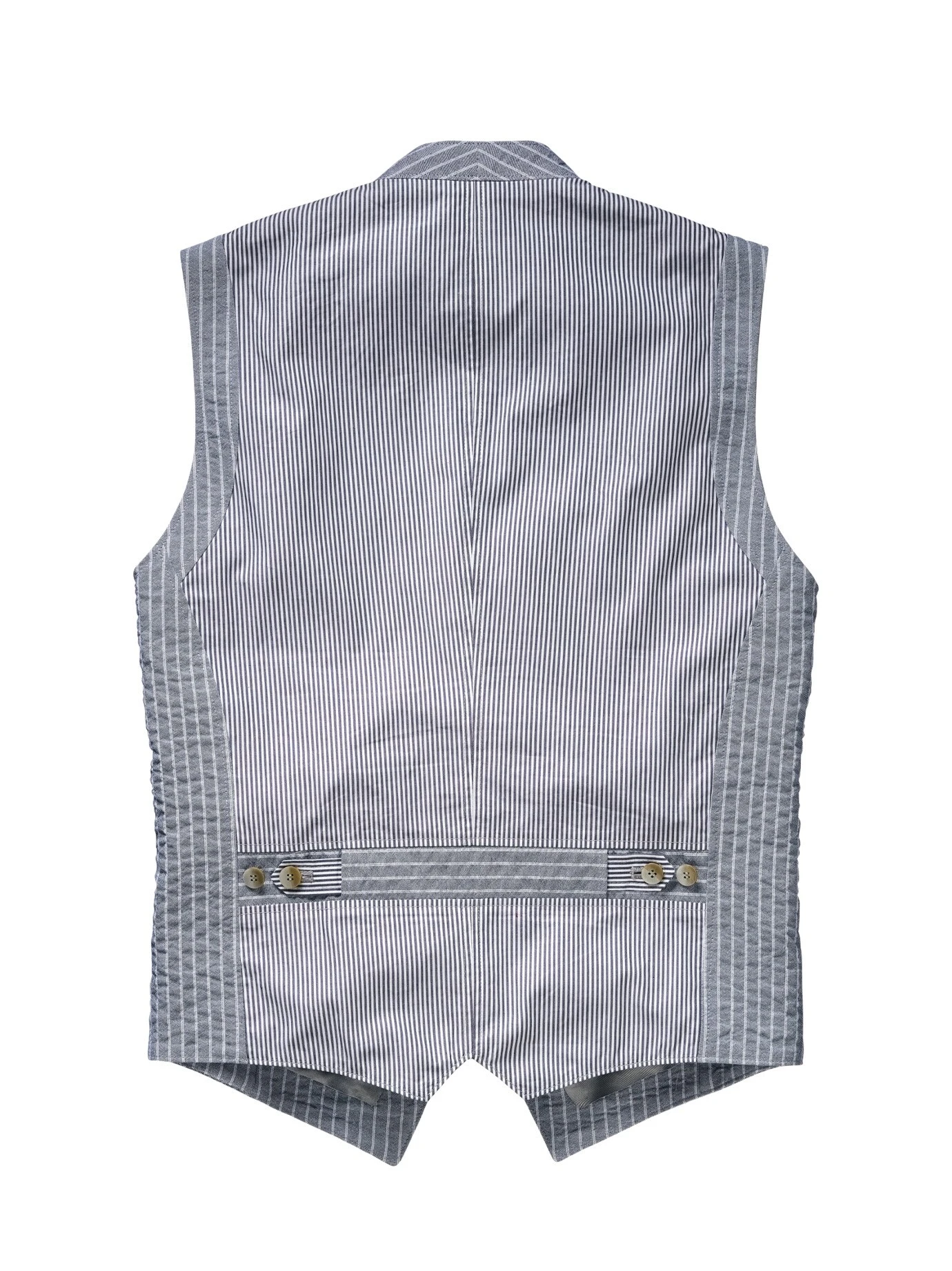 Verleiht Spannung. Doris Hartwich arbeitet die Weste aus Seersucker, jenem Stoff mit dreidimensionaler Optik, bei der jeder Faden einer anderen Spannung unterliegt. Im Ergebnis krisselig und sehr luftig. Die Weste tragen Sie an guten Sommertagen zu hellen oder blauen Hosen und verzichten dank des stoffgleichen Rückens auf Sakkoverstärkung. Besondere Aufmerksamkeit legt Doris Hartwich auf die Details: die rechtwinklig zueinander liegenden Streifen, die dezenten Taschen, die verschlankenden Teilungsnähte, der schmale Schalkragen und die spitz zulaufenden Kanten.