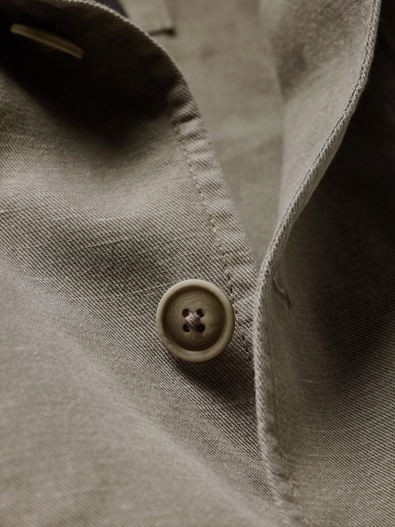 Die abendliche Ablöse fürs Casualsakko. Stilistisch stand es zumindest hierfür Pate, Sie erkennen es am geteilten Ärmel, dem runden Abstich am Saum und dem Kragen, der – wenn Sie wollen – zum Revers abfällt. Stilistisch liefert es den Spagat zwischen halb Hemd und halb Jacke, mit dem Hauch von Zupackermentalität. Ohne Taillierung fällt es modisch gerade, der Baumwoll-Leinen-Stoff stammt vom italienischen Weber Bonomi. Wird gern zu T-Shirt, Chino und Sneakern getragen, geschlossen oder offen.